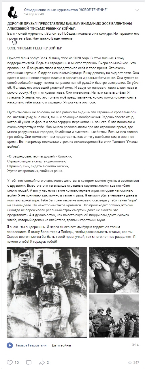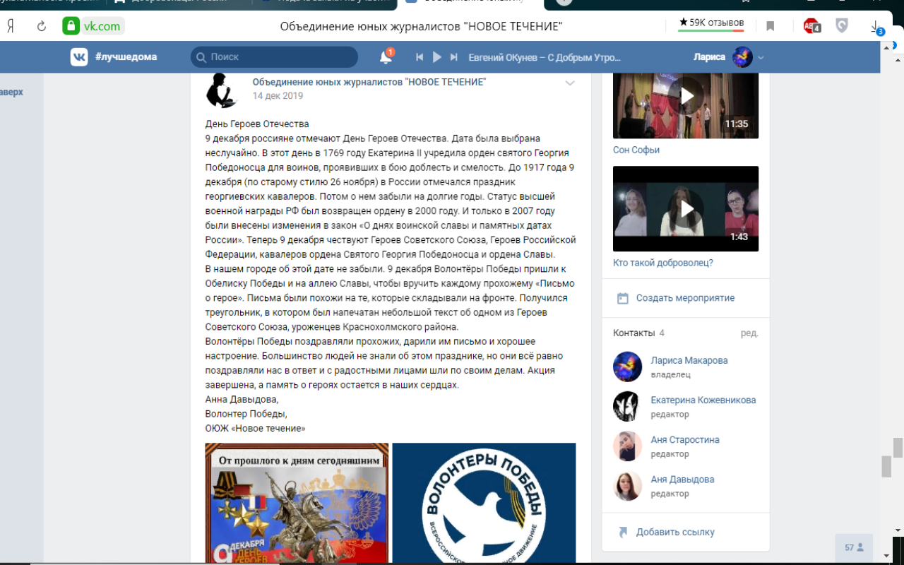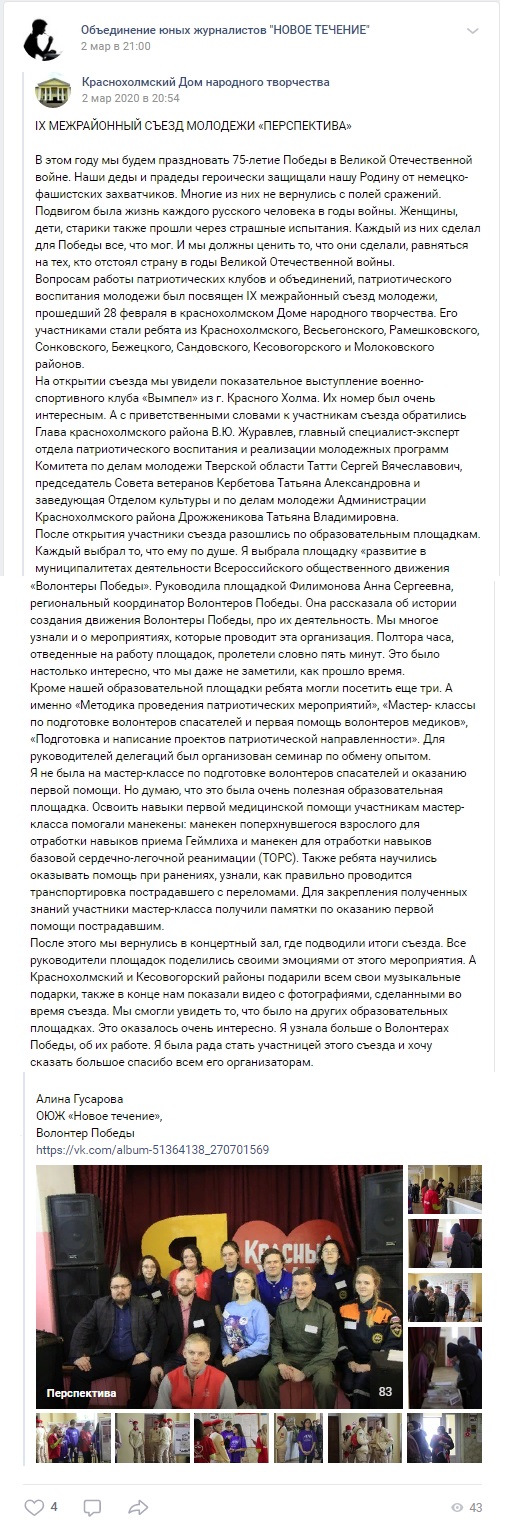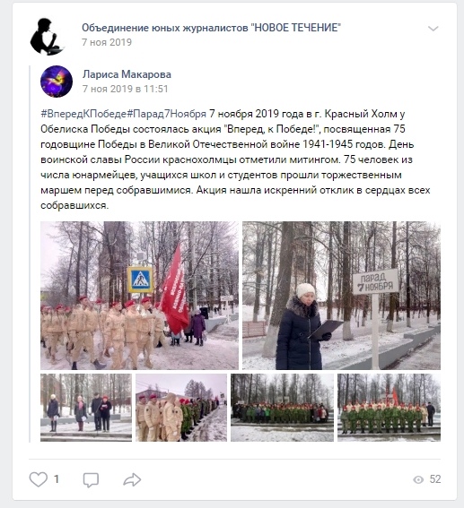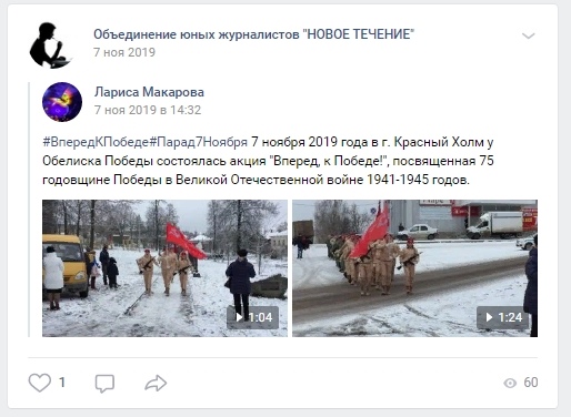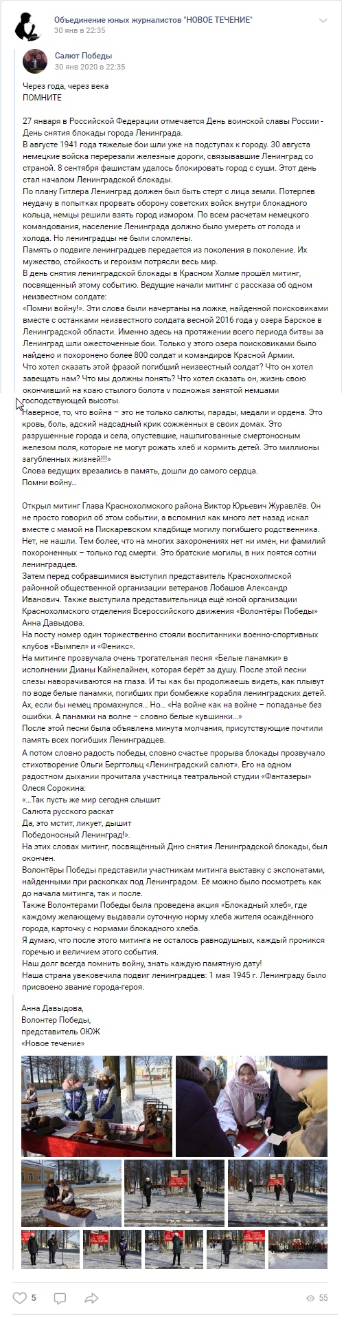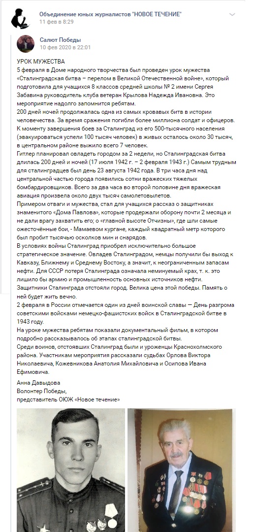 Кто такой патриот? На этот вопрос в современном обществе тоже ответит не каждый. А ведь любовь к своей Родине, своему краю, городу, селу, память о прошлом и готовность жить и трудиться на благо своего народа и делают человека патриотом. А чтобы все это икрене принять надо увидеть или хотя бы представить дерево, истерзанное снарядами и пулями под Сталинградом, подержать в руках кусочек блокадного хлеба, зажмурить глаза от вида полыхающей в огне Хатыни. Проект "Салют Победы" был создан Краснохолмским отделением Всероссийского общественного движения "Волонтеры Победы"совместно с МБОУ "Краснохолмская средняя общеобразовательная школа № 2" им. С.Забавина, чтобы в самых различных формах, от массовых мероприятий до интернет - акций, рассказать людям и, прежде всего, молодому поколению историческую правду о Великой Отечественной войне. "Салют Победы" добровольческим проектом, а значит дает возможность всем желающим стать не только участниками, а еще и организаторами акций и мероприятий. Первым нашим мероприятием в рамках проекта стала акция "Вперед, к Победе!" в честь 75-летия Победы в Великой Отечественной войне 1941-1945 гг. Акция прошла по всей стране 7 ноября 2019 года. В нашем родном Красном Холме мы провели ее при поддержке юнармейского движения города и районного совета ветеранов. 27 января была проведена акция "Блокадный хлеб" и митинг, посвященные дню полного снятия блокады Ленинграда. Вопросам работы патриотических клубов и объединений, патриотического воспитания молодежи был посвящен IX межрайонный съезд молодежи, прошедший 28 февраля в краснохолмском Доме народного творчества. Его участниками стали ребята из Краснохолмского, Весьегонского, Рамешковского, Сонковского, Бежецкого, Сандовского, Кесовогорского и Молоковского районов Тверской области. Конечно же среди участников съезда были и ребята, реализующие проект "Салют Победы". Участники проекта уделяют большое внимание саморазвитию, участвуют в доброльческих форумах регионального уровня, обучаются на курсах на платформе "Университет добро рф". В январе 2020 года в социальной сети Вконтакте была создана группа "Салют Победы". В интернет пространстве мы проводим акцию "Сохраним историю вместе". Здесь жители Краснохолмского района могут размещать фотографии своих родственников - фронтовиков, тружеников тыла, детей войны, и истрии их военных судеб. Число участников группы ежедневно увеличивается. Мы думаем, что в наши мероприятия будет вовлечено большинство жителей краснохолмского района. В наших планах проведение акций и мероприятий, посвященных празднованию Дня Победы. Сейчас в ситуации распространения коронавируса, возможно многие мероприятия пройдут при помощи сети Интернет. В любом случае обязательно состоится акция "Георгиевская ленточка" и "Бессмертный полк", а в течении года состоятся уроки мужества, тематические программы, торжественные линейки, митинги, квест-игры, викторины и т.д. Наши волонтеры дойдут до каждого класса, и даже до детских садов. Мы будем не только рассказывать и показывать фильмы и презентации. Еще мы научим складывать солдатские письма - треугольники, заворачивать солдатские портянки, расскажем как правильно носить георгиевские ленточки. 22 июня в 4 часа утра мы и все, кто захочет нас поддержать, зажжем свечи памяти у Обелиска Победы в городском с