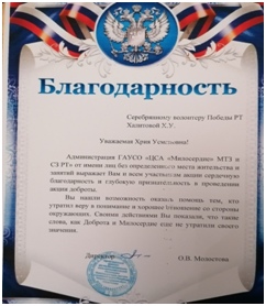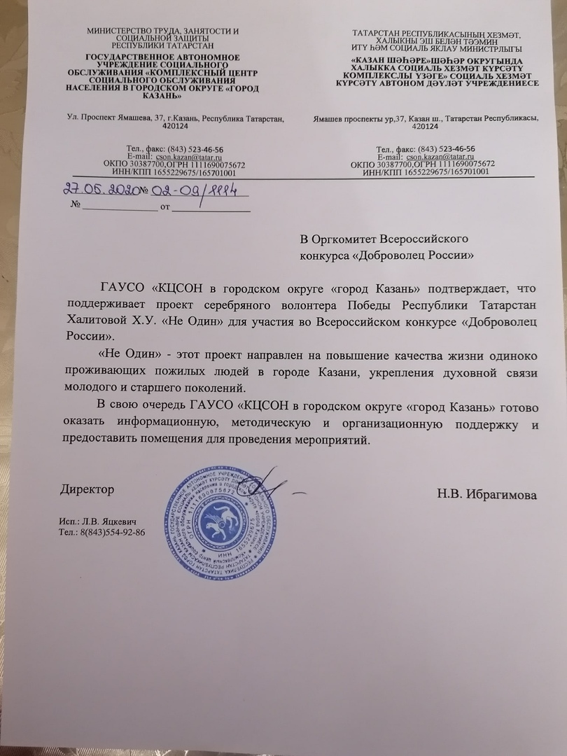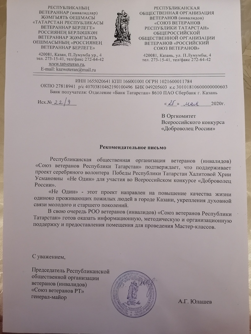 Хрия Халитова — 60-летняя пенсионерка из Татарстана. Она — серебряный волонтёр, которому довелось встретить много одиноких пожилых людей. Женщина решила оказывать регулярную адресную помощь, окружать одиноких людей заботой и вниманием. Так в 2019 году появился проект «Не Один». Одиночество в старости — это проблема, которую можно и нужно исправить, и иногда для этого достаточно простого общения. В команду вошли не только серебряные волонтёры, но и молодые люди 14-35 лет. За год благополучателями проекта стали более 120 человек. Было проведено более 60 мероприятий: поздравительных концертов, творческих занятий, праздничных встреч. Иногда волонтёры приезжали просто поиграть со стариками в шашки и шахматы. Также команда помогала в быту: собирала урожай на дачах, убиралась в квартирах, ремонтировала технику. Волонтёры проводят творческие занятия, на которых участники изготавливают поделки не только для себя, но и для передачи в дар в детские дома, приюты и благотворительные ярмарки. Так пожилые люди снова чувствуют себя нужными. Эффект проекта нельзя недооценивать. Добровольцы «Не Один» изменили уже не одну жизнь. На их глазах одна из пенсионерок обрела второе дыхание: теперь она сама стала волонтёром проекта, участвует в разных мероприятиях и помогает другим людям. ПРОЕКТ ВО ВРЕМЯ COVID-19: Серебряные волонтёры готовили и пекли пирожки, которые потом молодые волонтёры развозили в ланчбоксах пожилым людям. ЗАЧЕМ НУЖЕН ГРАНТ: На новое оборудование для мероприятий, на инвентарь для мастер-классов.