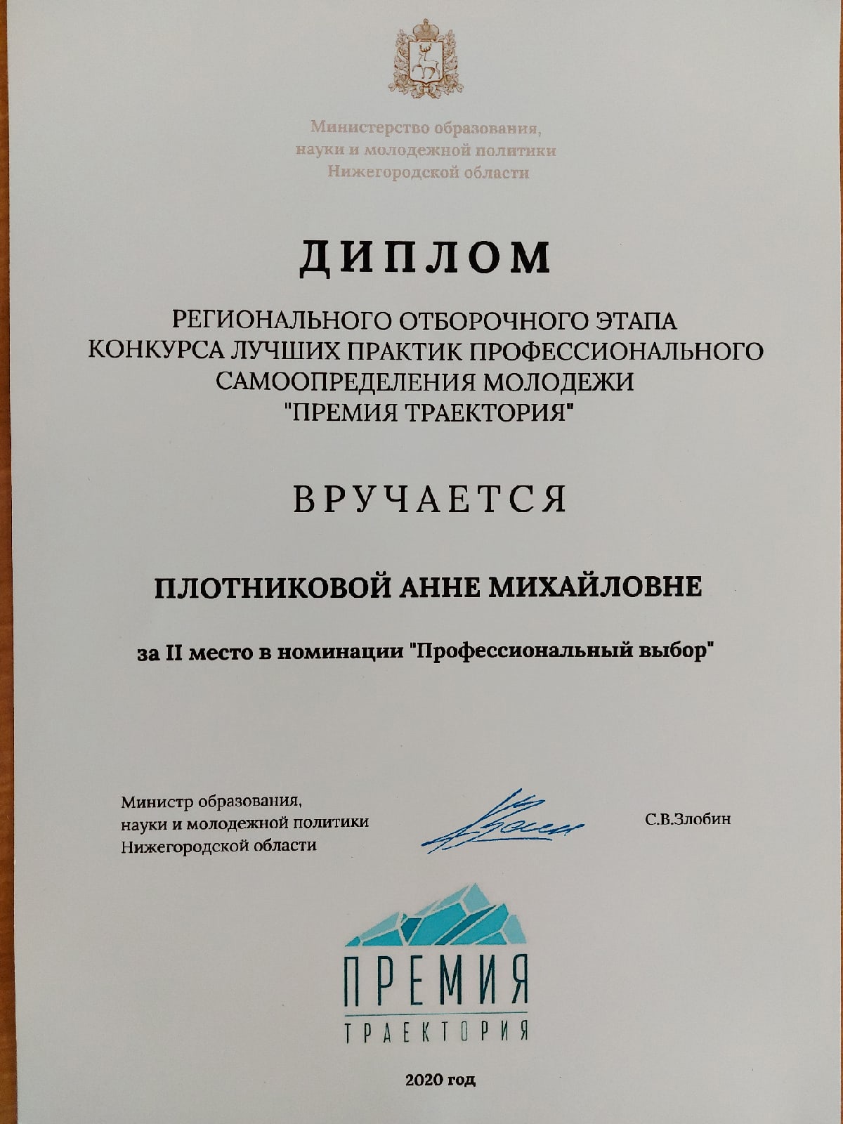 За период реализации проекта определились с будущей профессией - 4%, с сферой деятельности - 28%; ЦА проекта познакомилась с профессиями г. Дзержинск, попробовала себя в различных сферах деятельности; 10 волонтеров были обучены основам интервьюирования, съемки, монтажа видеороликов; 2 место на региональном этапе конкурса лучших профориентационных практик "Премия траектория - 2020"; представление опыта реализации проекта на форуме профилактических волонтеров в г.Пермь, 2021; представление опыта реализации проекта на вебинаре-практикуме "Интерактивные методы профориентационной работы" с темой "Интеграция современных подходов к профориентационной работе на примере проекта "PROГИД"; победа в грантовом конкурсе от Росмолодежи на форуме "Траектория смыслов-2020" с проектом; представление опыта реализации проекта и участия в грантовых конкурсах на классных встречах РДШ.