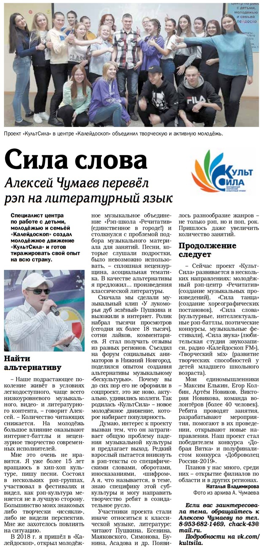 Отличительной чертой современного подрастающего поколения является предпочтение легкодоступного, чаще всего низко-культурного музыкального, видео и литературного контента. На и социальное развитие оказывают большое влияние такие низко-культурные, упрощенные проекты, как интернет баттлы (Версус, Слово СПб и т.д.) и нецензурное музыкальное творчество современных исполнителей, зачастую пропагандирующие антисоциальные шаблоны поведения. Музыкальные произведения культурной направленности были мало интересны для большей части современной молодежи (что показали опросы аудитории от 8 до 18 лет, посещающих мероприятия и объединения МКУ «Центр по работе с детьми, молодежью и семьей «Калейдоскоп»), до момента вовлечения их в культурный проект "Сила Песни"(прежнее название «КультСила.Перезагрузка»). На момент создания проекта, в 2019 году, целью было возродить интерес среди молодежи к качественному литературному и музыкальному контенту через создание новых творческих продуктов на основе литературных произведений (стихотворения, поэмы, проза и др.) классиков и современных авторов, в различных музыкальных жанрах (в том числе популярном среди молодежи жанре Рэп), и трансляция их на молодежную аудиторию посредством сети интернет, выступлений и мастер классов на открытых молодежных площадках. Основная целевая группа - дети, подростки и молодежь в возрасте от 8 до 18 лет. Проект успешно развивается с 2019 года, стал победителем регионального конкурса «Добрая Вятка» в 2019 году; полуфиналистом Всероссийского конкурса «Доброволец России 2019» (с названием «КультСила»); полуфиналистом Всероссийского конкурса «Доброволец России 2020» (с названием «КультСила.Перезагрузка»); победителем регионального конкурса молодежных социальных проектов в рамках проекта "Студенческий молодежный банк социальных инициатив (технология становления молодежи и развития местных сообществ) в 2020 году; победителем регионального конкурса социальных проектов «Молодежный банк» в 2020 году; победителем конкурса на соискание знака «Общественное признание»; стад лауреатов международного конкурса «Мир начинается с меня», победителем городского конкурса «Наш дом – мой Киров» в 2021 году.