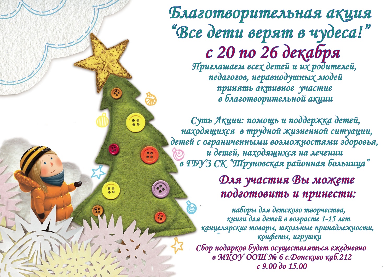 Цель Проекта: сформировать положительное общественное мнение, чувство милосердия и отзывчивости к детям, находящимся в трудной жизненной ситуации, детям с ограниченными возможностями здоровья, а также детям, находящимся на лечении в больнице не менее чем у 60 % школьников через внедрение интерактивных форм в образовательный процесс школы и создание в школе среды для совместной досуговой деятельности.