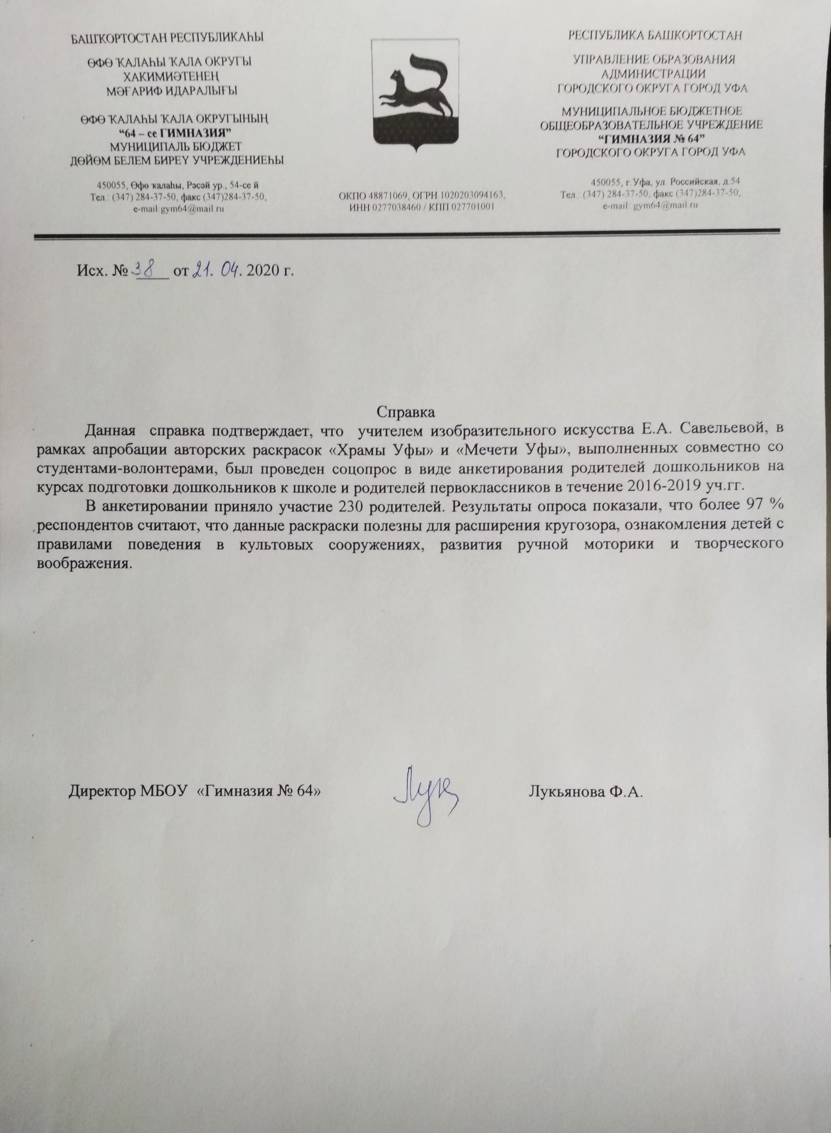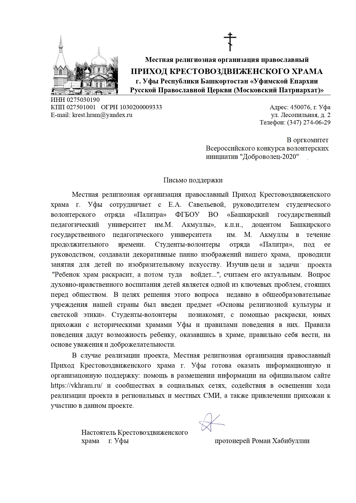В 2014 г. в Уфе руководителем проекта Савельевой Екатериной совместно со студентами-волонтерами отряда «Палитра» разработаны книжки-раскраски «Храмы Уфы» и «Мечети Уфы» для детей 5-8 лет (ЦА - воспитанники детских садов, коррекционных и воскресных школ, маленькие пациенты, дети с ОВЗ), которые помогают соприкоснуться с традиционными религиозными конфессиями, культовыми сооружениями и правилами поведения в них. На сегодняшний день обучено более 500 детей. В 2019 г. проект увеличил свои масштабы: во время стажировки в сфере гражданской активности в г. Санкт-Петербург, проект был поддержан руководителями Региональных центров «серебряного» волонтерства регионов РФ и открыл серию раскрасок «Храмы России: волонтеры – детям». Региональные центры РФ высылают фотографии местных храмов студентам-волонтерам отряда «Палитра» БГПУ им. М. Акмуллы. На основе присланных фото волонтеры рисуют контурные и цветные изображения храмов, при помощи художника и дизайнера. Выпускается тираж раскрасок, который отправляется в регионы. Волонтеры отряда «Палитра» БГПУ им.М. Акмуллы совместно с руководителм проекта проводят обучение "серебряных" волонтеров и волонтеров разных возрастов методике проведения занятий через вебинары. Реализация проекта планируется силами волонтеров разных возрастов из различных 8 регионов РФ: рег. центры «серебряного» волонтерства: Уфа (Е.Савельева), Омская область (Л.Соколова), Курская область (Т.Басова), Волгоградская область (В.Лазарева), Казанская группа серебряных волонтеров Татарстана (О.Спиридонова). Также принимают участие «серебряные» волонтеры Нижегородской региональной благотворительной общественной организации «Забота» (под рук. зам. дир. А.Поповой (г. Н.Новгород), АНО «Центр социального обслуживания «Родные люди» (Приморский край), (под рук. Н.Кокоревой), Благотворительный фонд "Доброгорец" Карачаево-Черкесская республика (под рук. Е.Борисовой) с участием волонтеров всех возрастов, которые посетят ЦА, познакомят с раскраской и проведут занятие. Планируется обучить более 1500 детей. Планируется изготовление компьютерной игры и приложений для MacOS.