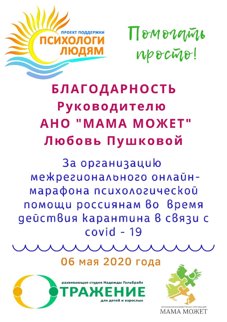 Безусловно, для обычных жителей, события, связанные с распространением коронавирусной инфекции, были неожиданны. У современного поколения опыта длительной замкнутой жизни не было. И хуже потери работы, порой, потеря жизненного ориентира. В начале апреля, сразу после объявления всеобщей изоляции, появилось огромное количество запросов на психологическую помощь. Многие говорили: я буду лучше спокойной, чем сытой. Объединив силы профессиональных психологов, технических специалистов, дизайнеров и журналистов, я с коллегами создала проект "Психологи-людям" - это бесплатная психологическая видео онлайн помощь людям в трудной жизненной ситуации в период борьбы с коронавирусной инфекцией. Проект объединил 15 специалистов из разных городов России. Каждый из психологов выступал с определенной темой - о ценности родовых связей, о том, как не беспокоиться, как найти общий язык с детьми, как радоваться новому дню, как пережить/принять перемены...В прямом эфире шли даже сеансы телесной терапии. Слушателем проекта мог стать абсолютно любой человек. Отзывы и слова благодарности мы получали из Калининграда, Иркутска, Архангельска, Москвы и других городов, даже из республики Беларусь. Эфиры проходили ежедневно, длительность - до 60 минут. Психолог-ведущий в процессе разговора, отвечал на вопросы в комментариях. А после каждой лекции все слушатели получали небольшой подарок - чек-лист с советами, аудиотренинг, медитацию. Проект показал, что когда трудно - можно объединиться и оказывать помощь несмотря на территориальные границы стран. Также этот проект позволил профессионально вырасти организаторам и психологам-ведущим, поскольку практически никогда ранее в регионе не было масштабной работы в онлайн. Этот проект был некоммерческим, но принес пользу тысячам людей, а также позволил отработать навыки координации волонтерской работой в условиях изоляции (онлайн работа). И наконец, всему учились по ходу и это привело к сплочению профессионального сообщества. После завершения эфиров - проект решено было продолжить и трансформировать в постоянные видео- консультации психологов, а также создать сборник подкастов по психологическим темам именно для случае, когда человек попадает в стресс и в ситуацию опасности, неизвестности по причинам, не зависящим от него. Особенно актуальным такой формат будет для жителей сельской местности, маленьких и удаленных городков, где есть проблема с оказанием психологической помощи. Проект поддержали СМИ Вологодской области: https://vologda.bezformata.com/listnews/psihologi-oblasti-obedinilis-chtobi/83188123/ , http://www.op35.ru/press-tsentr/anonsy/detail.php?ID=4828 . Для меня лично это был первый опыт работы как организатора именно онлайн. Я поняла, что даже в ситуации глобальных трудностей, люди хорошо отзываются на волонтерскую работу, особенно если искренне рассказать, почему это важно и стоит делать, пробовать, верить!