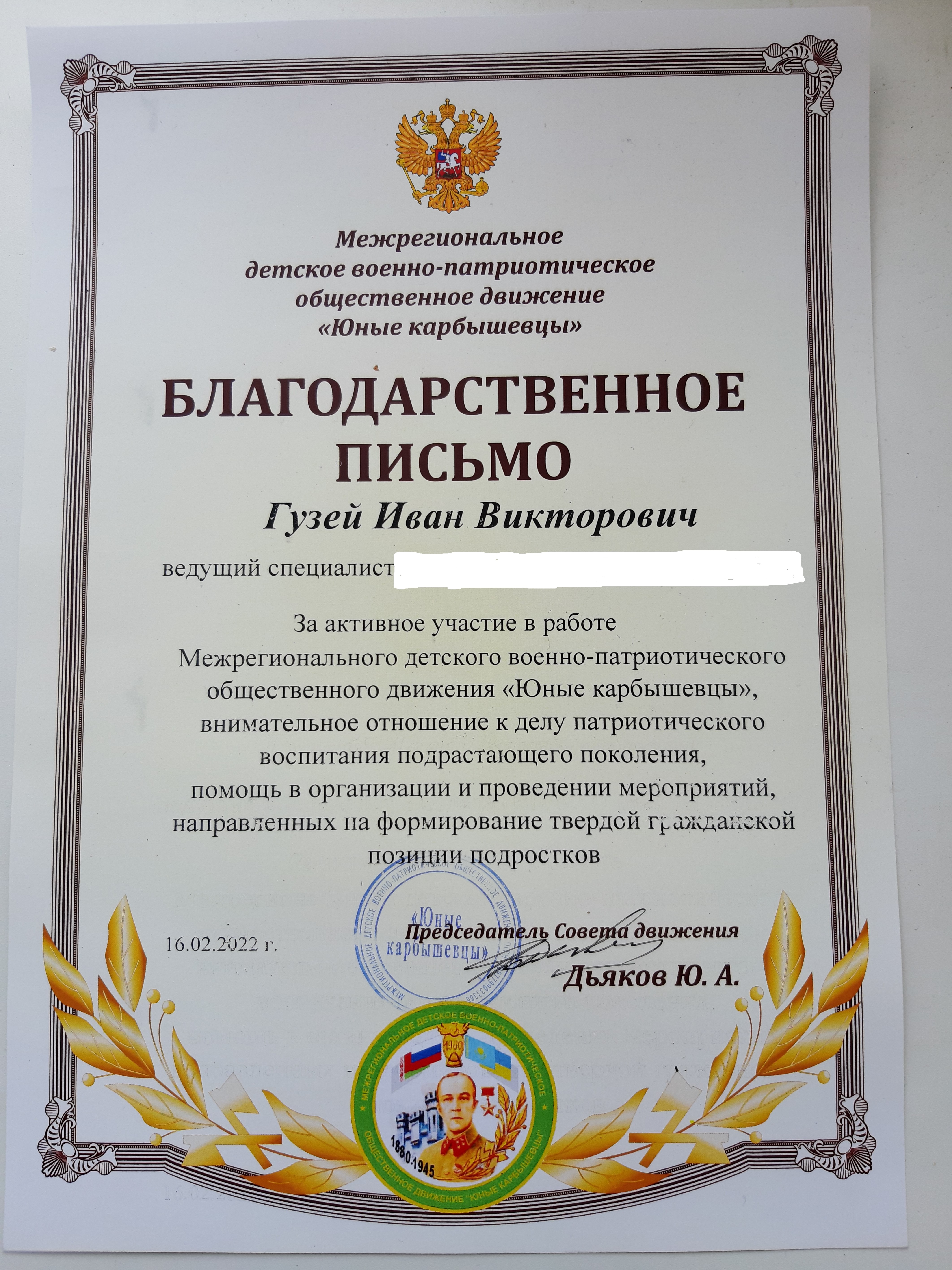 В 2024 году стал волонтером года по Московской области, в номинации Патриотическое волонтерство.