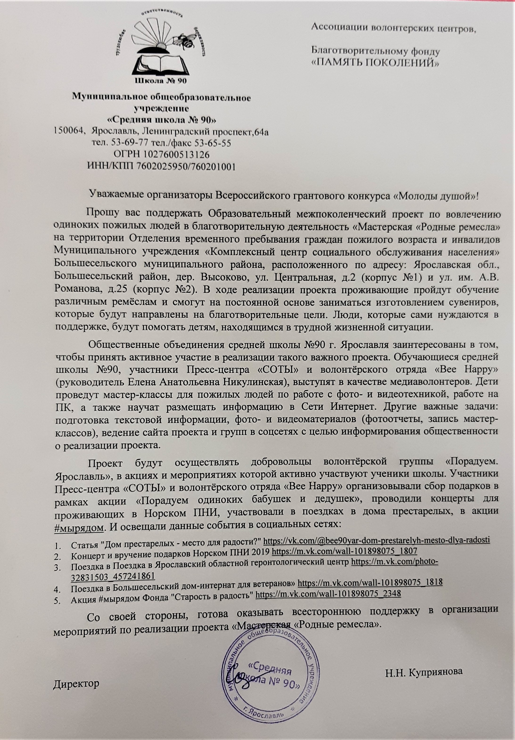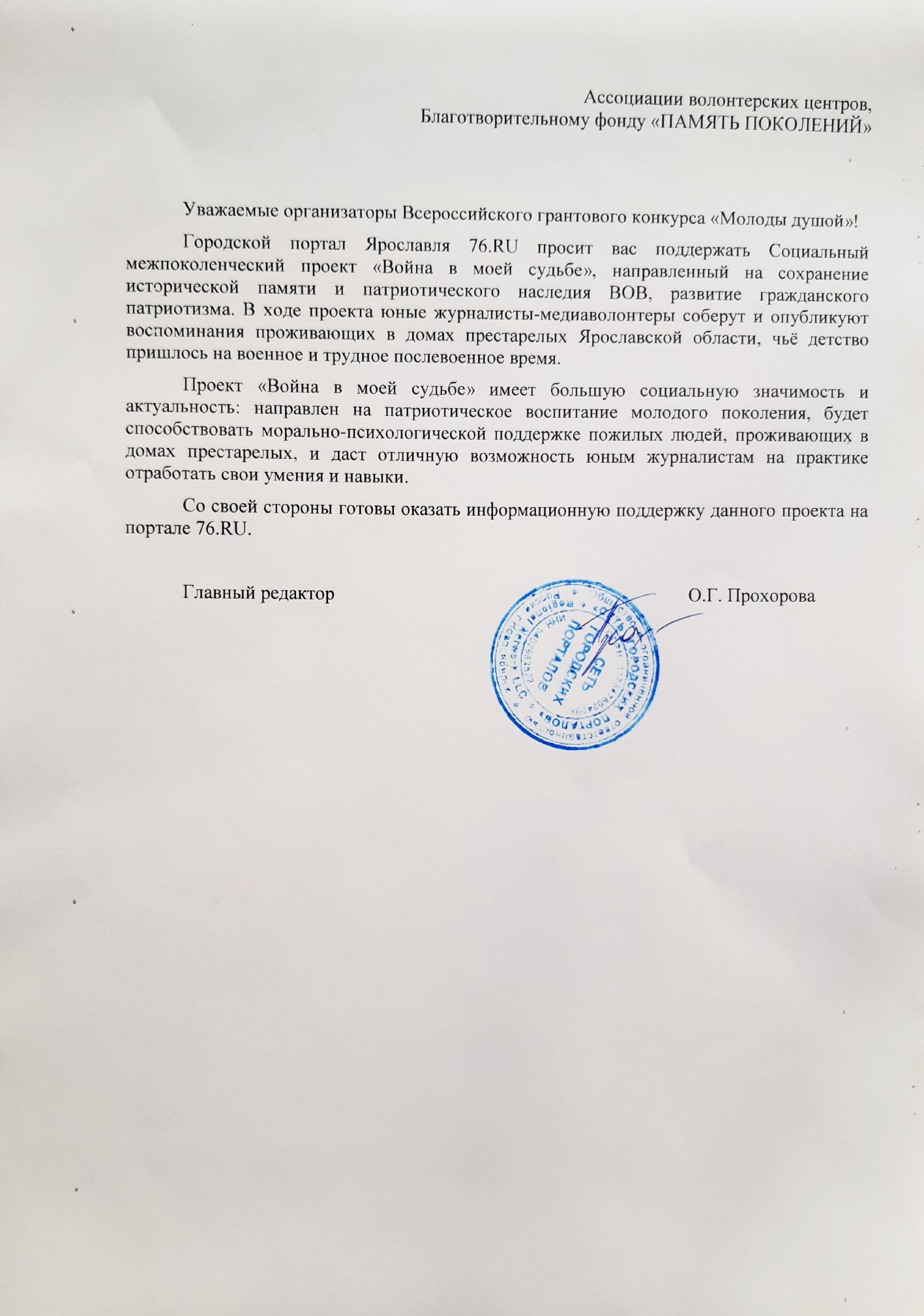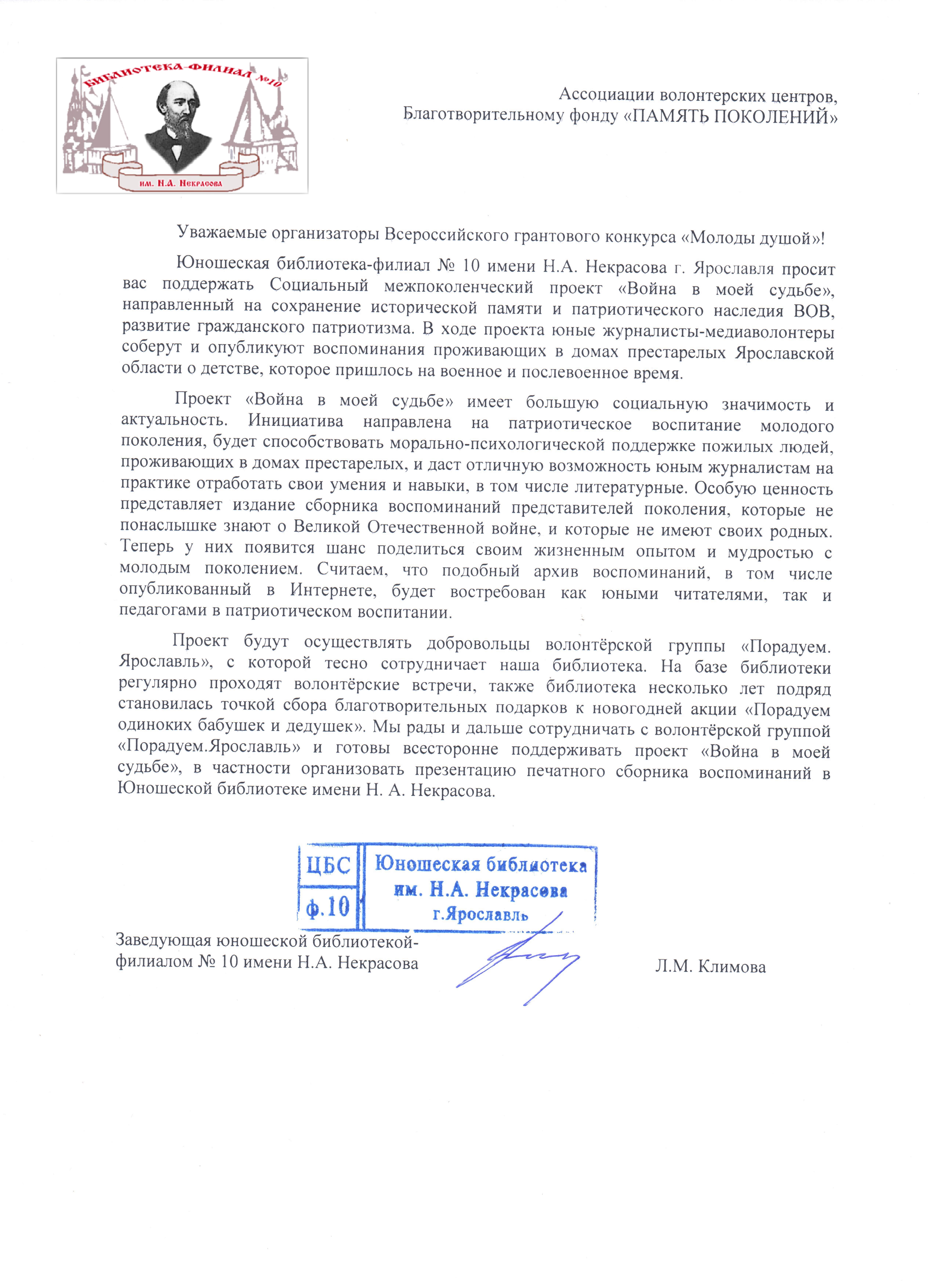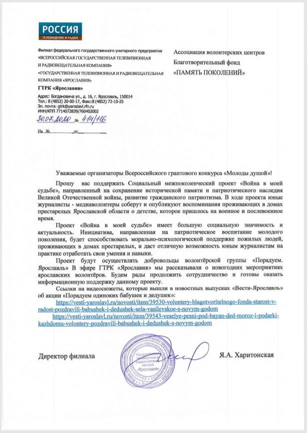 Количественные результаты Будет организована работа по сбору и публикации воспоминаний одиноких пожилых людей, детство которых пришлось на военное и послевоенное время. Волонтёры возьмут биографические интервью у 50 участников, чье детство прошло в годы войны и послевоенные годы. Также будут записаны воспоминания ветеранов войны и тыла. Будут организованы занятия по обучению волонтеров (4 занятия). Будут организованы поездки в дома-интернаты для записи воспоминаний (минимум 6 поездок) Будет собран мультимедийный архив воспоминаний «Война в моей жизни» (тексты, аудио-, видеозаписи, фотоархиы). Будет издан сборник воспоминаний «Война в моей судьбе», 200 экземпляров. Сборники воспоминаний будут подарены участникам акции, в школьные и детские библиотеки Ярославля и Ярославской области, в общественные организации, занимающиеся патриотической работой с молодежью. Будет создан сайт проекта, на котором будет размещён мультимедийный архив. Будут созданы группы в социальных сетях (ВКонтакте, Фейсбуке), которые будут информировать о ходе проекта и знакомить подписчиков с воспоминаниями участников. О ходе проекта будут информировать группы школы №90, Пресс-центра «СОТЫ» и волонтерского отряда Вконтакте. Будут проведены итоговые мероприятия – презентации книги в учреждениях и в Юношеской библиотеке. В реализации проекта примут участие 25 добровольцев, в том числе 15 школьников. Пресс-центр «СОТЫ» сможет улучшить материально-техническую базу и более эффективно выполнять функции по информированию общественности о социально-важных проектах и событиях.