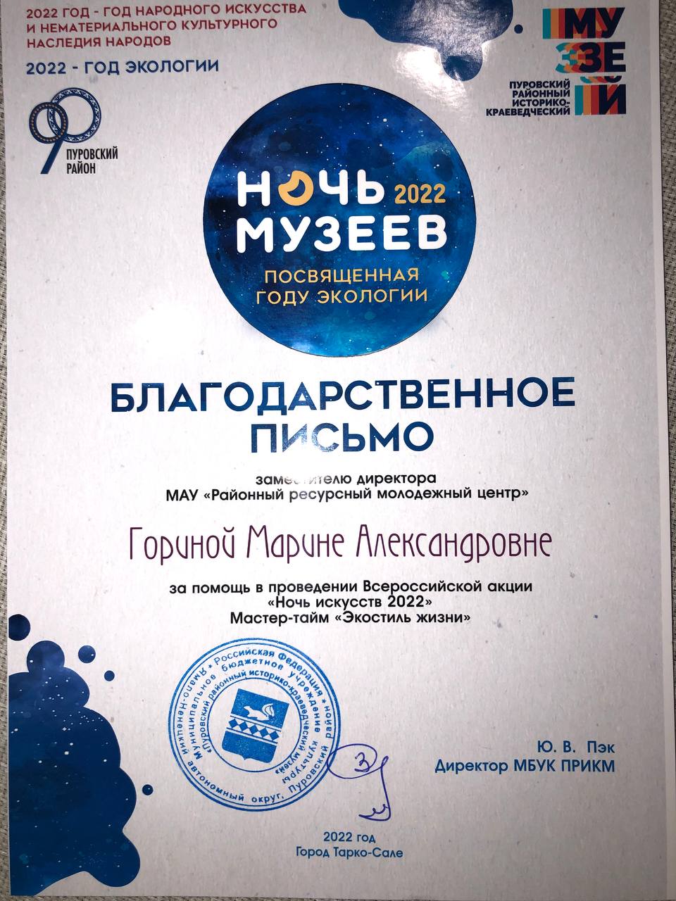 В 2022 году на проведено 9 акции по сбору пластика и макулатуры, 1 лекция в рамках мероприятия "Ночь музеев". А главный результат проекта - эффективная работа по формированию «экологического мышления». На сегодняшний момент с января 2023 года проведено 4 экологические акции по сбору вторсырья, проведена экологическая онлайн-смена в период зимних каникул для детей приюта Пермского края, с целью экологического просвещения. Полуфиналисты премии МЫВместе 2022 года. Участники окружного проекта "Чистый Ямал".