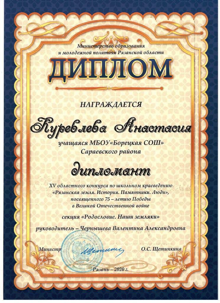 Экскурсия к памятнику председателя революционного комитета Сапожковской губернии Касмынина К.С. в селе Назарьево - исследовательская работа Куревлевой Анастасии, 1 место в районной краеведческой конференции «Сараевская земля. История. Памятники. Люди»;