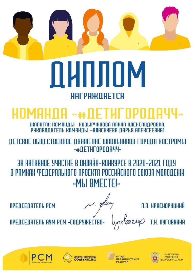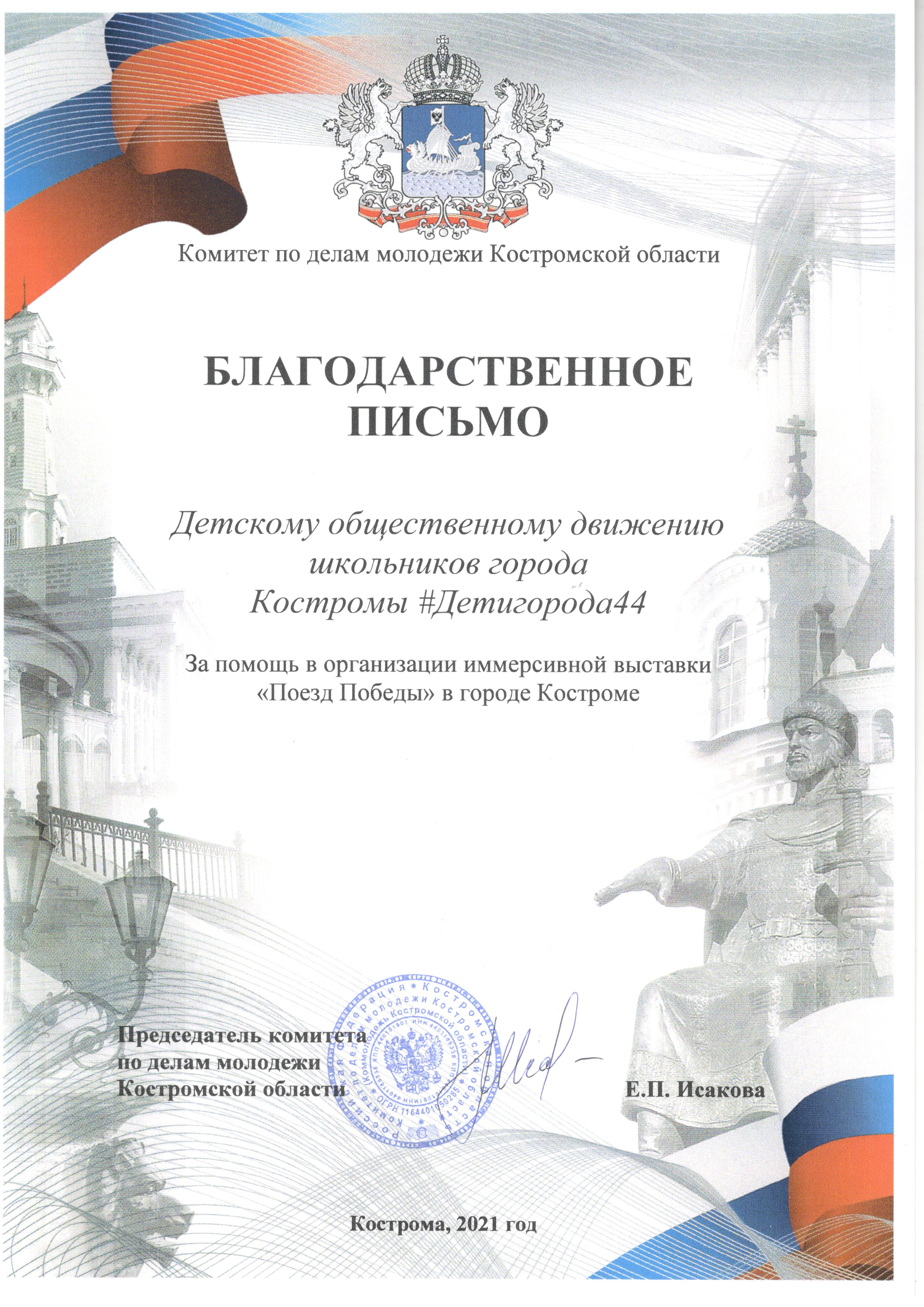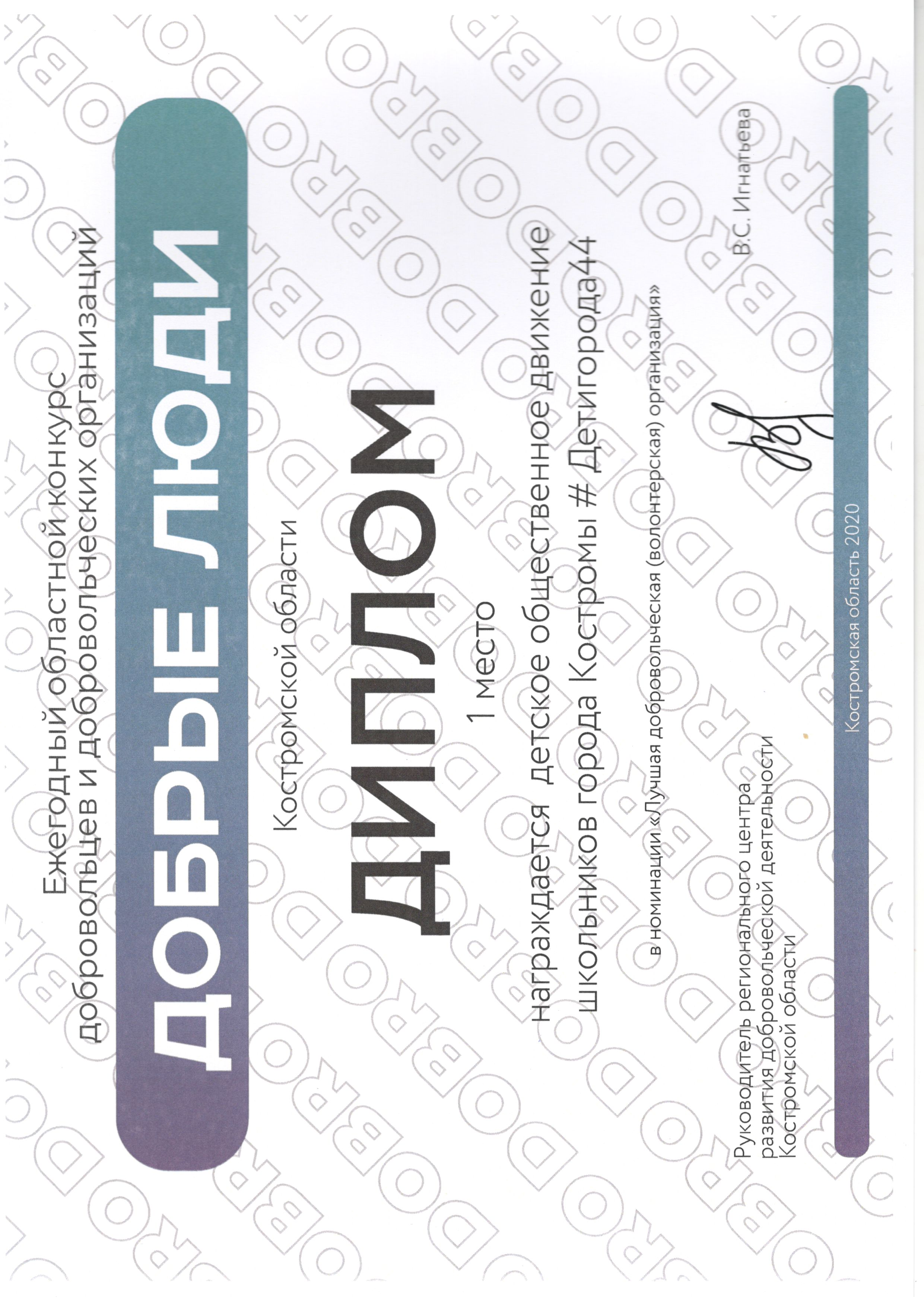 Детское общественное движение школьников города Костромы активно функционирует с 2019 года по следующим направлениям деятельности: волонтёрство, патриотизм, личностное развитие, ЗОЖ, безопасность и медиа. За три года деятельности участниками Движения стали более 3 500 школьников из 37 общеобразовательных учреждений города Костромы. Совет Движения представляет собой 80 активистов.