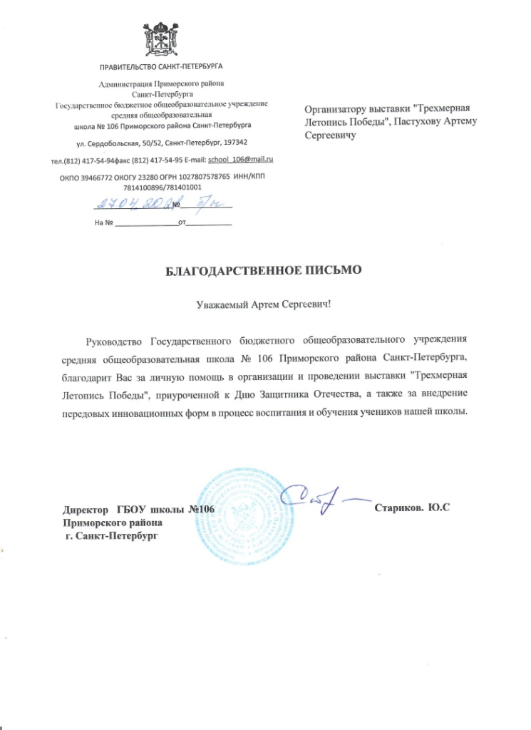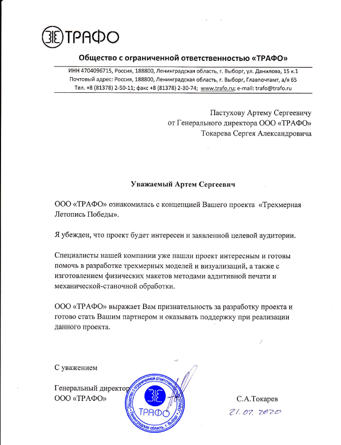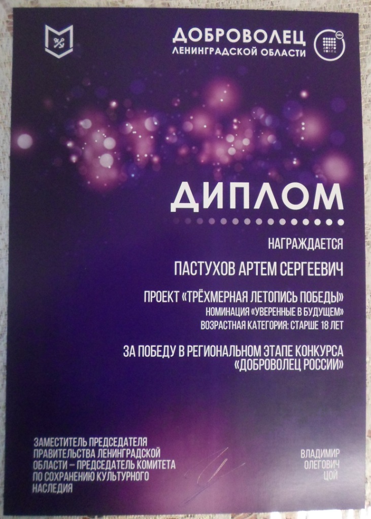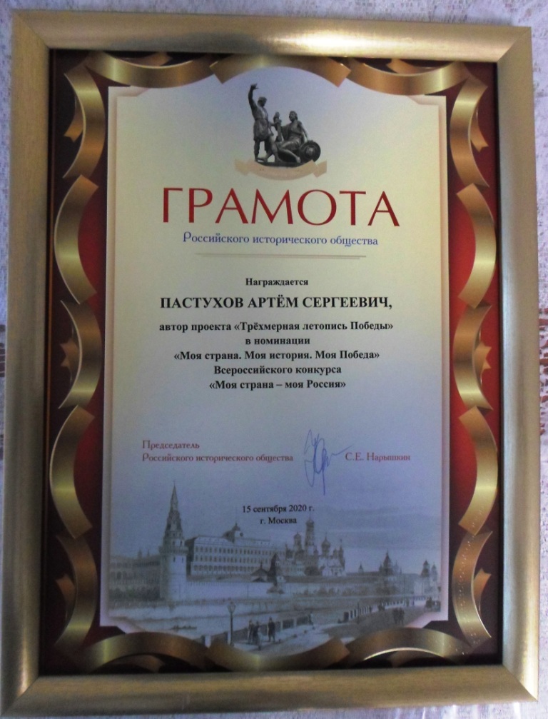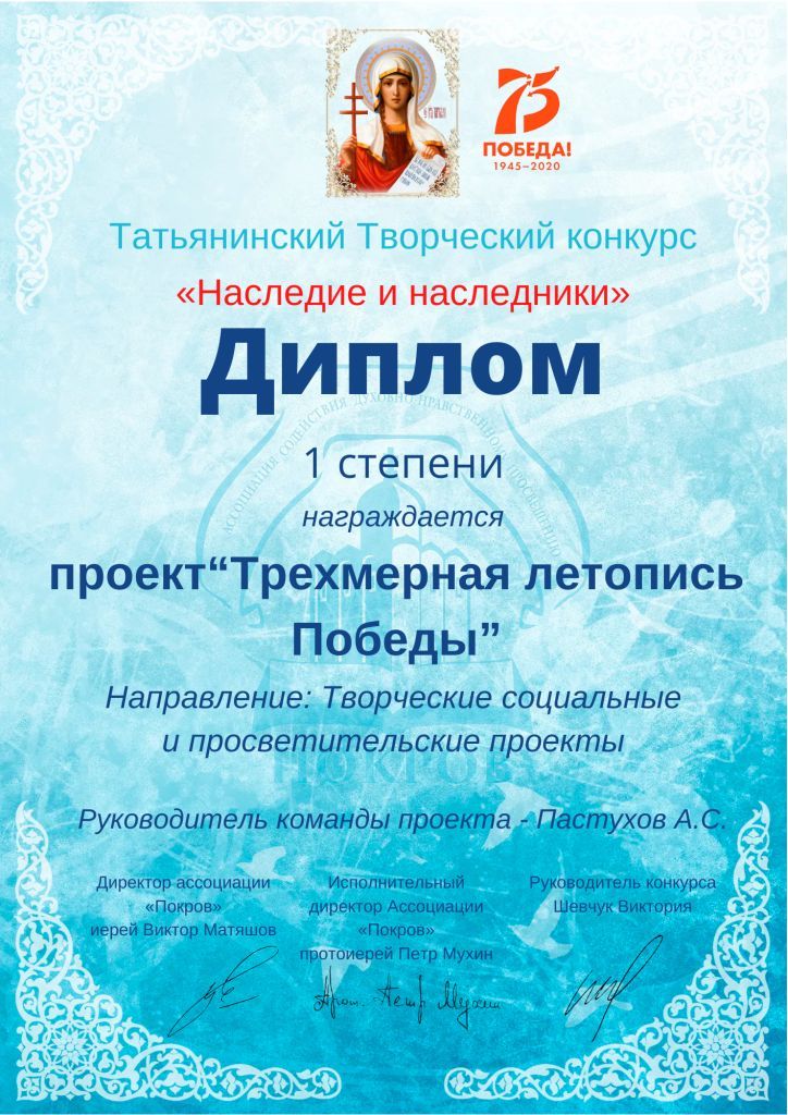 В Татьянинском творческом конкурсе Ассоциации духовно-нравственного просвещения «Покров» в номинации «Творческие социальные и просветительские проекты». Проект "Трехмерная Летопись Победы" был отмечен дипломом первой степени;