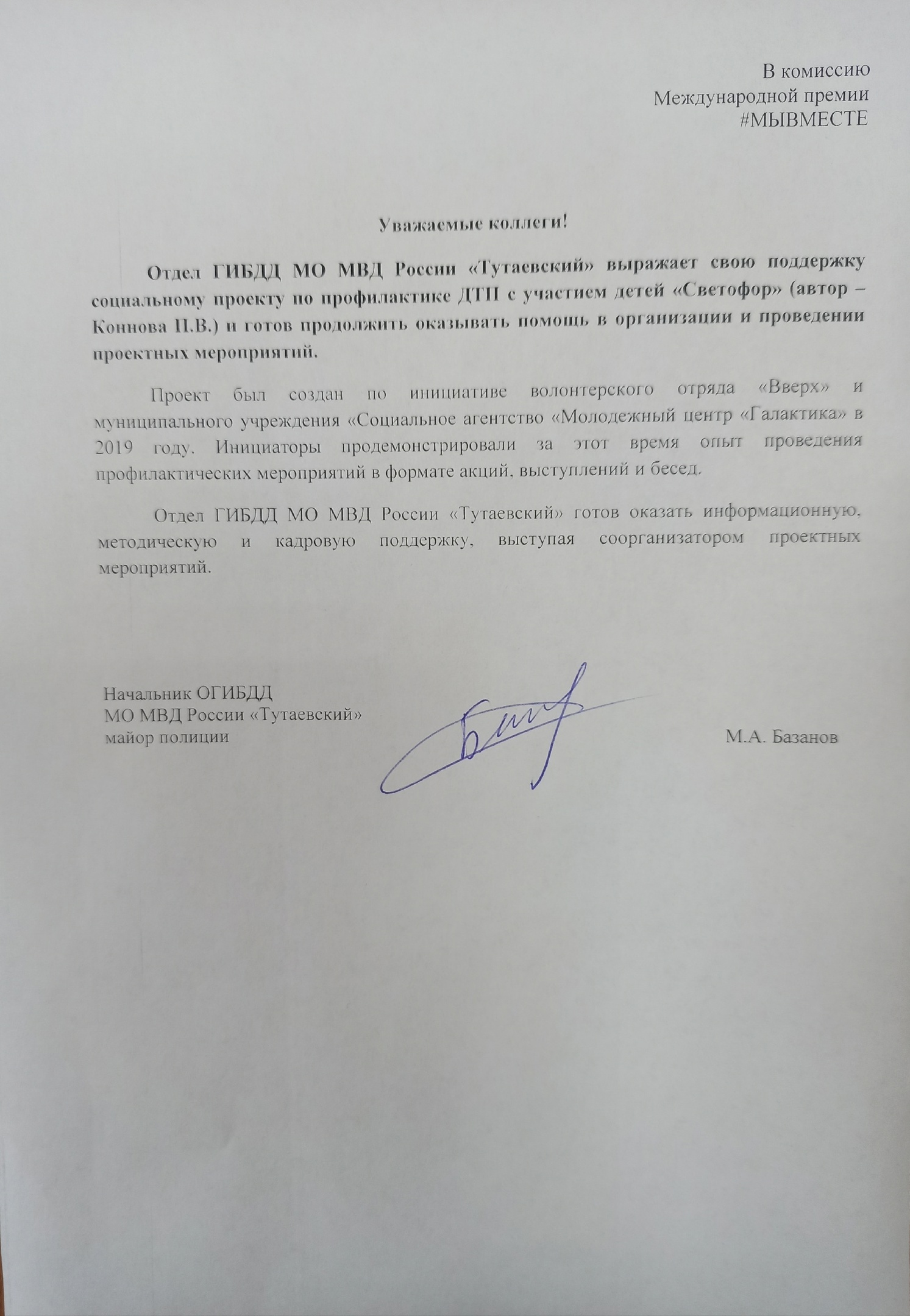 В целях решения такой актуальной для Тутаевского муниципального района проблемы как большое количество ДТП с участием детей по своей вине, по инициативе волонтерского движения и ОГИБДД Тутаевского района был создан социальный проект «Светофор», который реализуется в форме комплекса мероприятий информационной, творческой и профилактической направленности.