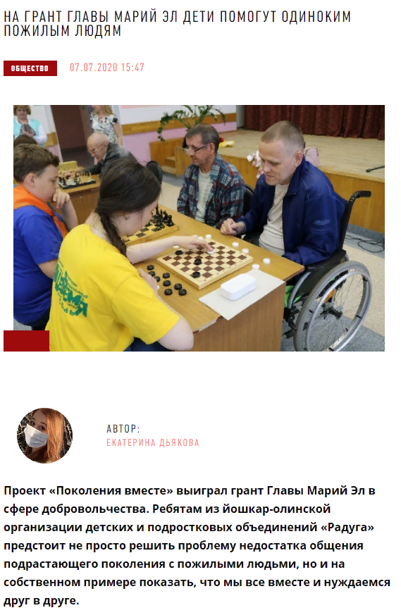 Проект «Поколения вместе» реализован членами детских объединений Местной общественной организации детских и подростковых объединений г.Йошкар-Олы «Радуга» совместно с ГБУ Республики Марий Эл «Йошкар-Олинский дом – интернат для престарелых и инвалидов «Сосновая роща» и ГБУК Республики Марий Эл «Республиканская детско-юношеская библиотека им. В. Х. Колумба», тесная дружба связывает ребят с домом ветеранов "Сосновая роща" на протяжении многих лет. На сегодняшний день существует проблема недостатка общения подрастающего поколения с пожилыми людьми, особенно это касается, пожилых людей, проживающих в домах ветеранов и одиноких людей. В связи с этим стареющие люди лишаются значимого для них общения, поддержки и нуждаются в помощи. В доме-интернате проживают 160 человека, у многих из них нет родственников, в связи с этим стареющие люди лишаются значимого для них общения с молодыми людьми, поддержки, даже смысла жизни и нуждаются в помощи. Кроме того, есть и одиноко проживающие люди, которые также нуждаются в помощи и общении. Проект помогает осуществить диалог между поколениями, почувствовать свою значимость людям пожилого возраста, обрести новые навыки и социальные роли, а молодым людям узнать историю жизни пожилых людей. Несмотря на пандемию,в 2020 году школьники смогли выстроить взаимодействие и не потерять связь с ветеранами и одинокими пожилыми людьми. В ходе реализации проекта группа волонтеров,после прохождения обучения, через общение с одинокими пожилыми людьми и пожилыми людьми, проживающих в доме-интернате организовала встречи, в т.числе посвященные Дню Победы, организованы мастер-классы по скандинавской ходьбе и творчеству, закуплены новые игры для проведения фестиваля настольных игр, оборудование для проведения мастер-классов. В результате реализации проекта произошли позитивные изменения в жизни благополучателей, участников проектов: изменение настроения пожилых людей ; Произошли позитивные результаты для сообщества: изменение общественного мнения, отношения к жителям дома-интерната; Увеличилось количество благополучателей, волонтеров, участников мероприятий; Увеличилось количество и качество проведенных мероприятий,объем привлеченных финансовых и иных средств; Привлечение новых партнеров.