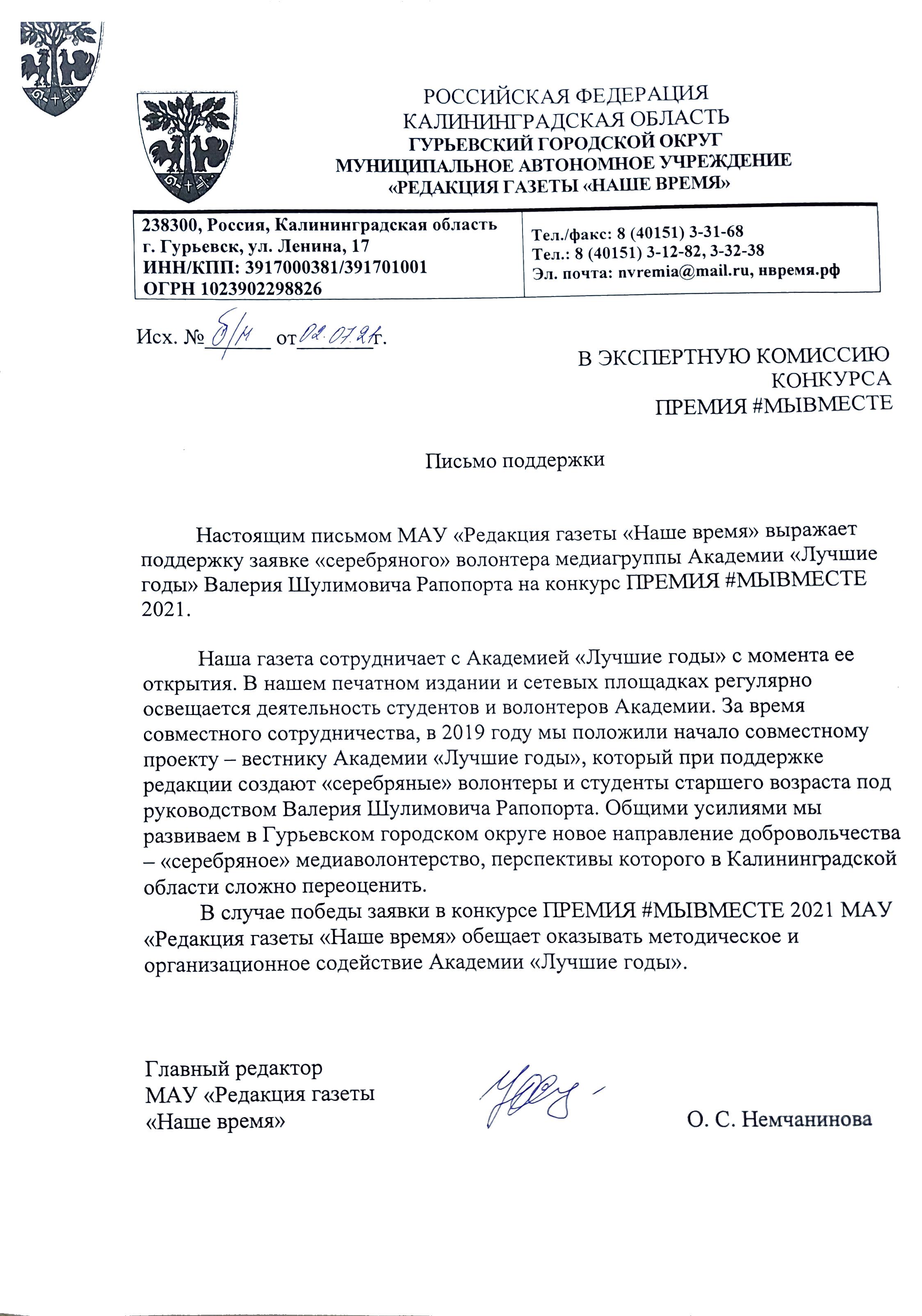 Воплотить инициативу в жизнь удалось при поддержке Администрации Гурьевского городского округа и Регионального центра «серебряного» волонтерства Калининградской области – благодаря им «серебряные» медиаволонтеры ежемесячно издают газету «Лучшие годы» тиражом 999 экземпляров, публикуют материалы в социальных сетях, выпускают учебные видео, проводят Zoom-вебинары и поддерживают старших в WhatsApp.