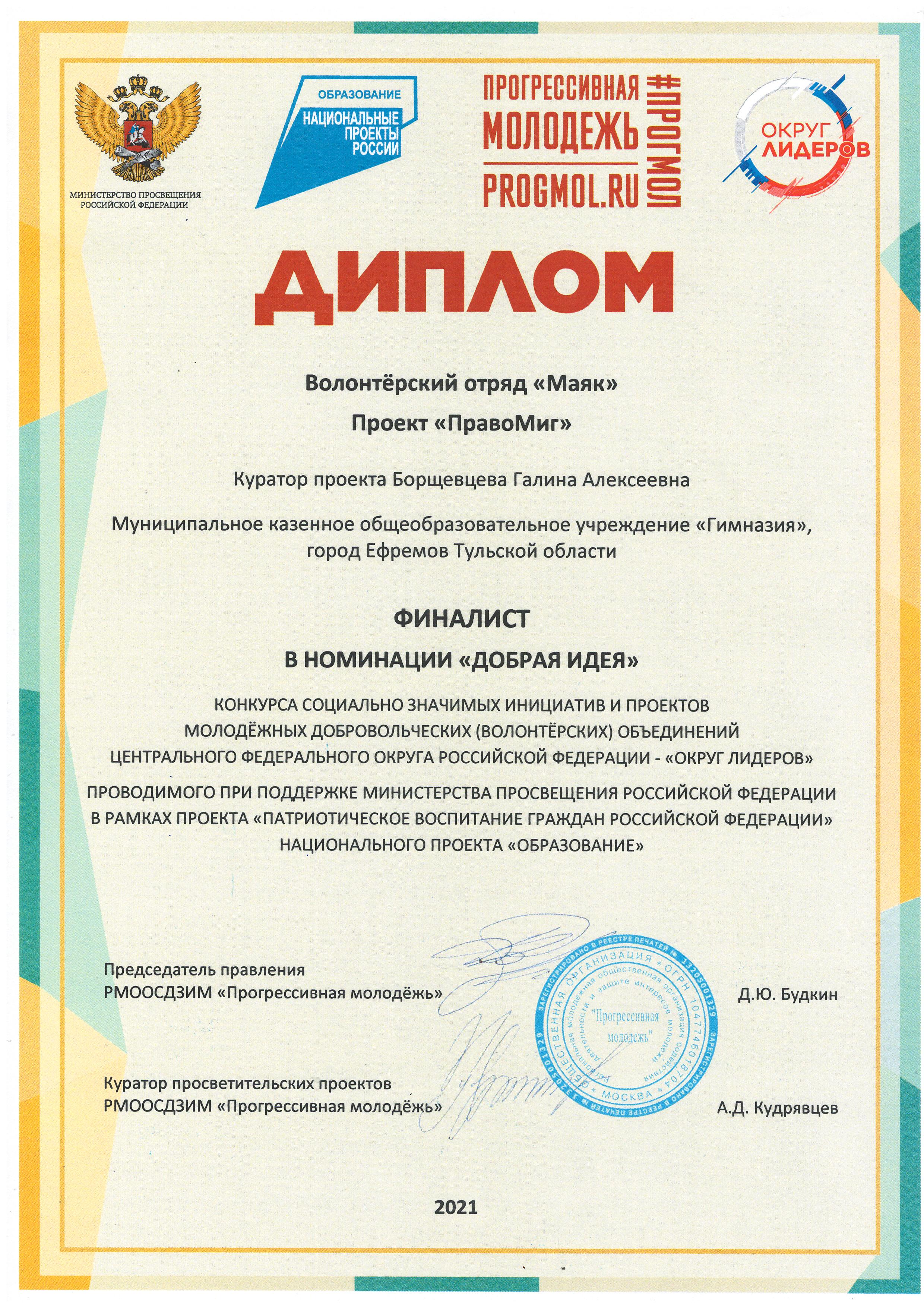 В 2021 году команда правовых волонтеров отмечена дипломом финалиста конкурса социально значимых проектов и инициатив молодежных добровольческих объединений Центрального федерального округа Российской Федерации «Округ лидеров».
