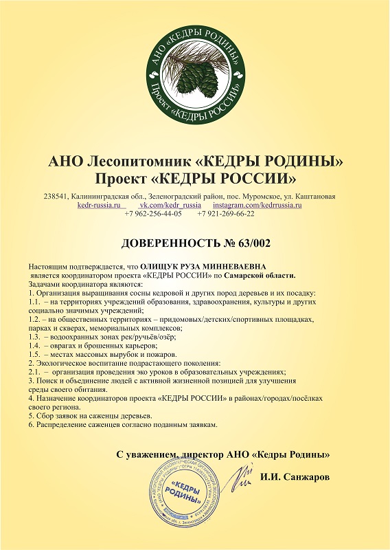 Мы получили большой отклик в сердцах наших коллег! 15 по 17 апреля в Самарской области будет высажено 7000 саженцев кедра и других пород деревьев в образовательных организациях нашего региона.