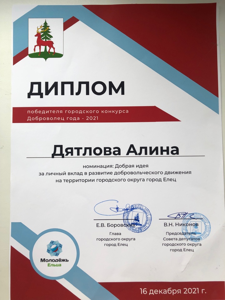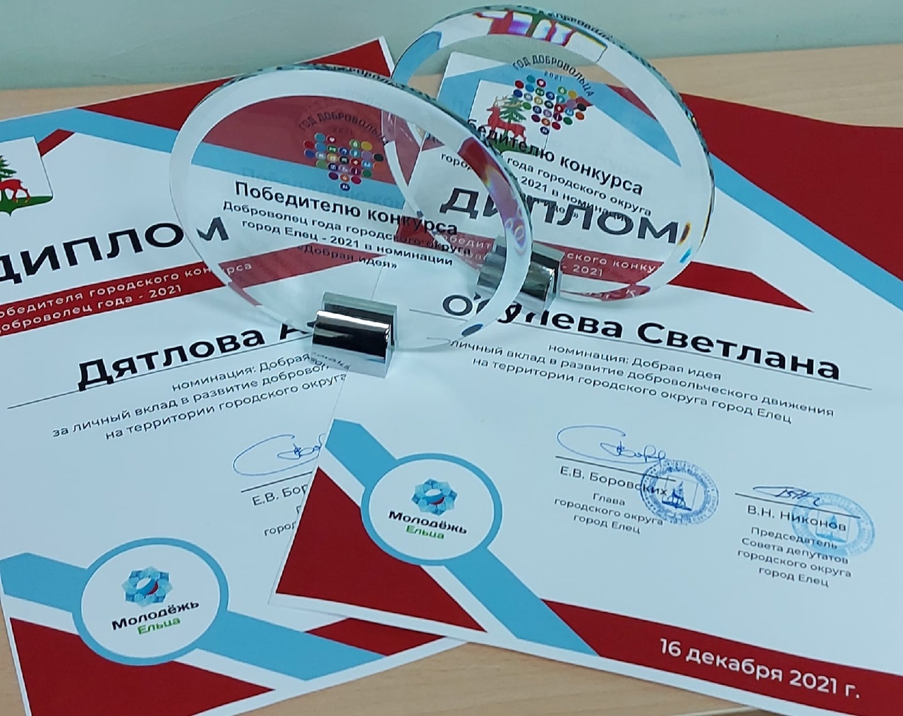 Также команда проекта награждена дипломом победителя городского конкурса «Доброволец года -2021» в номинации «Добрая идея» за вклад в развитие добровольческого движения на территории городского округа город Елец;