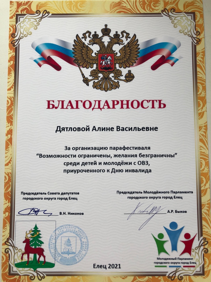 - награждены благодарственным письмом за организацию Парафестиваля «Возможности ограничены, желания безграничны» от Председателя Совета депутатов городского округа город Елец и Председателя Молодежного Парламента городского округа город Елец;