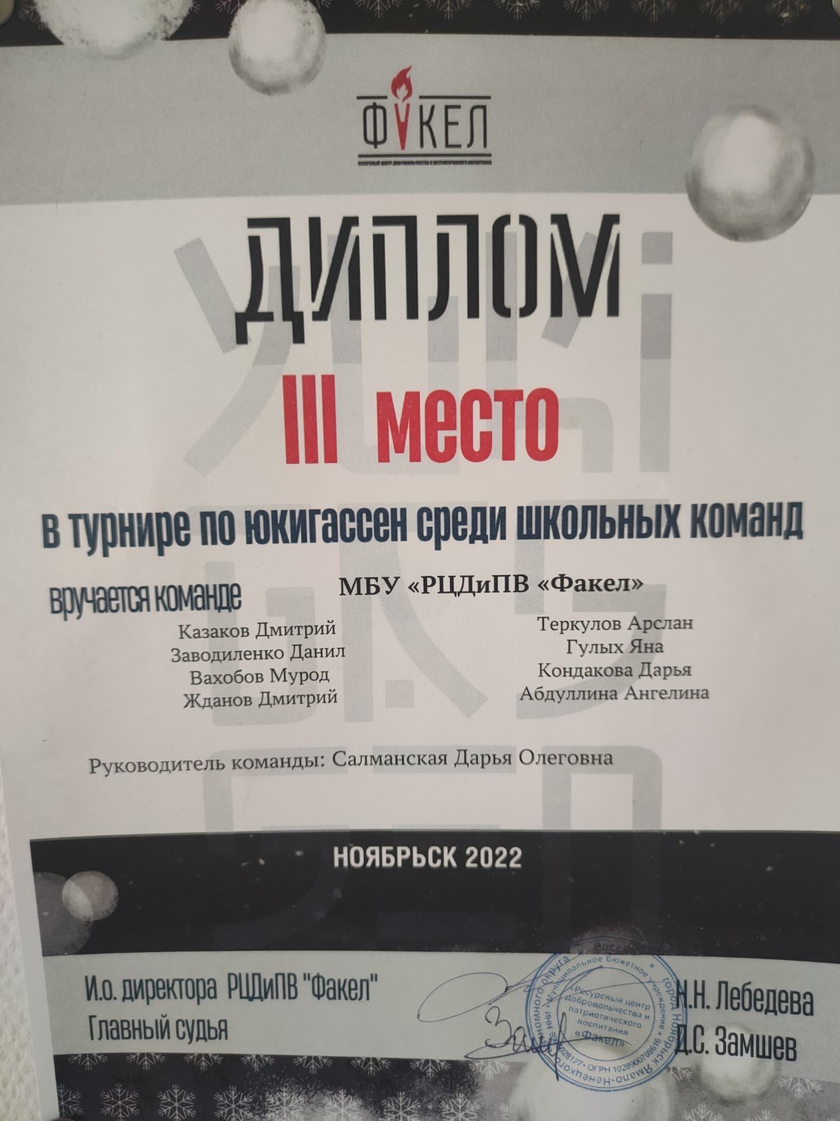 1-2 декабря 2021 г. в рамках I межрегионального турнира по юкигассен прошел теоретический этап обучения судей для турнира по юкигассен. Обучение провели сертифицированный судья из Мурманска Смирнова Наталья. 4-5 декабря 8 судей получили практический опыт судейства на самом турнире, после чего получили сертификат о прохождении судейского семинара- практикума. В июне 2021 года в городе Ноябрьске при поддержке департамента молодежной политики и туризма Ямало-Ненецкого автономного округа и программы социальных инвестиций «Родные города» компании «Газпром нефть» состоялся I летний турнир по юкигассен.