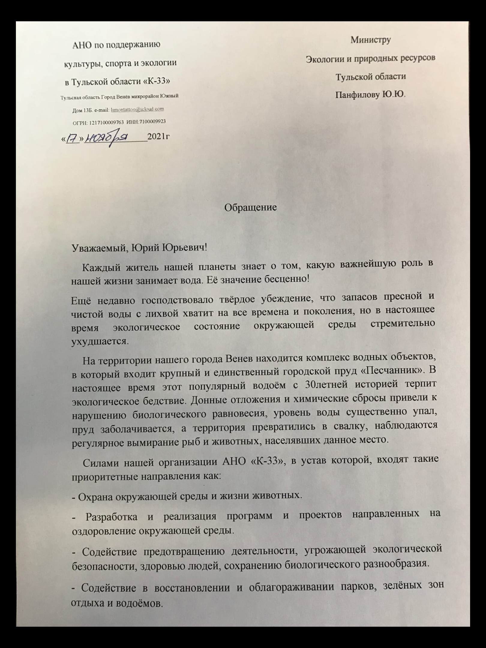 В городе Венев Тульской области существует крупный водоём с прилегающей зоной рекреации. Для населения города в 14000 человек пруд «Песчанник» является единственным водоёмом в пешей доступности и пользуется огромной популярностью. Также наш город ежегодно посещают не менее 50000 гостей, которые знают это место не по наслышан. Проект по оздоровлению и благоустройству водоёма стартовал в ноябре 2019 года. Силами волонтёров и активных горожан, а также администрации города проводятся работы по очистке дна и берегов водоёма от мусора и сорной растительности.