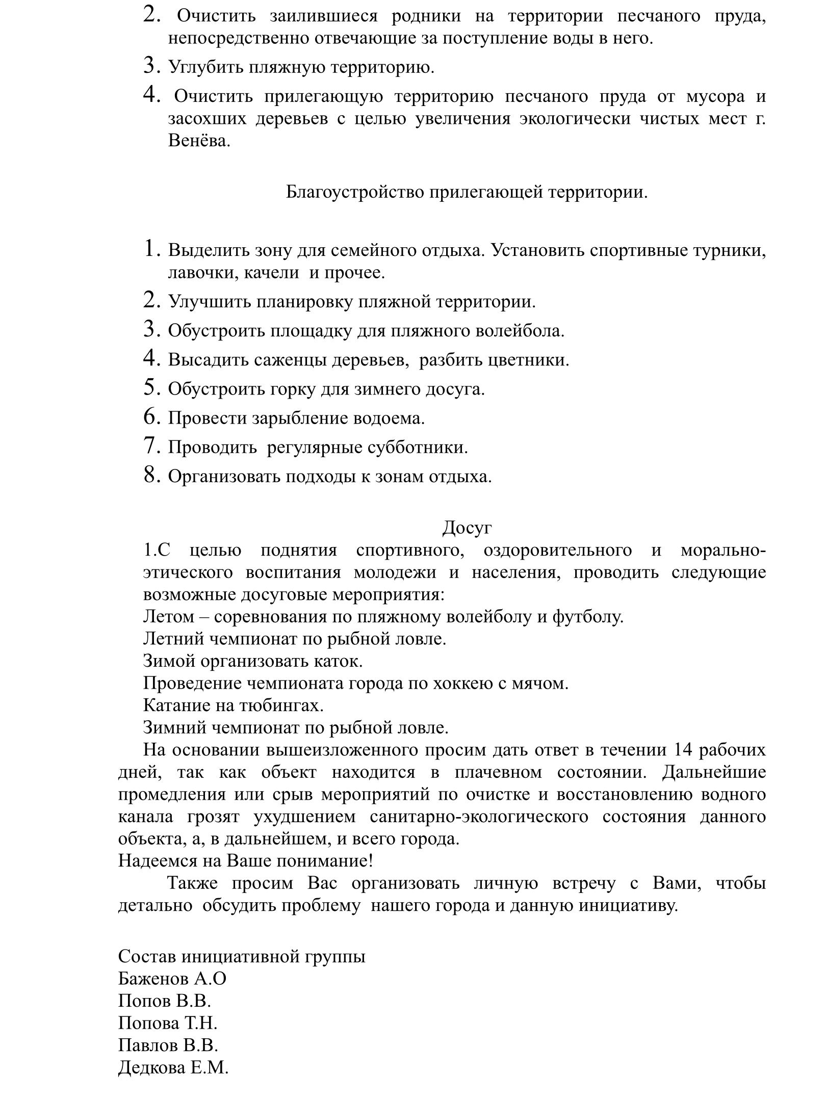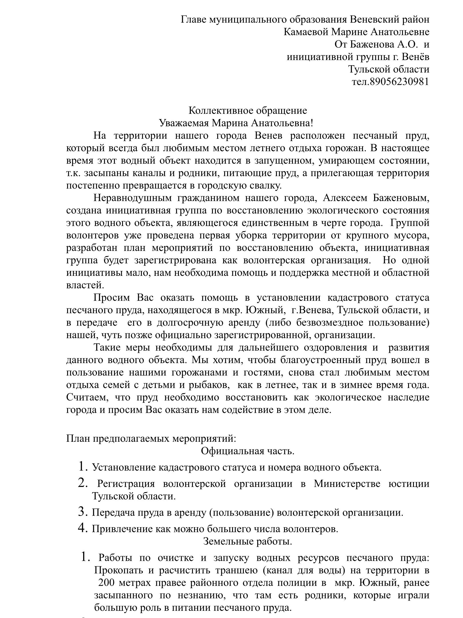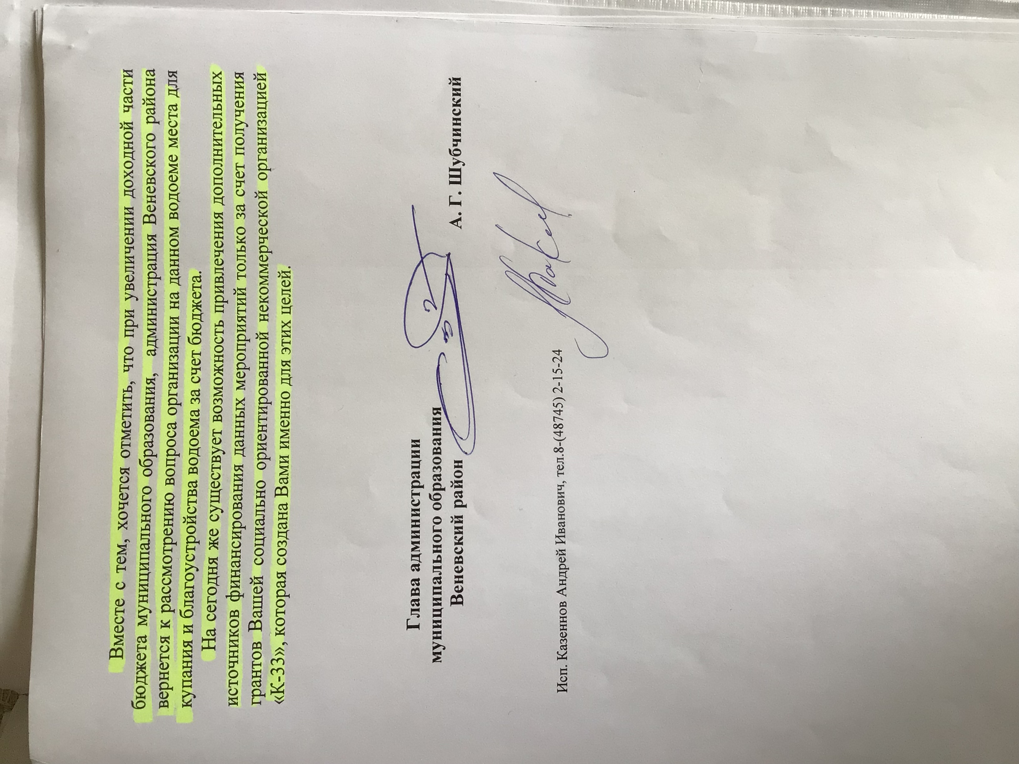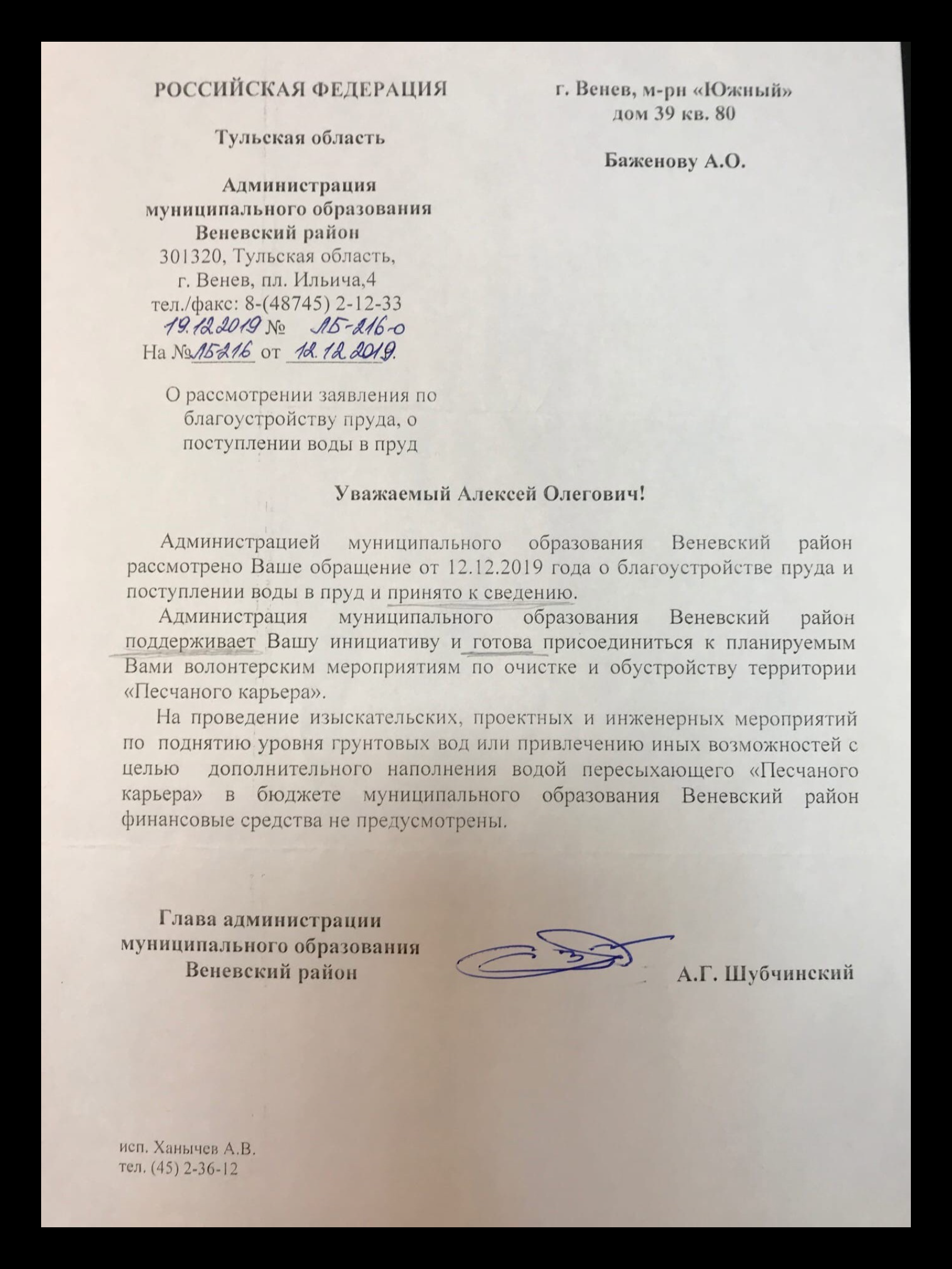 В поддержку развития водоёма выступили свыше 700 жителей города , о чем говорят данные нашего соц. опроса и собранные подписи. Однако отсутствие предусмотренных средств на его благоустройство в бюджете Веневского района говорит о возможности реализации проекта исключительно за счёт грантовых и привлечённых средств.