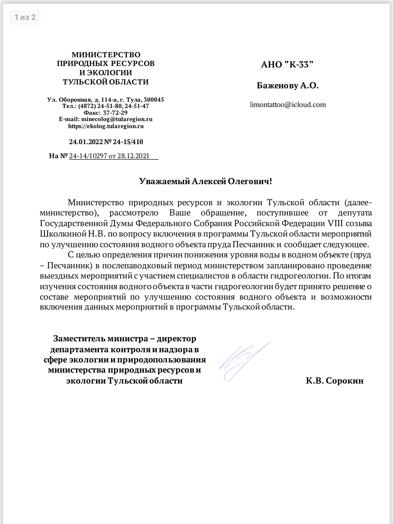В нашей официальной группе в контакте https://vk.com/clubk33 регулярно публикуются акции, и достигнутые результаты, https://vk.com/wall-189817670_2085 Сегодня команда проекта составляет не менее 20 человек. Открыт сбор пожертвований на очистку водоёма и его благоустройство. Организовано взаимодействие с Министерством экологии Тульской области по выявлению причин ухудшения экологического состояния водоёма и разрабатываются меры по его оздоровлению, предложенные меры планируется реализовать при грантовой поддержке и партнерской помощи.