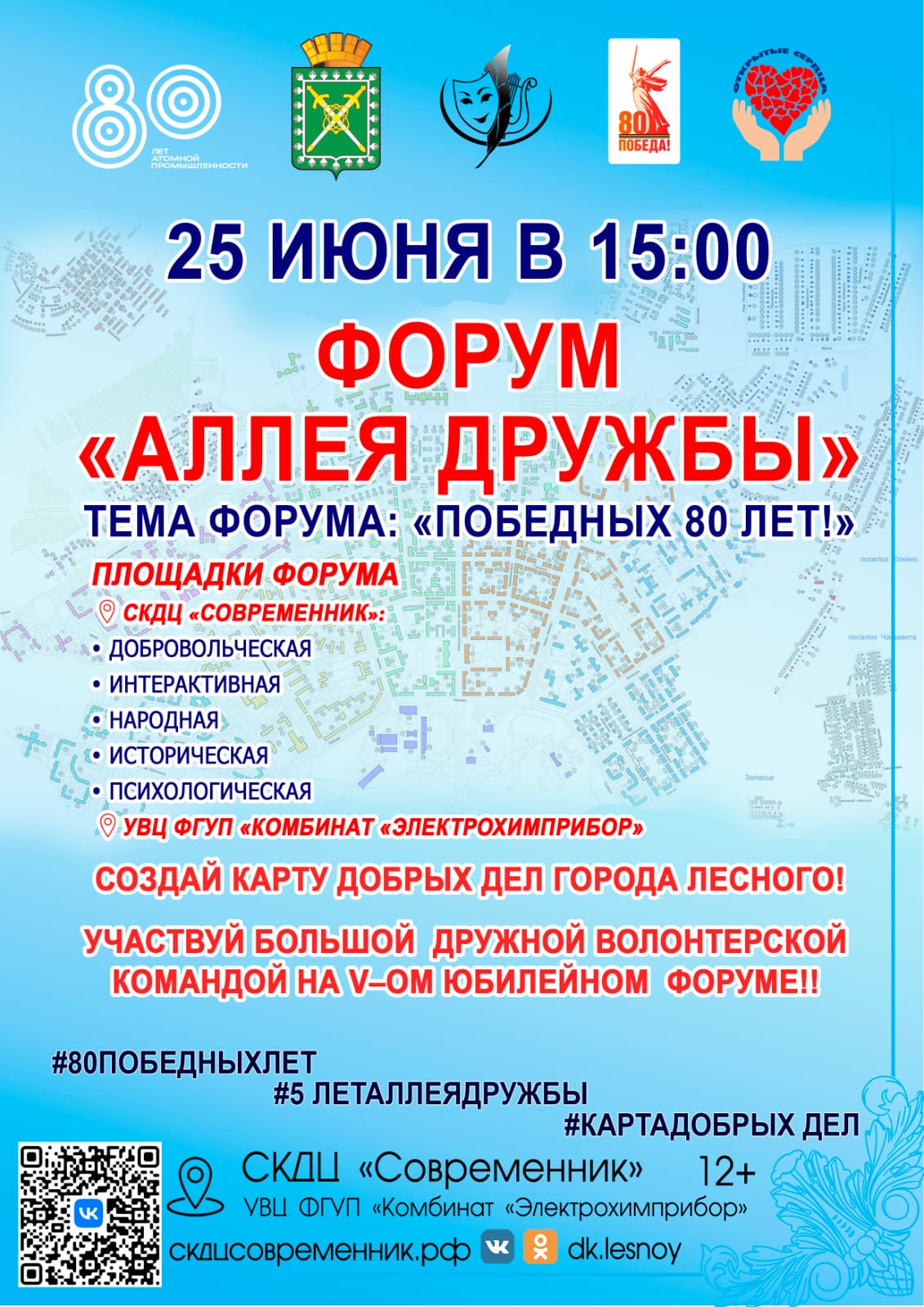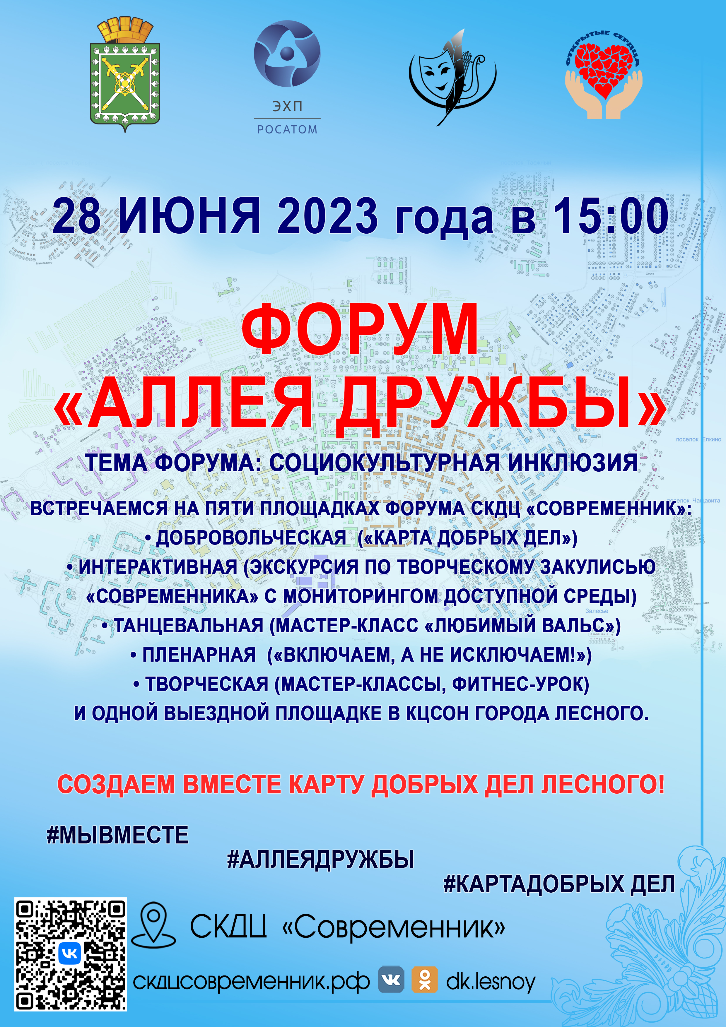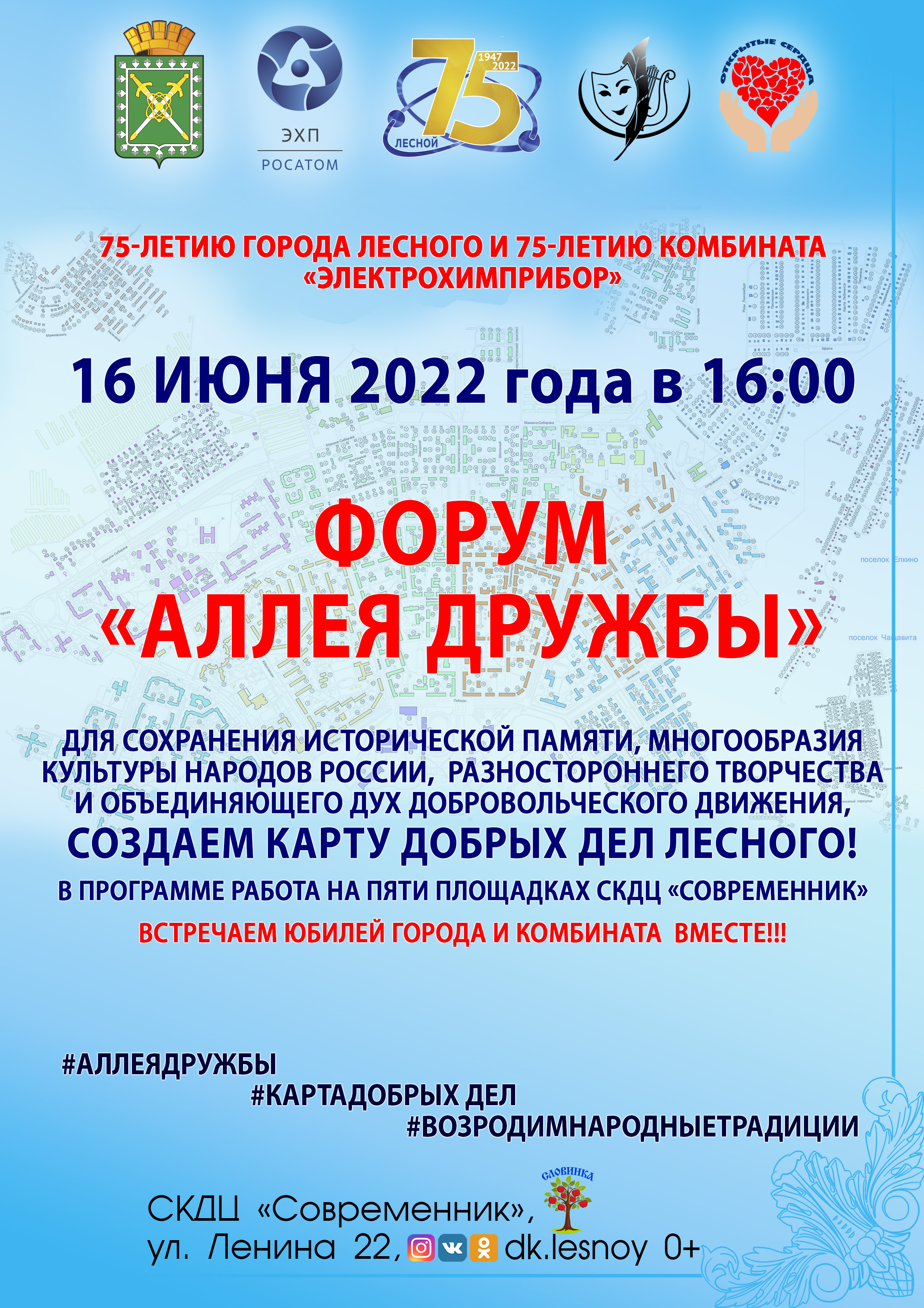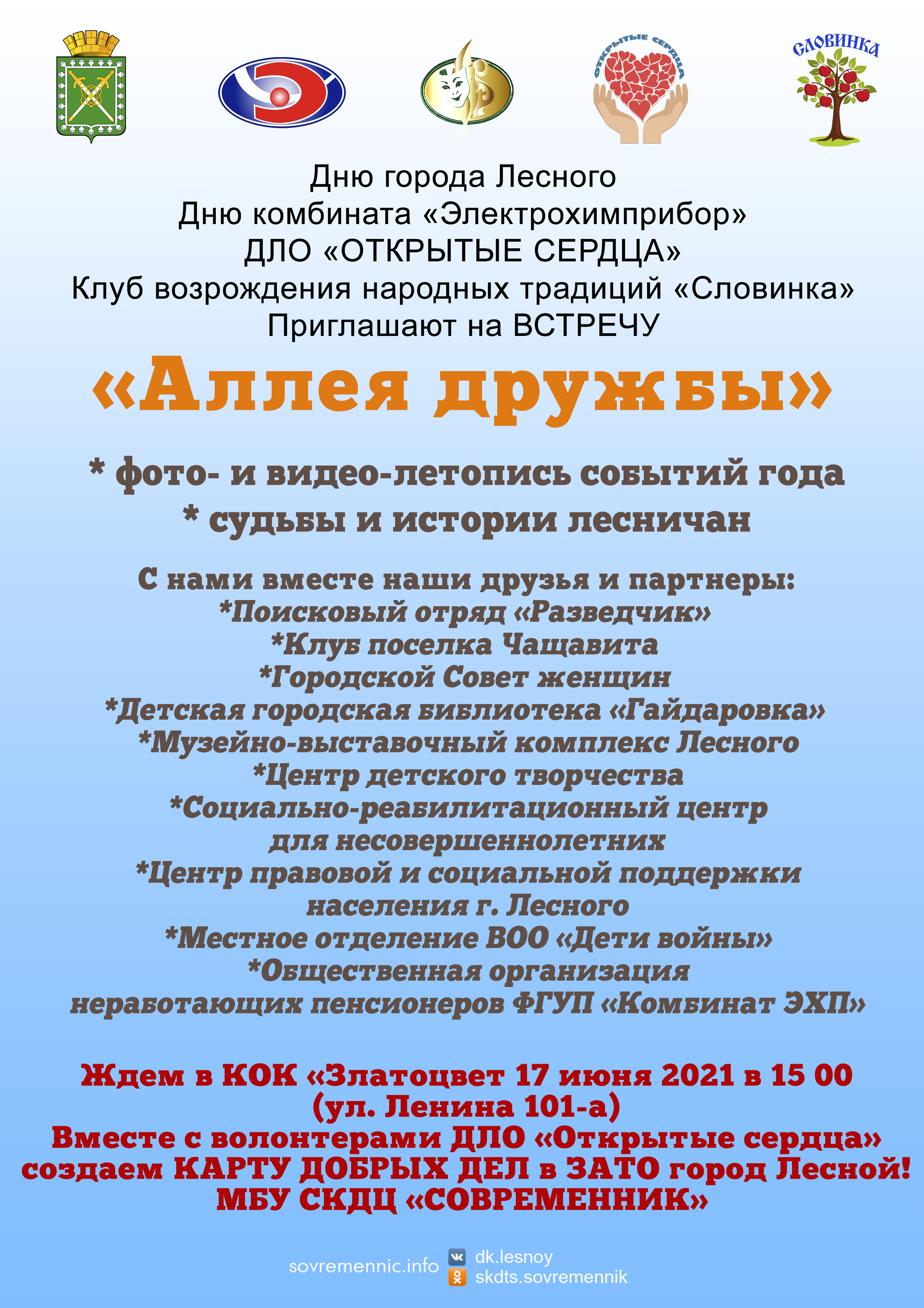 Волонтерский проект "КАРТА ДОБРЫХ ДЕЛ города Лесного" - авторский проект руководителя Клубного формирования МБЦ "СКДЦ "Современник" - Добровольного любительского объединения "Открытые сердца". Сегодня в составе участников - более 60 партнеров и друзей проекта. .Осуществляется на территории ГО "Город Лесной" с 2019 года. Подведение итогов оказываемой благополучателям помощи в социо-культурной сфере города, и нанесение новых адресов на саму "КАРТУ ДОБРЫХ ДЕЛ" я в формате форума" Аллея дружбы" в июне каждого года в стенах СКДЦ "Современник" .На форуме организована работа на пяти площадках центра культуры и обязательной одной выездной площадке. Форумчане и участники проекта "КАРТА ДОБРЫХ ДЕЛ" делятся опытом и лучшими добровольческими практиками социо-культурной жизни города Лесного по итогам работы за год. В финале форума "Аллея дружбы" проводится чествование лучших волонтеров и новых партнеров проекта КАРТА ДОБРЫХ ДЕЛ" ГО "Город Лесной"