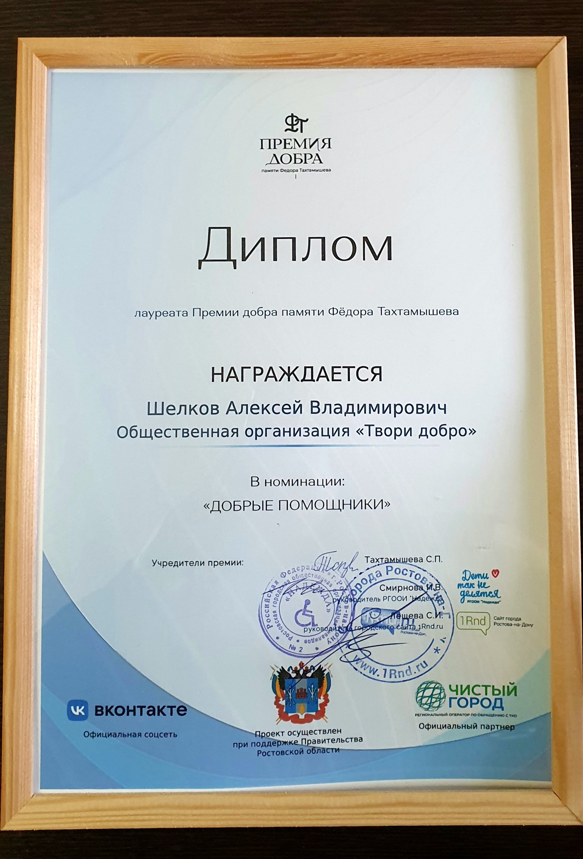 В 2021 году, работу нашего проекта отметили на региональном уровне в рамках "Премии ДОБРА им Федора Тахтамышева", где мы стали лауреатами.