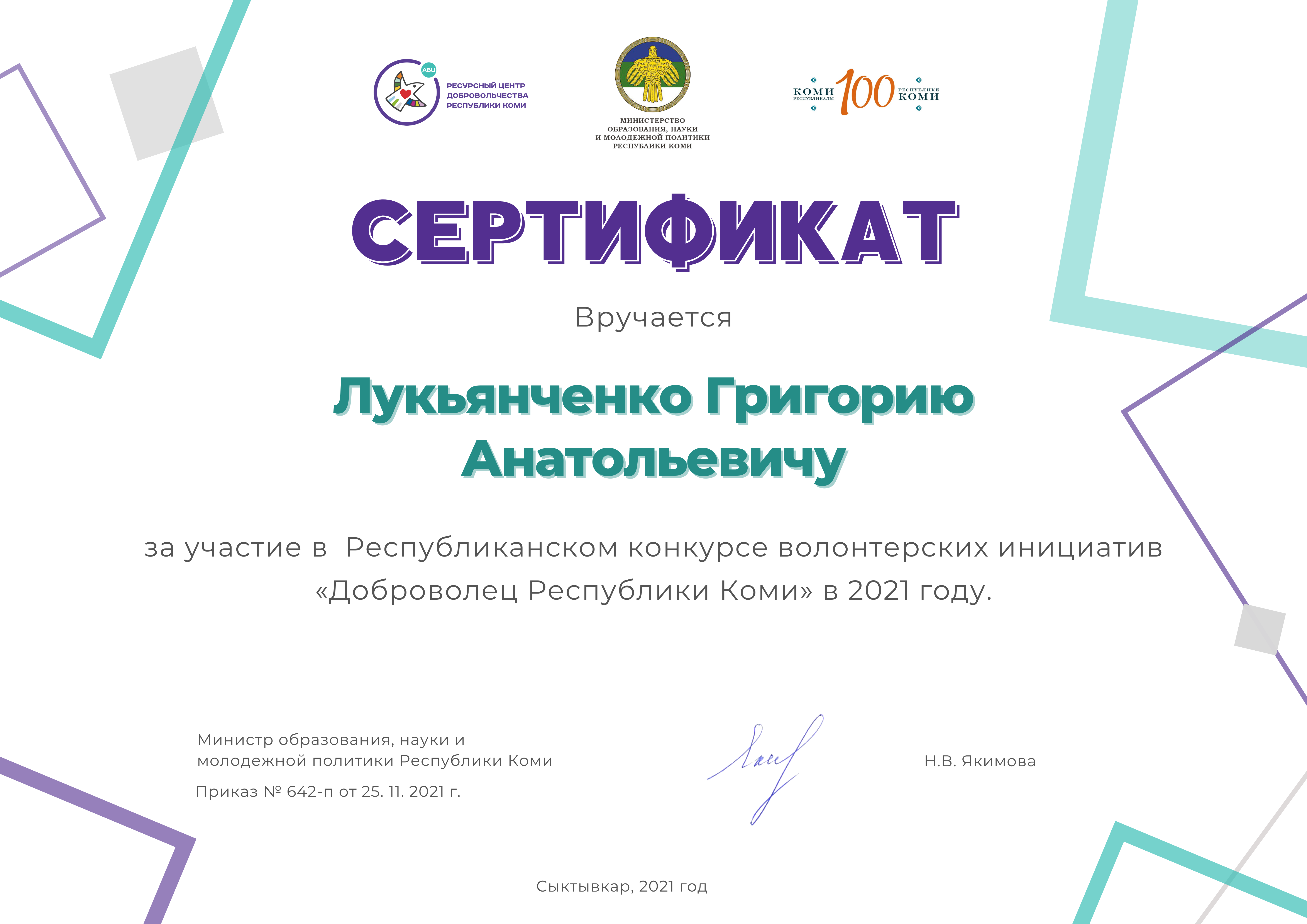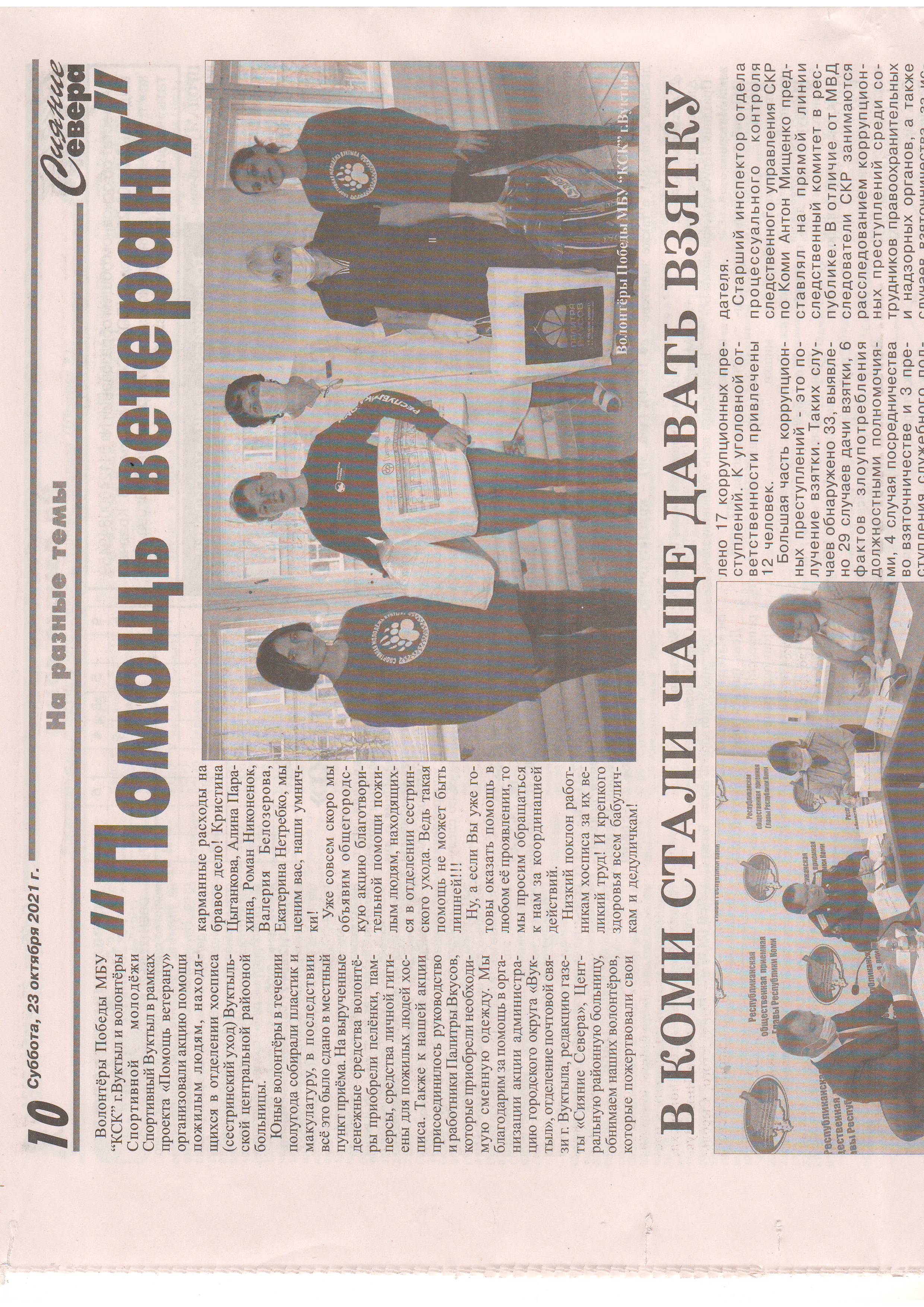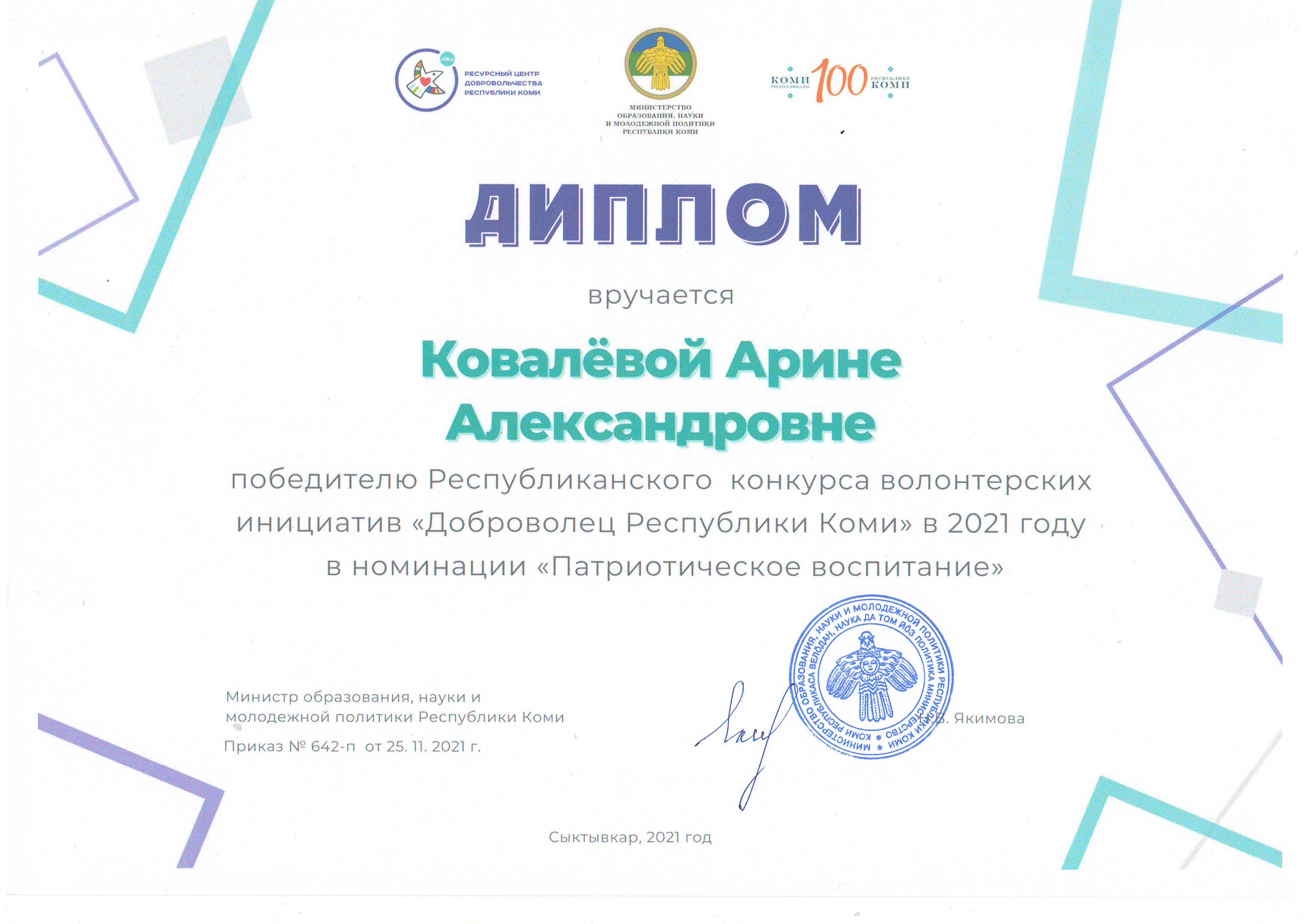 - Победители открытого конкурсного отбора на уровне Республики Коми в рамках Всероссийского конкурса лучших региональных практик поддержки волонтерства «Регион добрых дел» 2021 года;