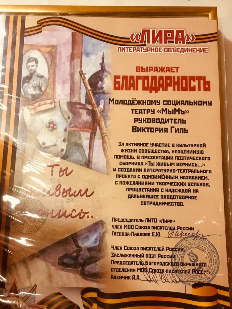 Особое место в деятельности театра занимает работа над спектаклями, посвященными событиям Великой Отечественной войны и Великой Победе над фашизмом. Команда МСТ «МыМъ» поставила множество спектаклей: «Молодая Гвардия»; «Четвертая высота»; «Нина»; «Блокада»; «25»; «Нельзя сразу на небо»; «Бабочки здесь больше не живут». Одним из необычных патриотических проектов театра стал поэтический спектакль «Ты живым вернись...», созданный совместно с Литературным объединением «Лира». Широко представлен документальный спектакль «Константин Богородский», созданный совместно с Богородским Благочинием. Спектакль был сыгран в апреле 2017 года на сцене Московского областного драмтеатра в Ногинске во время приезда митрополита Крутицкого и Коломенского. На сегодняшний момент одним из ведущих спектаклей театра является документальный спектакль «Романовы», сыгранный более 20 раз на территории Восточного Подмосковья.