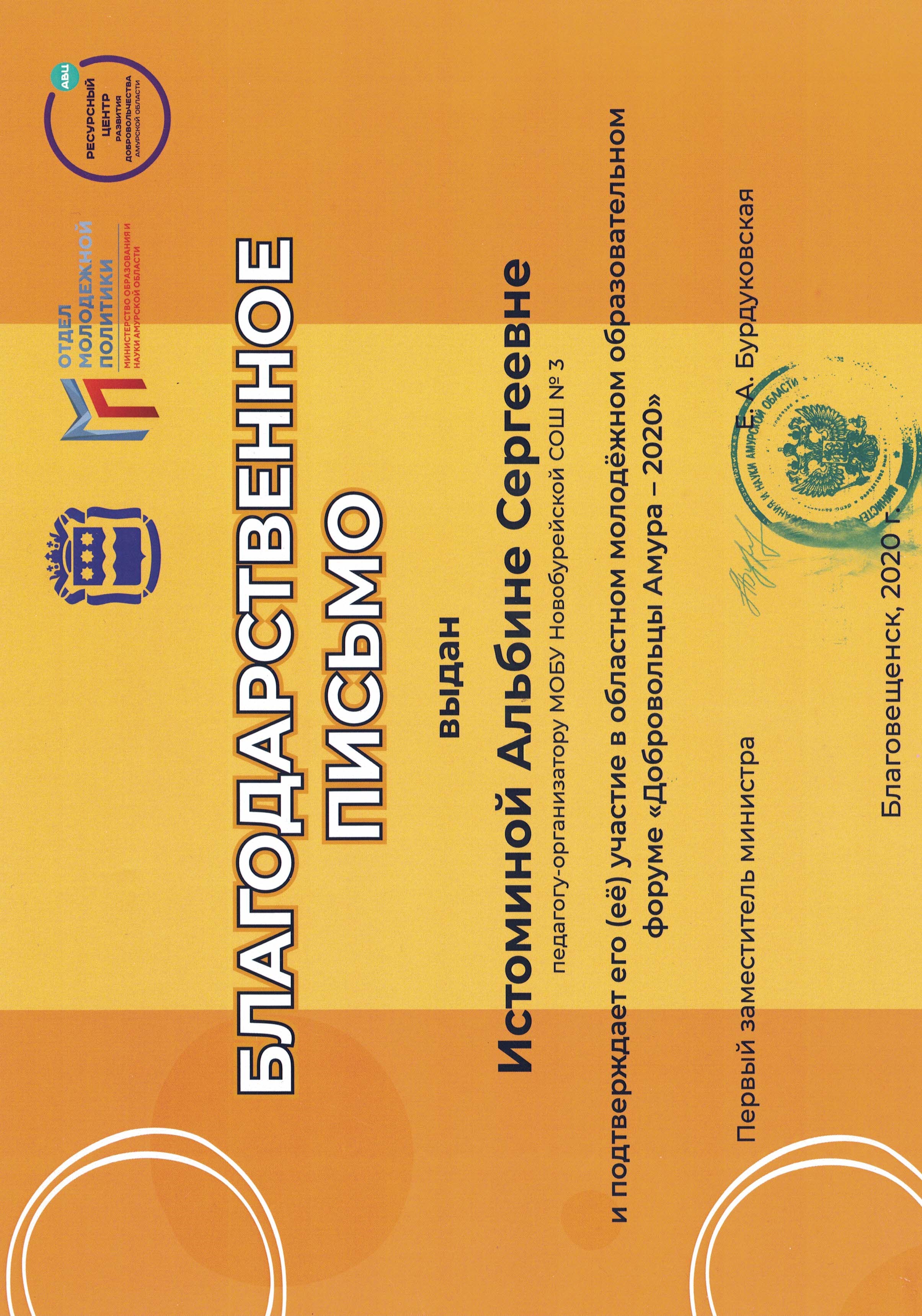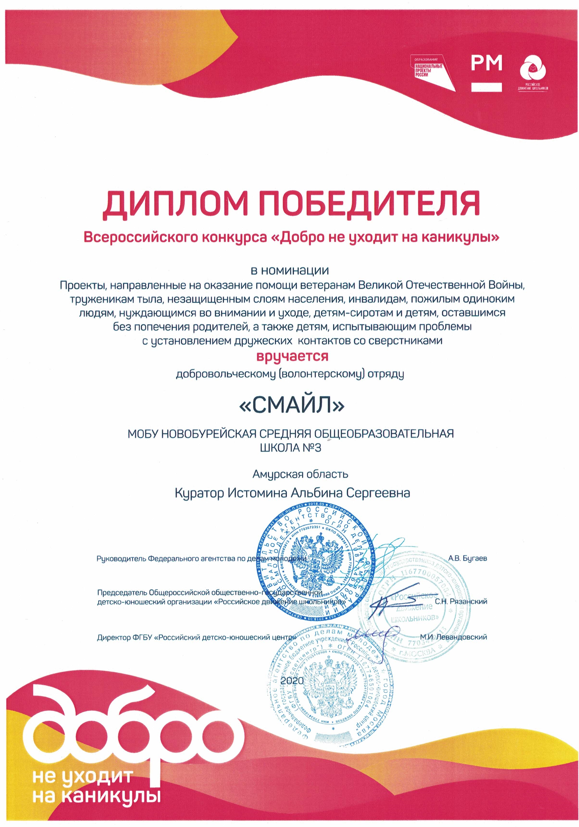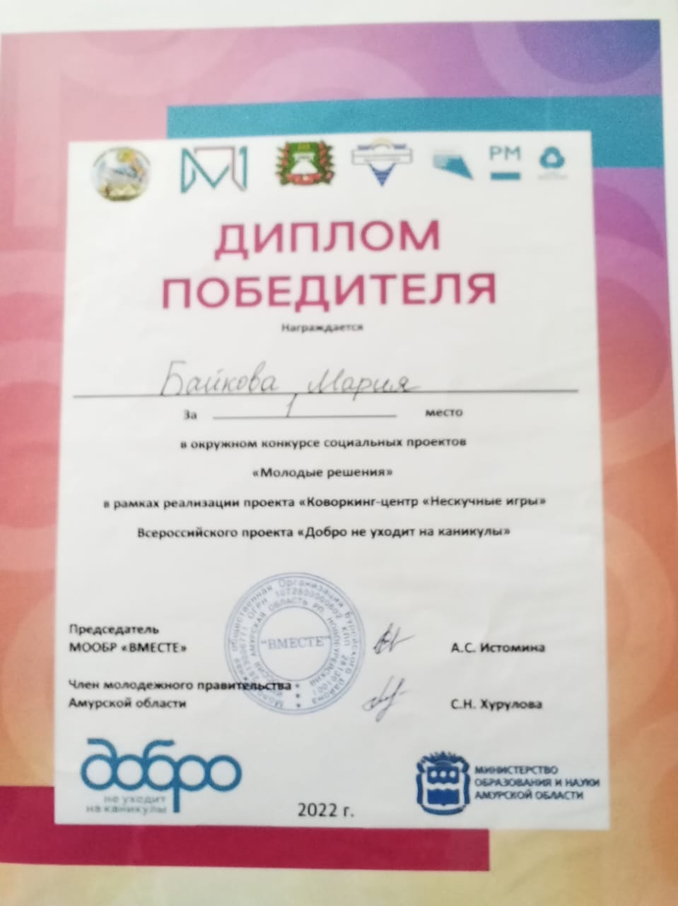 На итоговом мероприятии были определены 3 победителя среди команд участников проекта, которые получили информационную поддержку от 3 организаций: Молодежного правительства Амурской области, МООБР «ВМЕСТЕ» и Администрации Бурейского округа.