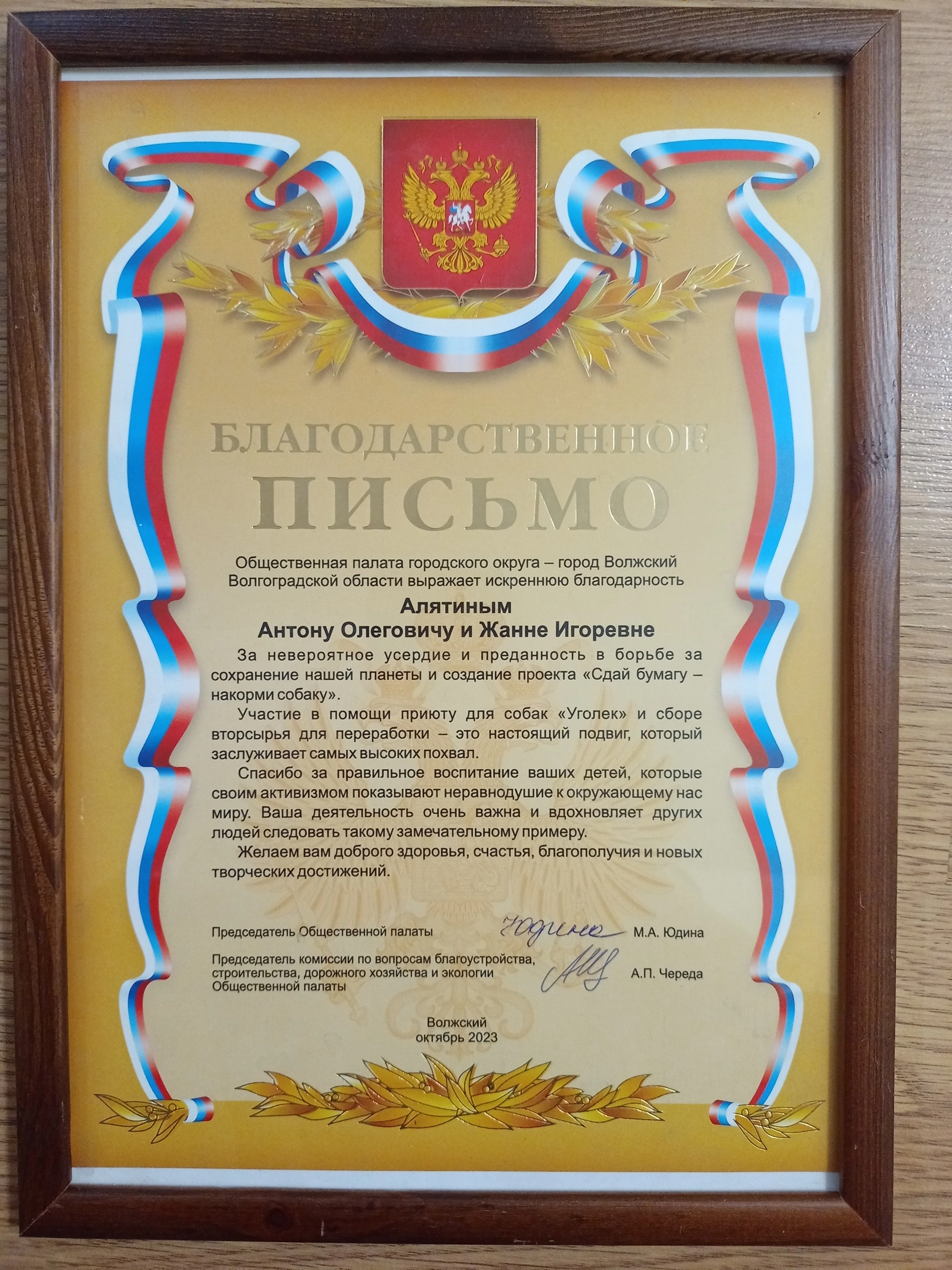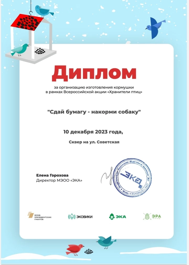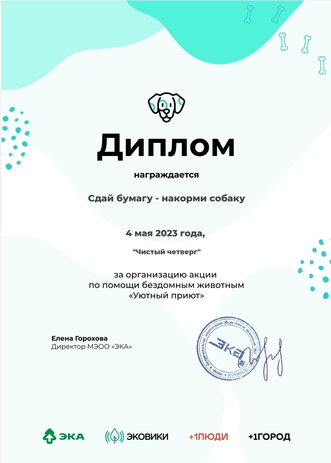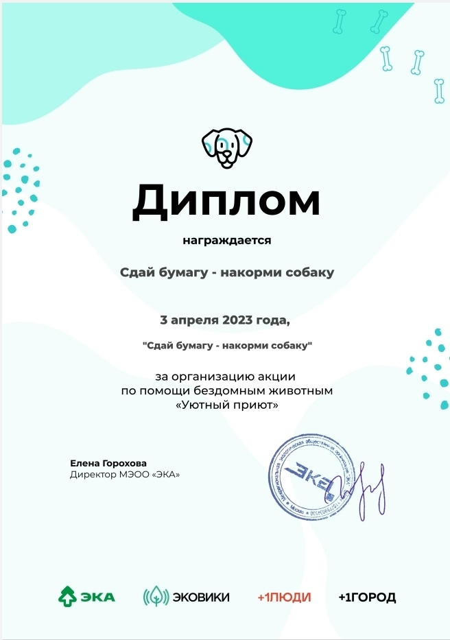 "Сдай бумагу - накорми собаку" собирает и сдаёт в переработку вторсырье, в рамках проекта с сентября 2022 по июнь 2023 будут проведены также экосплавы с уборкой мусора и выходы на природу. На вырученные средства будет закуплен корм для постояльцев Приют "ОСТРОВОК НАДЕЖДЫ"(переименован в ВГБОО "Приют для животных "Уголёк").