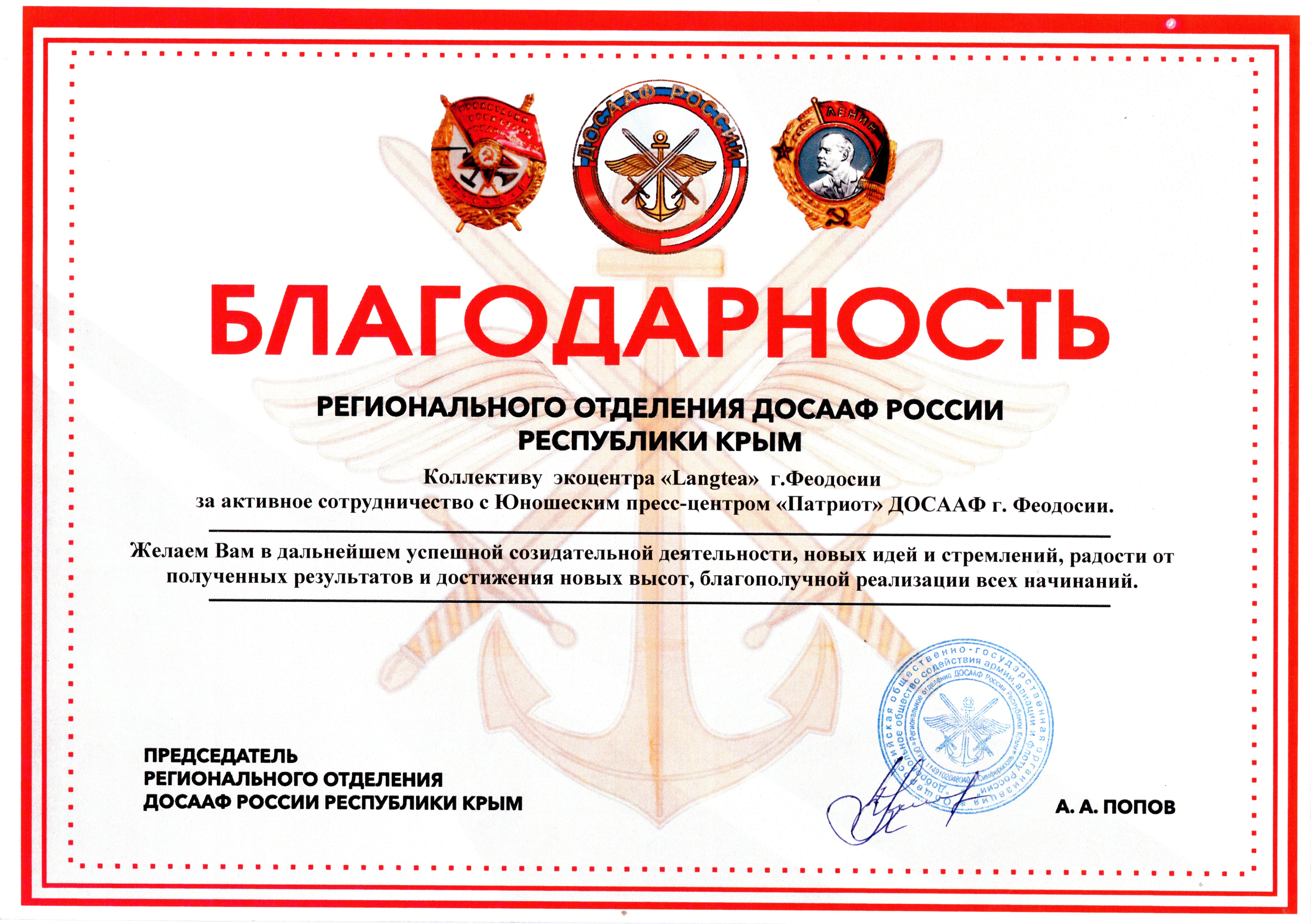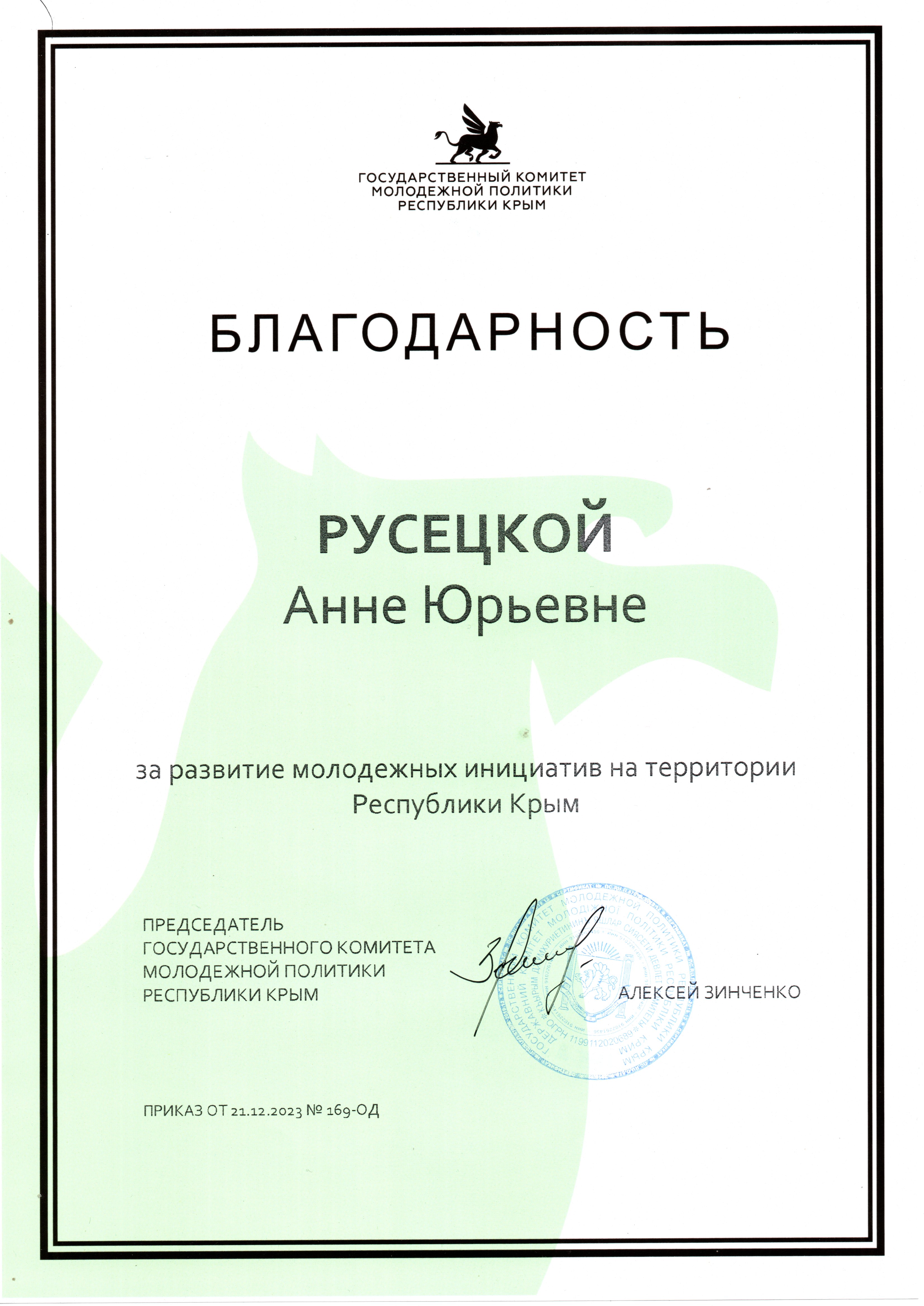 Благодарность за добросовестный труд, высокое мастерство, в связи с Днем добровольца от Главы Республики Крым С.В. Аксенов