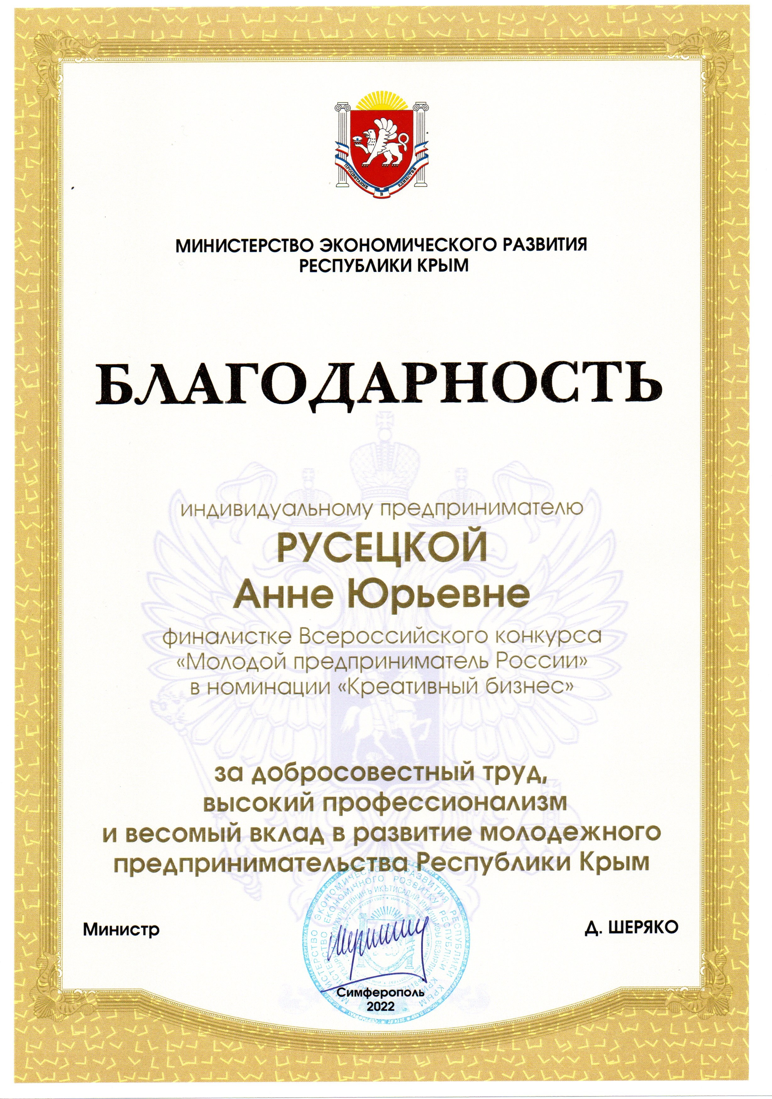 Благодарность за добросовестный труд, высокий профессионализм и весомый вклад в развитие молодежного предпринимательства Республики Крым от Министра экономического развития Д. Шеряко