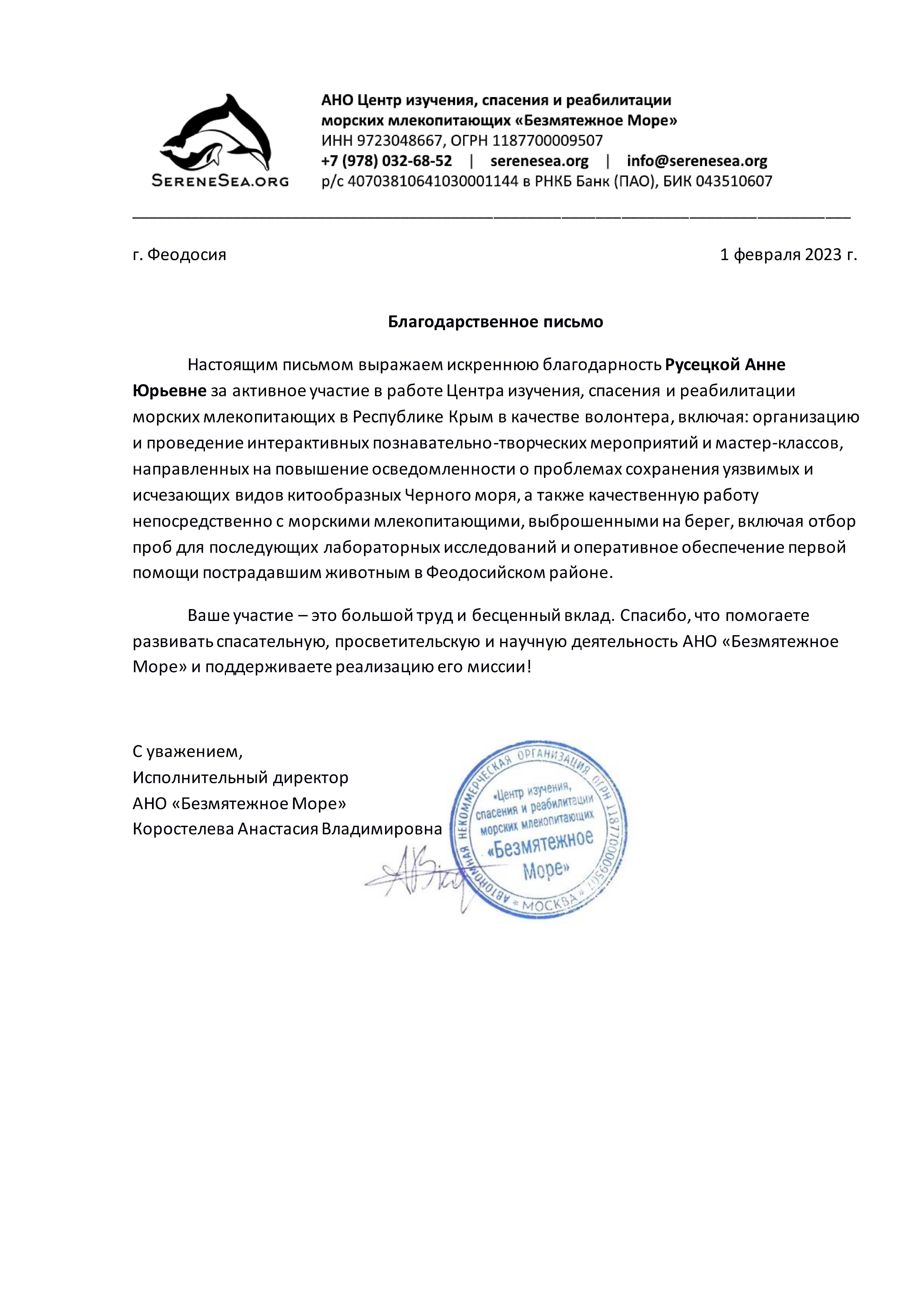 Благодарственное письмо за помощь в организации площадки #МЫВМЕСТЕ и проведении мастер-классов в рамках фестиваля ТАВРИДА.АРТ от Председателя Совета Ассоциации волонтерских центров А.П. Метелева