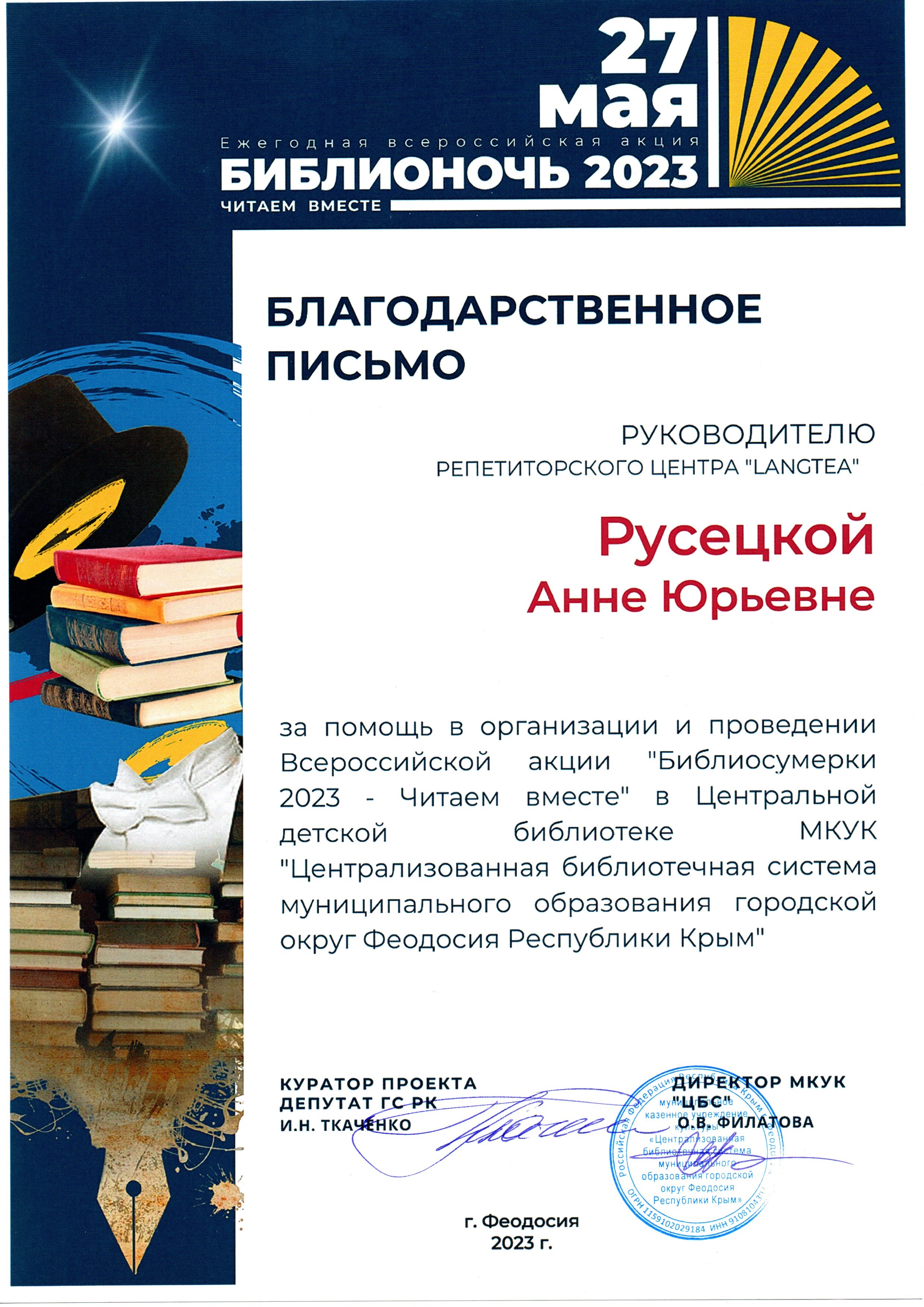 Благодарственное письмо за вклад в добровольческую деятельность на территории Республики Крым от Министра внутренней политики, информации и связи Республики Крым В. Трегуба