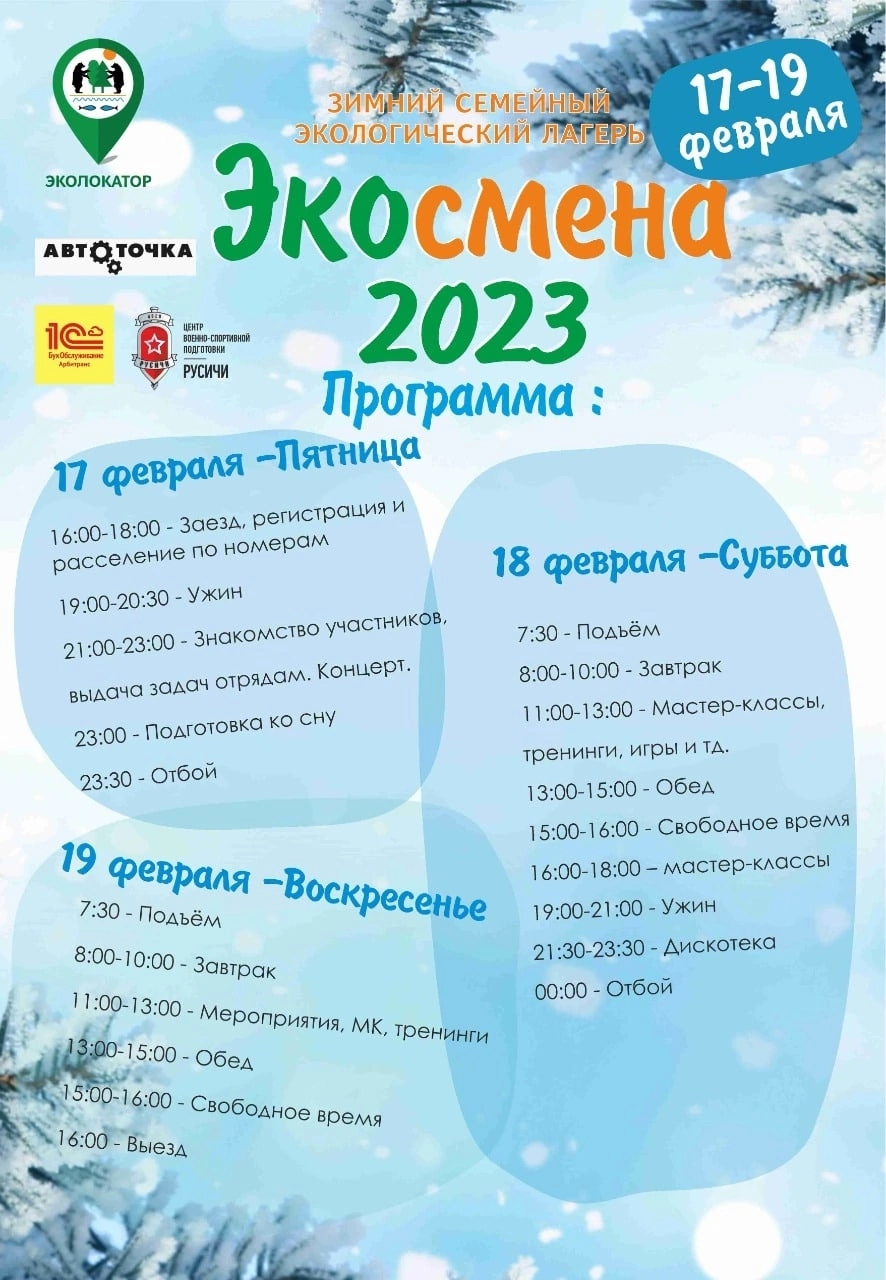 утренняя лесная зарядка с элементами фитнеса и скандинавской ходьбы; - мастер - класс "Мануфактура" - экологический детский квест; - мастер - класс по изготовлению лежанок для животных из ненужных вещей; -развлекательная вечерняя программа. Все активности согласно расписанию закреплены за ответственными вожатыми, которые следят за ходом проведения мероприятия. В качестве помощников на самые массовые