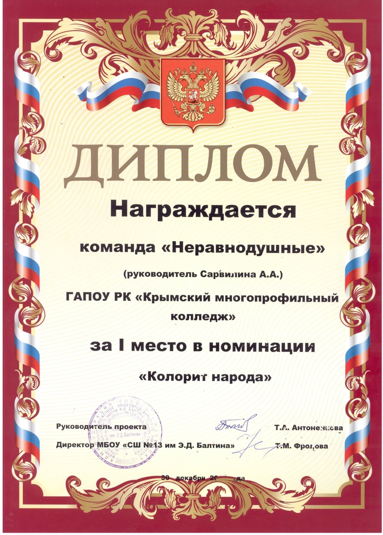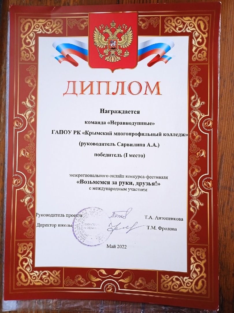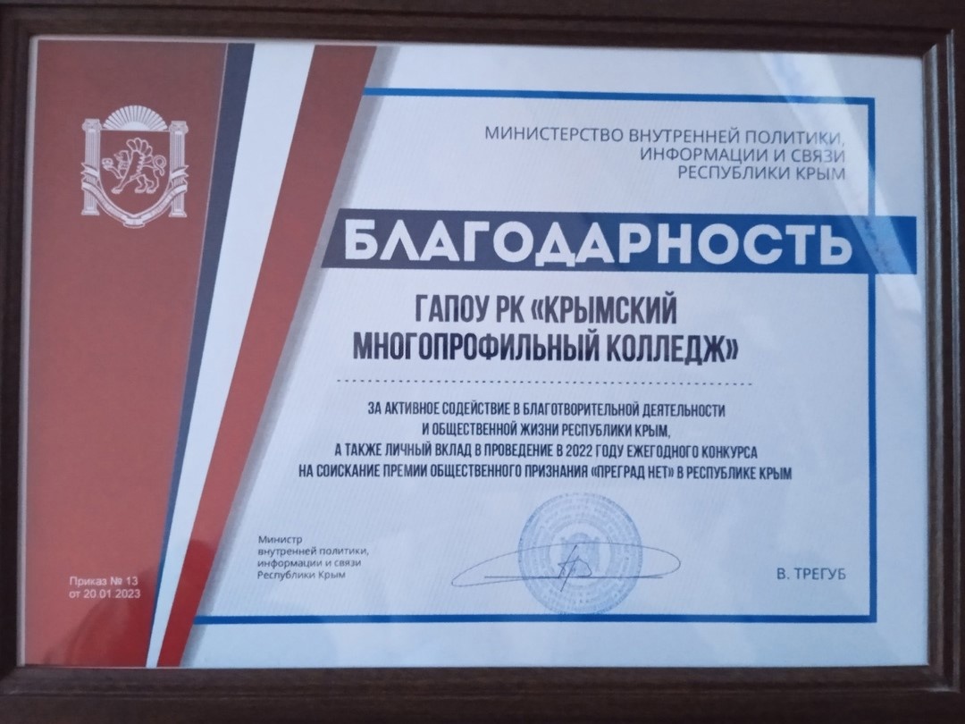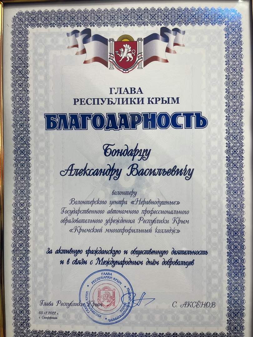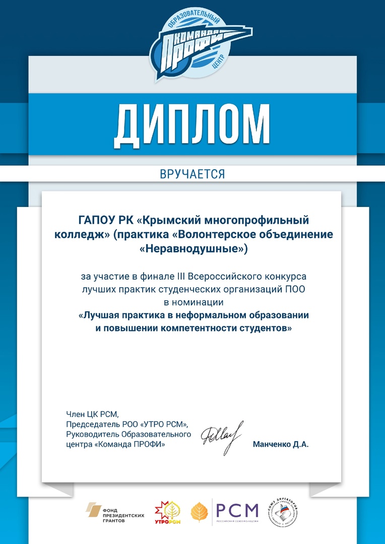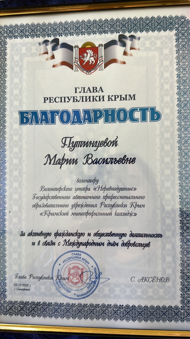 Добро.Центр «Неравнодушные» функционирует на базе ГАПОУ РК «Крымский многопрофильный колледж» с 2019 года. С 2019 г. по 2021 г. - добровольческое объединение. В 2021 г., по итогам Всероссийского конкурса лучших региональных практик поддержки волонтерства «Регион добрых дел», преобразован в Волонтерский центр. В 2023 г., по итогам Акселерационной программы «Ассоциации волонтерских центров», между колледжем и Ассоциацией Волонтерских Центров подписан лицензионный договор по открытию Добро.Центра. Добро.Центр ГАПОУ РК «Крымский многопрофильный колледж» «Неравнодушные» зарегистрировано на Федеральной платформе Добро.ру https://dobro.ru/organizations/10052135/info Волонтерское сопровождение более 40 мероприятий («Блокадный хлеб», мероприятий, посвященных Дню защитника Отечества, «Крымской весне»,в рамках "Дня единых действий" участие в торжественном возложении цветов на могиле Неизвестного солдата, показательного выступления юных брейкдансеров Симферополя, "Георгиевская ленточка" ,телемарафона «Za мир – без нацизма!», велопробега «Zа Победу», "Сад Памяти", субботник Старорусском кладбище, Парад Победы, онлайн-голосование ФКГС,II Международный бизнес-форум «Время для экспорта», Всероссийский полумарафон ЗаБег.РФ, День защиты детей, премии общественного признания «Преград нет – 2021/2022/2023/2024". Оказание помощи в сортировке, погрузке гуманитарной помощи апрель-май вовлеченность 32 человека, практически ежедневно.Оказание помощи вынужденным переселенцам из Херсонской области в г. Джанкой (вовлеченность 55 человек). Сбор гуманитарной помощи военнослужащим СВО более 2500 кг.