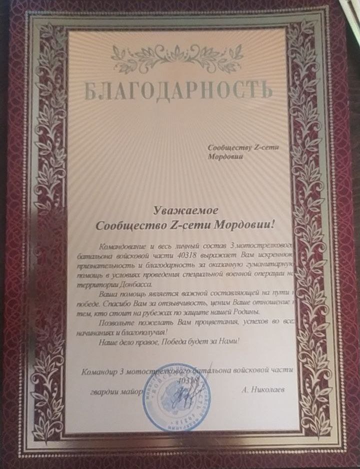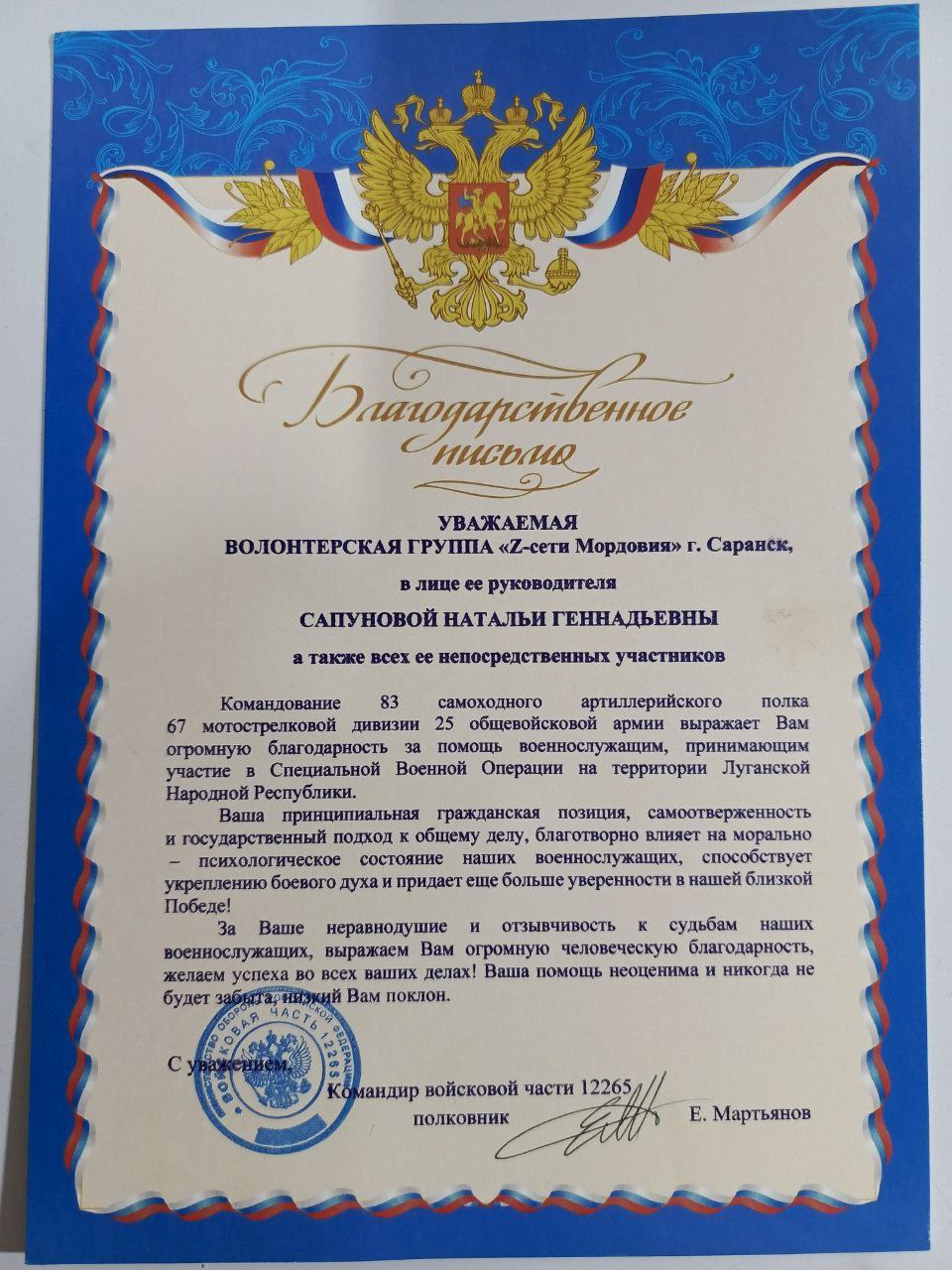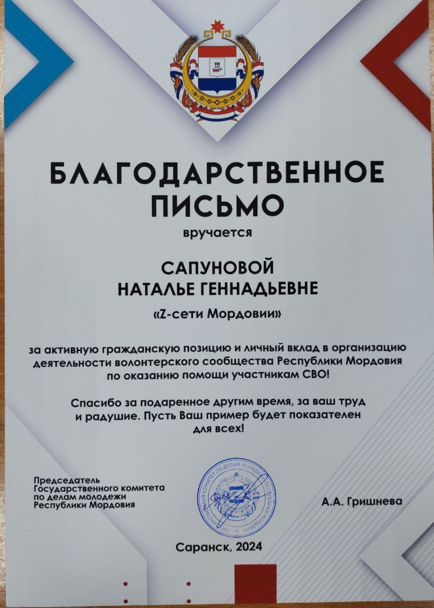 С 9.11.2022 Группа волонтеров СВО "Z - сети Мордовии", объединились для помощи нашим ребятам на передовой. С 9 ноября 2022 года я, Сапунова Наталья Геннадьевна, являюсь руководителем-куратором группы.