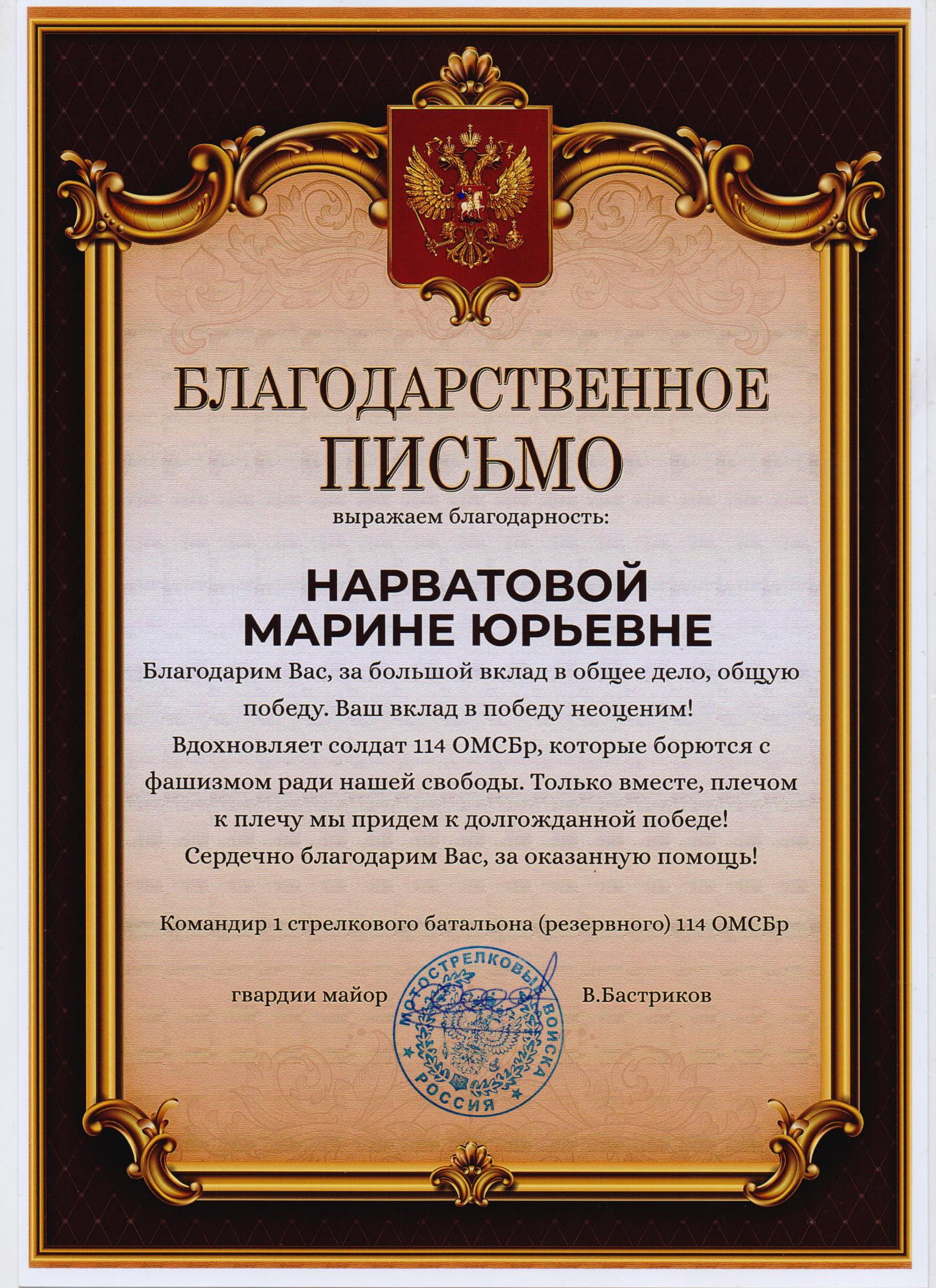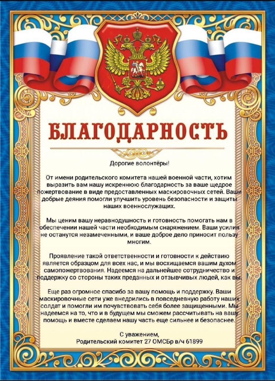 Каждый по возможности вносит свою лепту в нашу Победу и помогает ребятам ТАМ на передовой ВЫЖИТЬ. Моя задача состоит в том, чтобы искать спонсоров – благотворителей для закупки материалов.