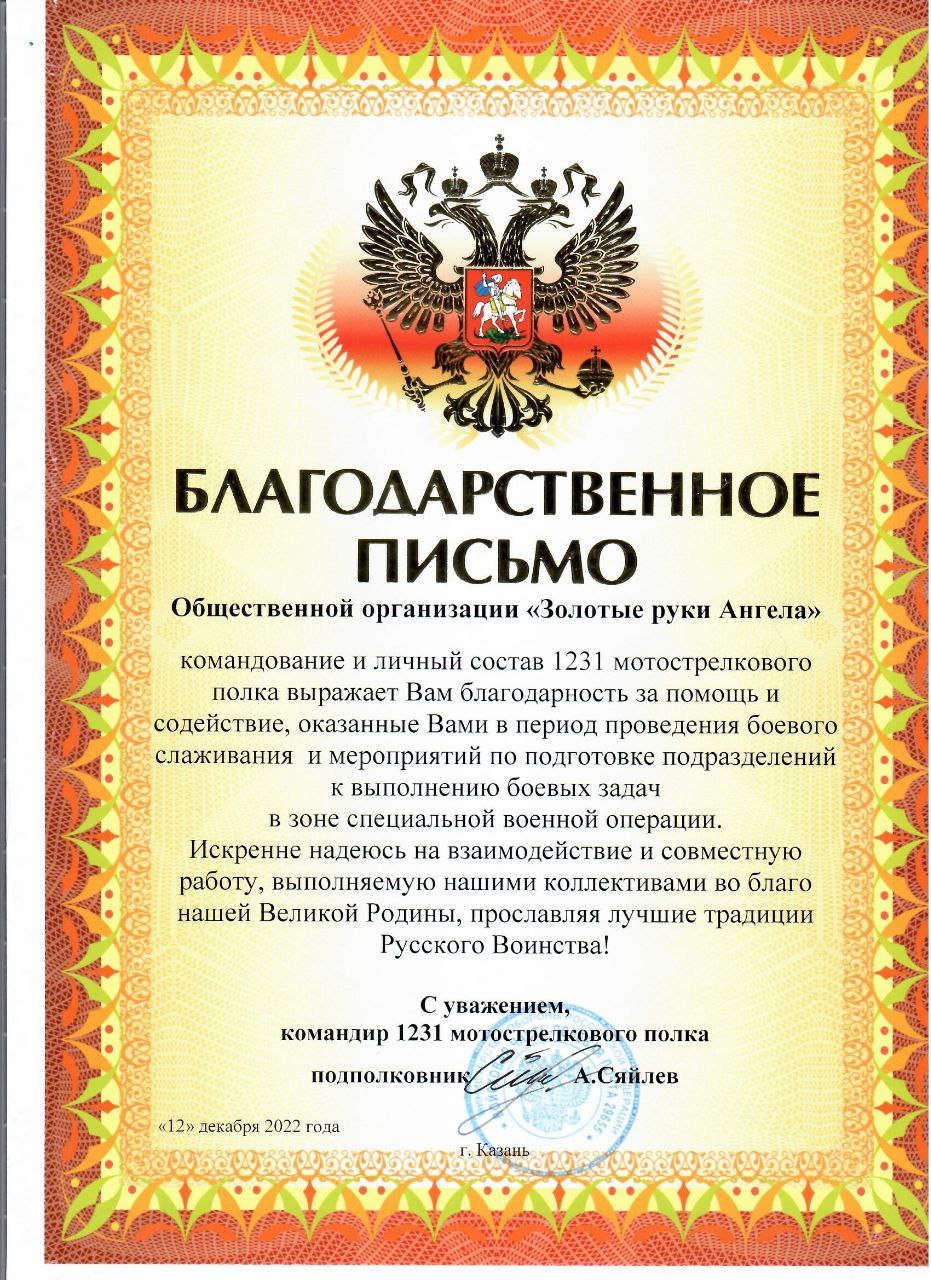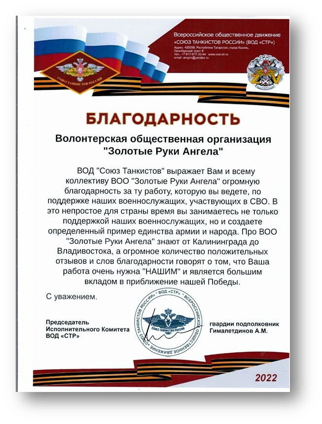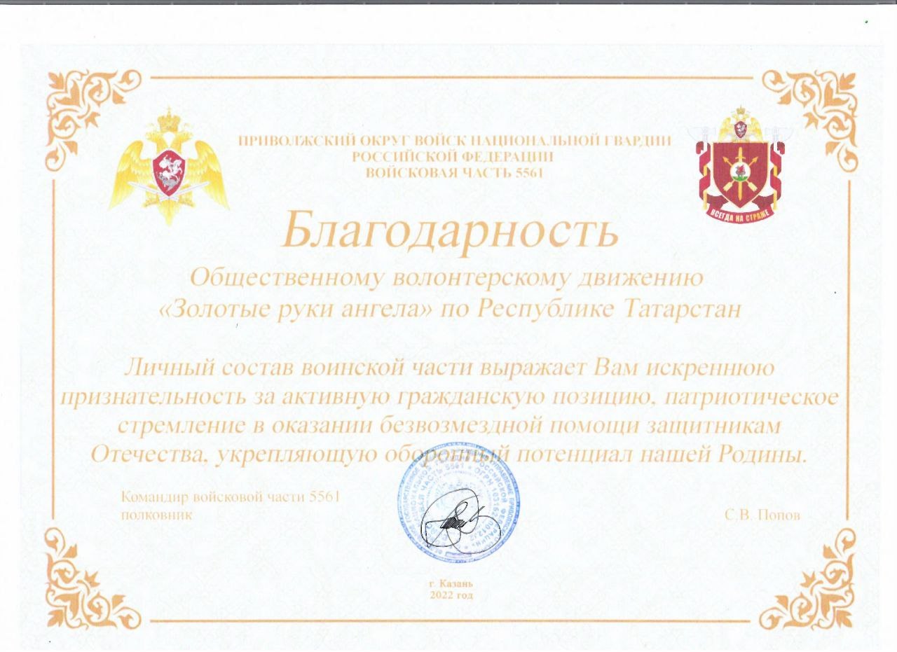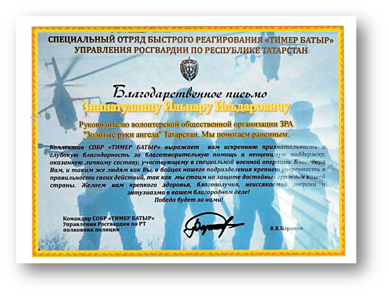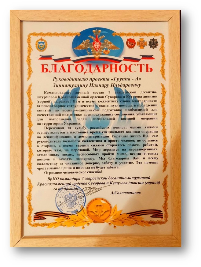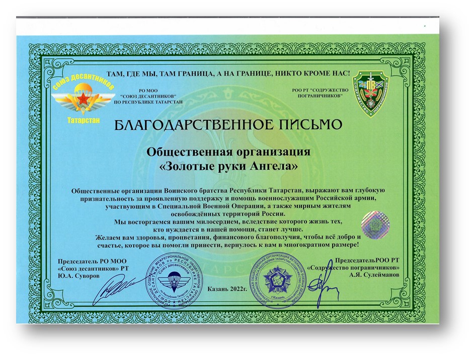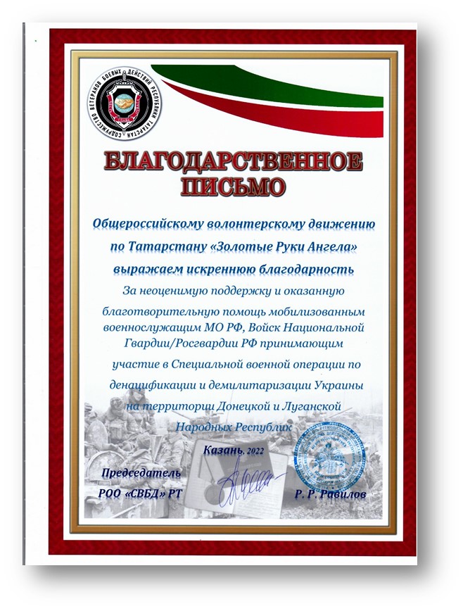 1. Создан центр сбора гуманитарной помощи в г. Казань. Налажена работа по доставке грузов в зону СВО.