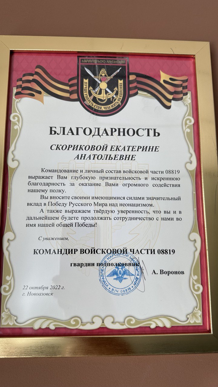Екатерина Анатольевна на постоянной основе с 29.08.2022 года лично сопровождает гуманитарный груз, доставляющийся на фуре, на освобожденные территории и передает гуманитарную помощь военным, в госпитали, а также мирным жителям. Поездки совершаются 2 раза в месяц.