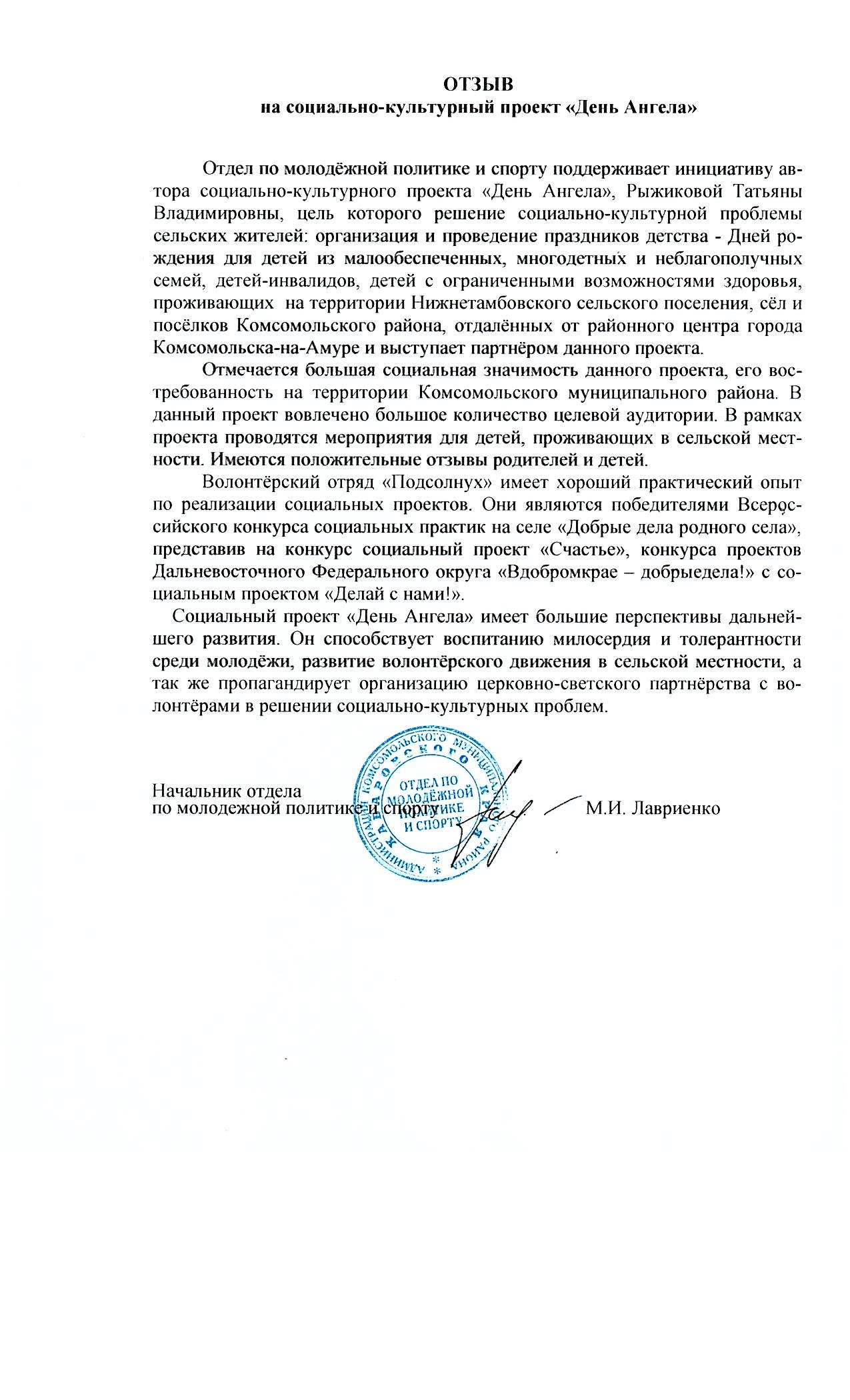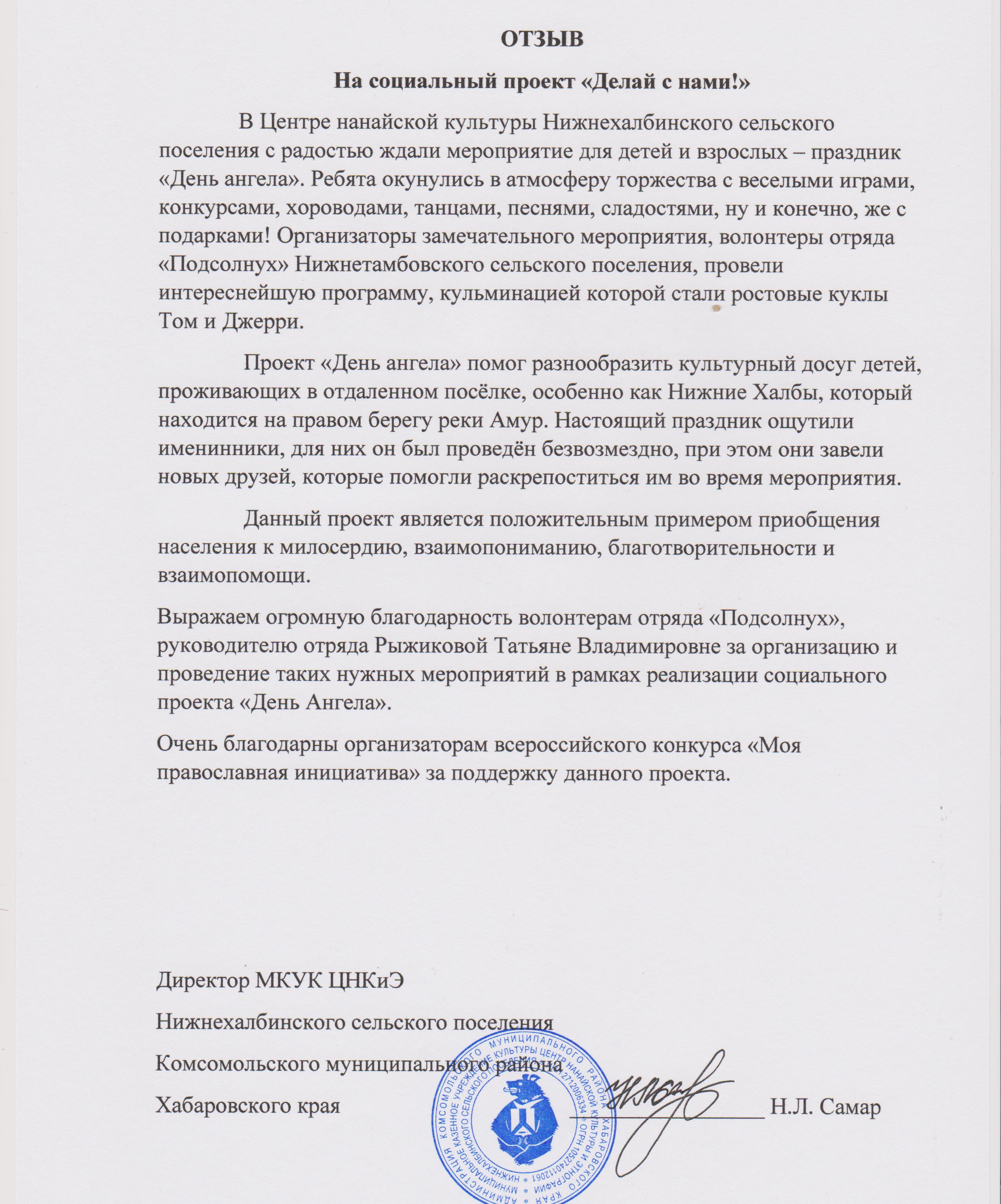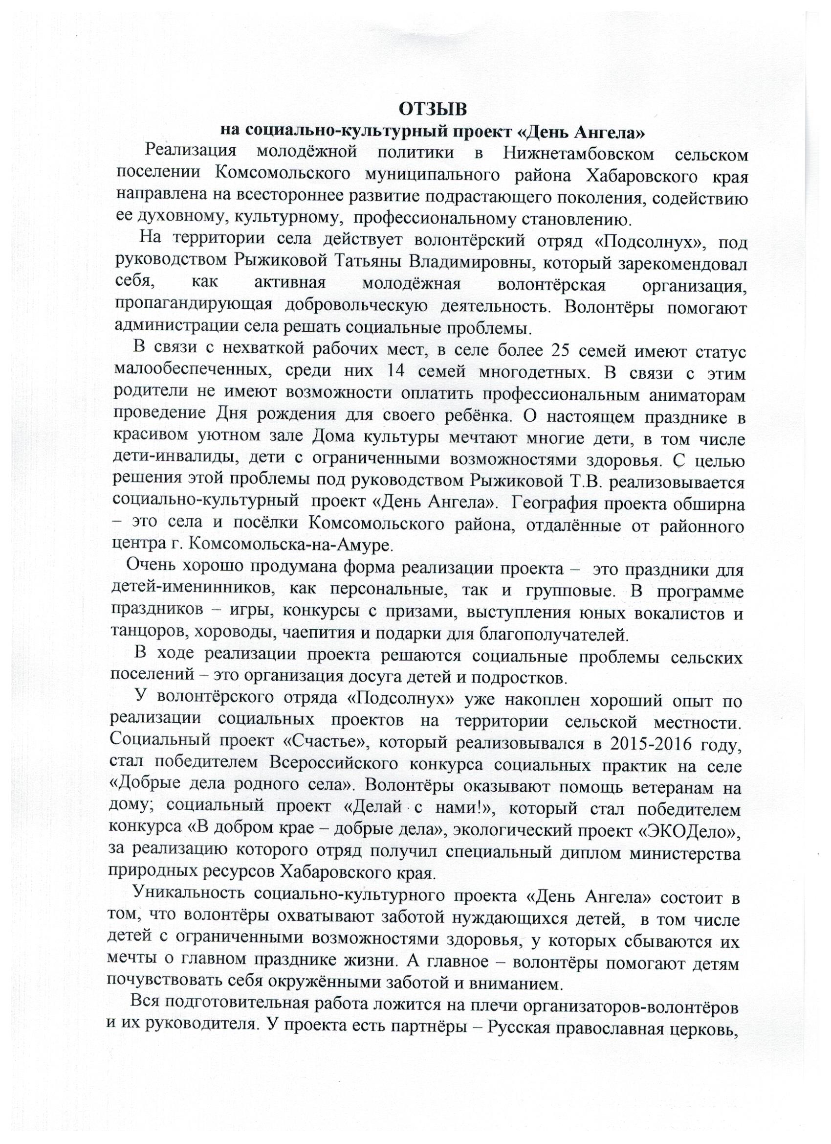 Проект решает конкретную проблему: Нижнетамбовское сельское поселение и другие сёла района находятся далеко от районного центра г. Комсомольска-на-Амуре. Из-за критического финансового положения (не хватает рабочих мест) стало большой проблемой для родителей - культурно и интересно провести День рождения ребёнка. Особенно эта проблема коснулась детей из многодетных, малообеспеченных семей, семей, находящихся в социально-опасном положении, в том числе детей-инвалидов, детей с ОВЗ. Из года в год дети, проживающие в сельской местности, нуждаются в настоящем празднике с приглашением друзей, подарками, играми, конкурсами, чаепитием. Проблему озвучил пятилетний ребёнок, который был приглашён на День рождения друга из состоятельной семьи. Праздник был проведён в Доме культуры, который предоставляет платные услуги аренды помещения и работы аниматоров. Мальчик из малообеспеченной семьи сказал такие слова: "А у меня такого Дня рождения никогда не будет..." . Мы провели мониторинг в своём селе и в соседних сёлах и выяснили, что из 100 опрошенных семей только 30% могут позволить себе провести настоящий День рождения для ребёнка, воспользовавшись платными услугами Домов культуры. Остальные семьи не имеют финансовой возможности. Убедившись в актуальности и важности данной проблемы для нашего села и других сельских поселений, мы разработали данный проект "День Ангела". Наш проект решает проблему отдалённых от города сельских поселений по организации досуга детей и подростков, а именно организация и проведение яркого, весёлого, необычного главного праздника жизни – Дня рождения для детей. Проект реализуется волонтёрским отрядом "Подсолнух", действующий на территории Нижнетамбовского сельского поселения, который зарекомендовал себя в Российской Федерации, как активная молодёжная волонтёрская организация, пропагандирующая добровольческую деятельность на сельских территориях, активно работающая в разных направлениях. Среди волонтёров очень много способных детей, для которых данный проект - одна из возможностей проявить свои творческие способности, поделиться своим опытом с другими. Для решения социально-культурных проблем поселков отдаленных от культурного центра, в рамках проекта разработаны праздники для детей на тему "День Ангела", в том числе выездные. В социальных сетях, районной газете "Приамурье" размещены объявления о предоставлении данной услуги населению Комсомольского района на благотворительной основе. В программе - персональные и групповые поздравления, игры, конкурсы, номера художественной самодеятельности, чаепитие, подарки.В ходе реализации проекта волонтёры выступают в роли аниматоров. Каждый волонтёр имеет творческие способности в разных направлениях, имеет хороший опыт в проведении мероприятий для детей и чётко знает свои обязанности. Есть волонтёры, специально обученные работать ростовыми куклами. В команде есть специалисты ди-джеи.
