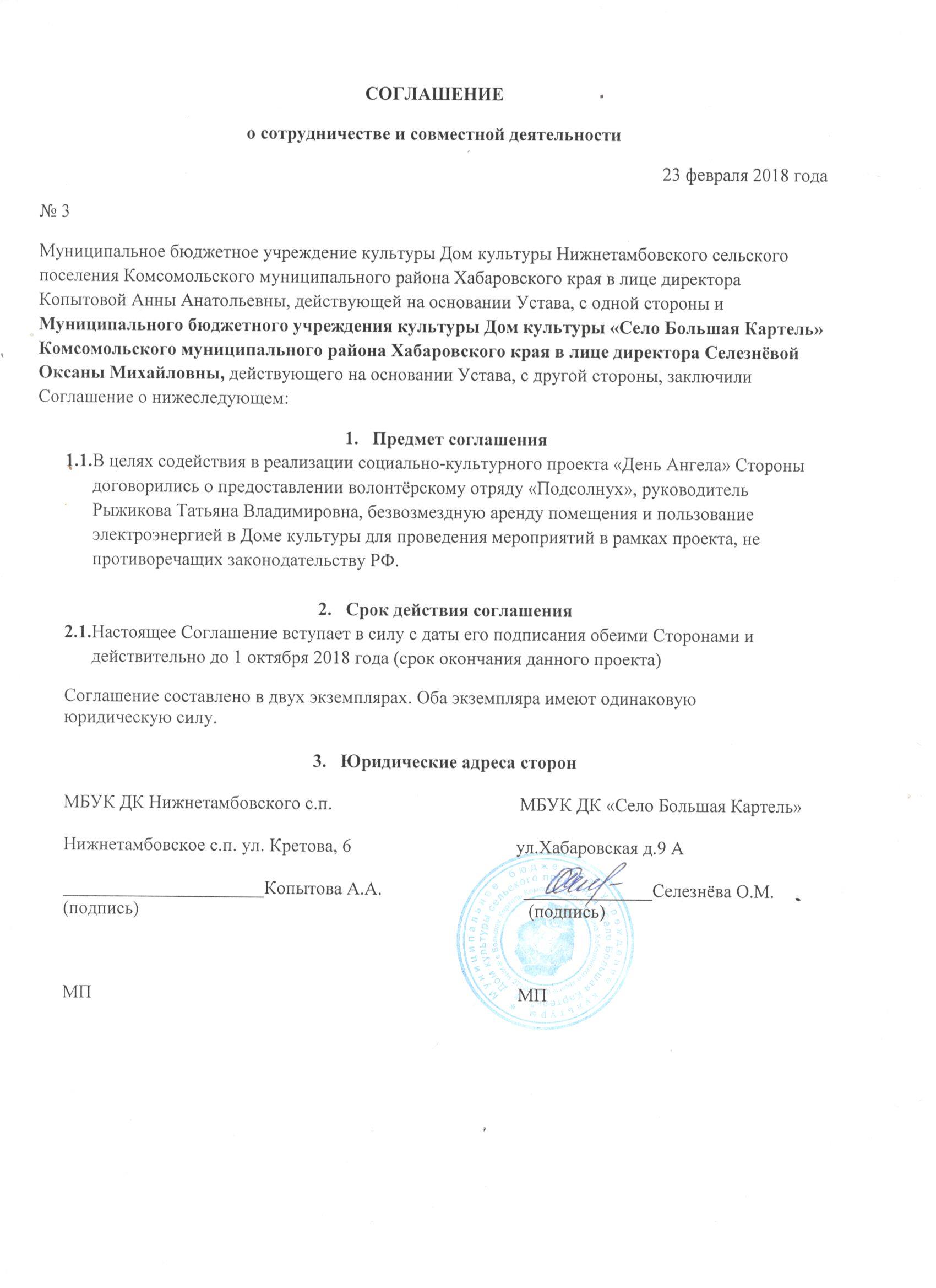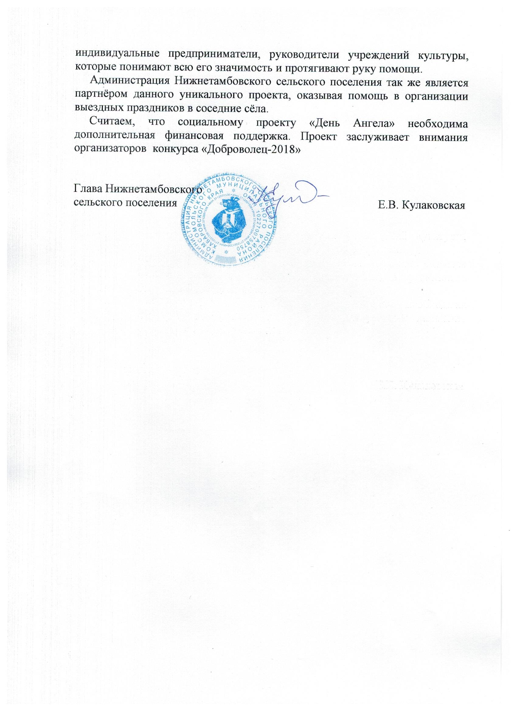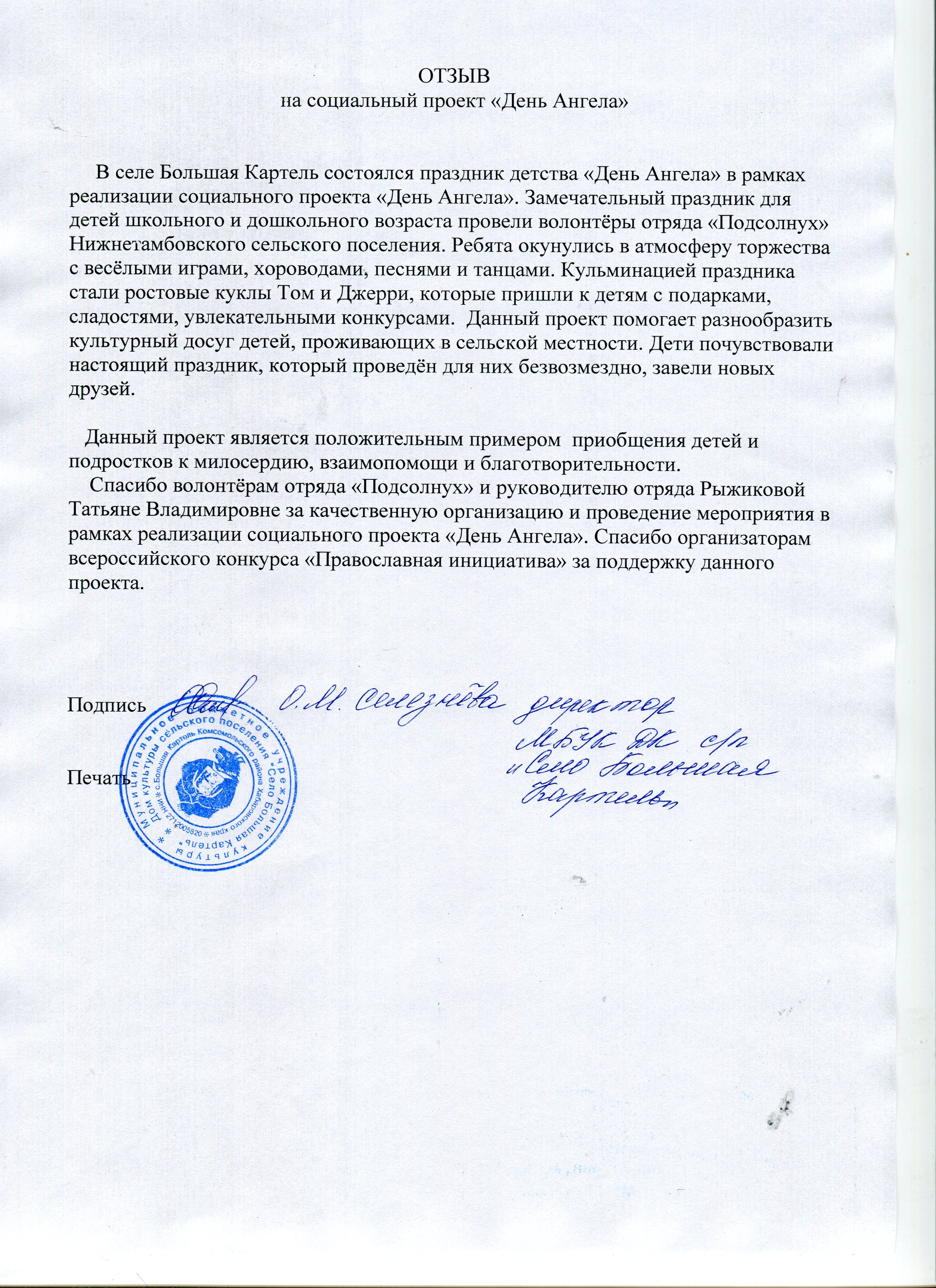 Проект решает конкретную проблему: Нижнетамбовское сельское поселение и другие сёла района находятся далеко от районного центра г. Комсомольска-на-Амуре. Из-за критического финансового положения (не хватает рабочих мест) стало большой проблемой для родителей - культурно и интересно провести День рождения ребёнка. Особенно эта проблема коснулась детей из многодетных, малообеспеченных семей, семей, находящихся в социально-опасном положении, в том числе детей-инвалидов, детей с ОВЗ. Из года в год дети, проживающие в сельской местности, нуждаются в настоящем празднике с приглашением друзей, подарками, играми, конкурсами, чаепитием. Проблему озвучил пятилетний ребёнок, который был приглашён на День рождения друга из состоятельной семьи. Праздник был проведён в Доме культуры, который предоставляет платные услуги аренды помещения и работы аниматоров. Мальчик из малообеспеченной семьи сказал такие слова: "А у меня такого Дня рождения никогда не будет..." . Мы провели мониторинг в своём селе и в соседних сёлах и выяснили, что из 100 опрошенных семей только 30% могут позволить себе провести настоящий День рождения для ребёнка, воспользовавшись платными услугами Домов культуры. Остальные семьи не имеют финансовой возможности. Убедившись в актуальности и важности данной проблемы для нашего села и других сельских поселений, мы разработали данный проект "День Ангела". Наш проект решает проблему отдалённых от города сельских поселений по организации досуга детей и подростков, а именно организация и проведение яркого, весёлого, необычного главного праздника жизни – Дня рождения для детей. Проект реализуется волонтёрским отрядом "Подсолнух", действующий на территории Нижнетамбовского сельского поселения, который зарекомендовал себя в Российской Федерации, как активная молодёжная волонтёрская организация, пропагандирующая добровольческую деятельность на сельских территориях, активно работающая в разных направлениях. Среди волонтёров очень много способных детей, для которых данный проект - одна из возможностей проявить свои творческие способности, поделиться своим опытом с другими. Для решения социально-культурных проблем поселков отдаленных от культурного центра, в рамках проекта разработаны праздники для детей на тему "День Ангела", в том числе выездные. В социальных сетях, районной газете "Приамурье" размещены объявления о предоставлении данной услуги населению Комсомольского района на благотворительной основе. В программе - персональные и групповые поздравления, игры, конкурсы, номера художественной самодеятельности, чаепитие, подарки.В ходе реализации проекта волонтёры выступают в роли аниматоров. Каждый волонтёр имеет творческие способности в разных направлениях, имеет хороший опыт в проведении мероприятий для детей и чётко знает свои обязанности. Есть волонтёры, специально обученные работать ростовыми куклами. В команде есть специалисты ди-джеи.