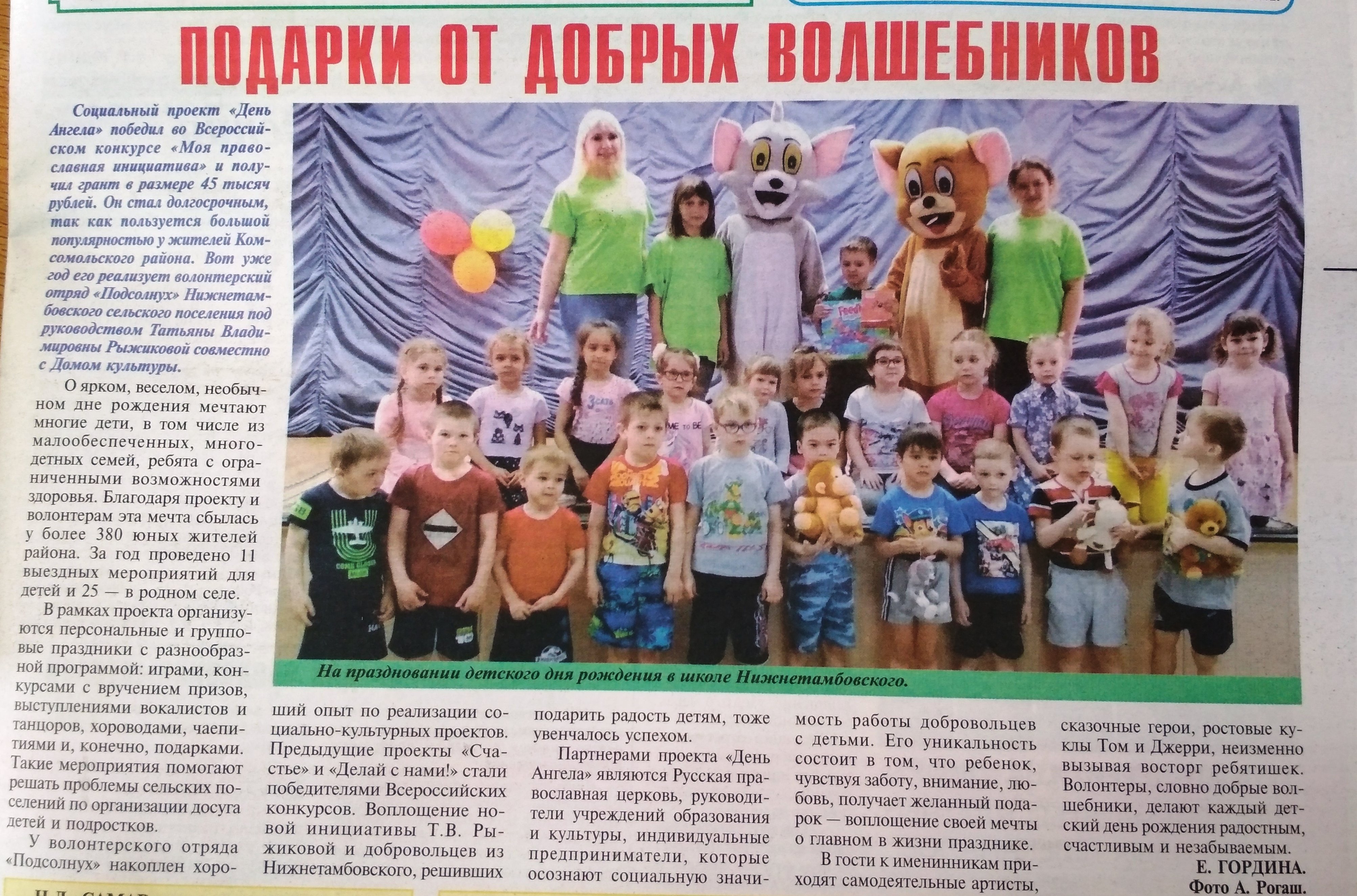 Дни рождения проводятся и будут проведены без финансовых затрат со стороны родителей. Проект "День Ангела" дарит радость нуждающимся детям, которые давно мечтали о празднике. Благодаря проекту и волонтёрам эта мечта сбылась у более 550 юных жителей Комсомольского муниципального района. В рамках проекта проведено 11 выездных мероприятий для детей и 26 в родном селе. Дети 8 отдалённых посёлков Комсомольского района уже почувствовали заботу и внимание волонтёров, получили настоящий праздник с концертными номерами, играми, конкурсами, хороводами, чаепитием в свой День Ангела, а так же подарки на память.