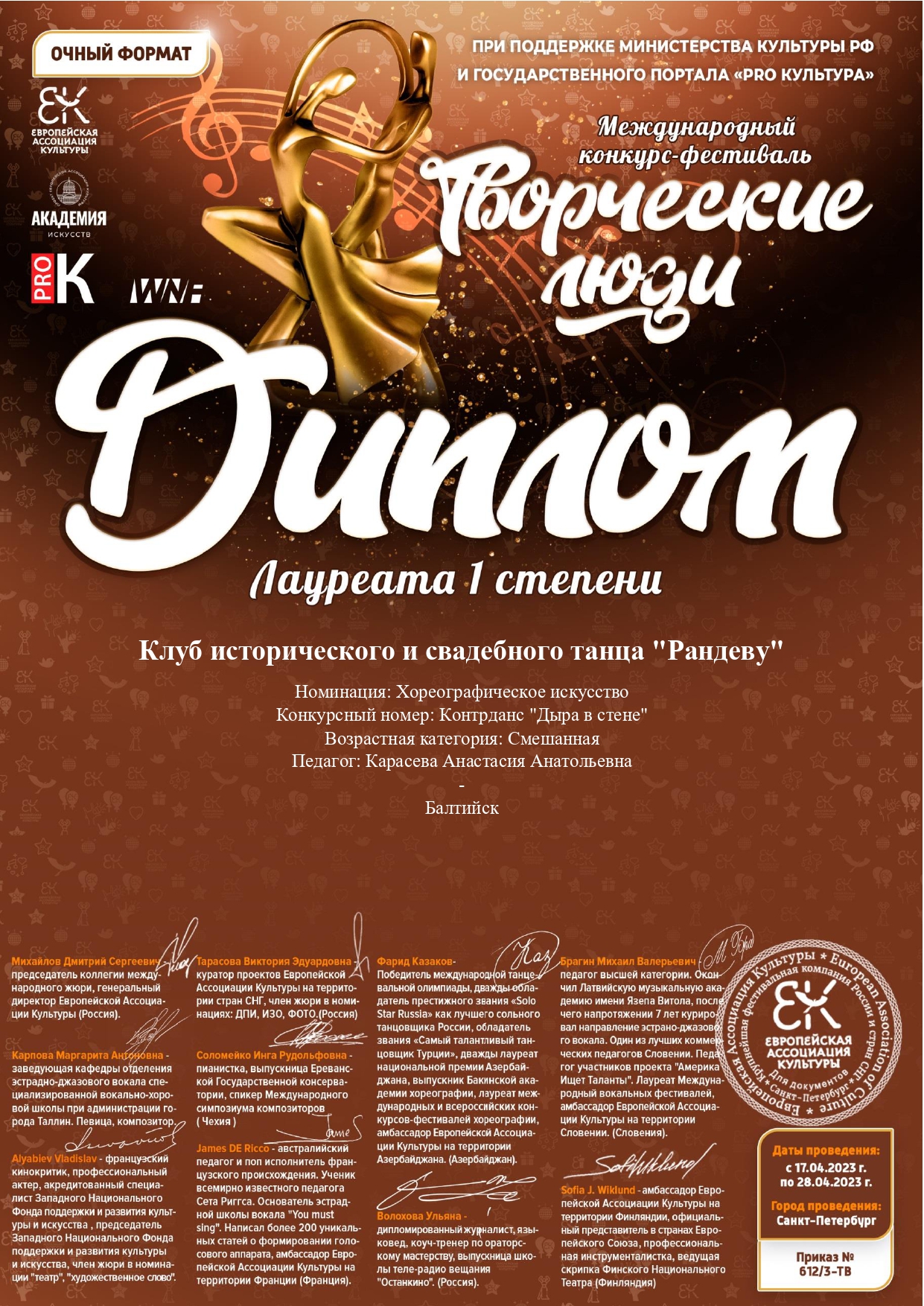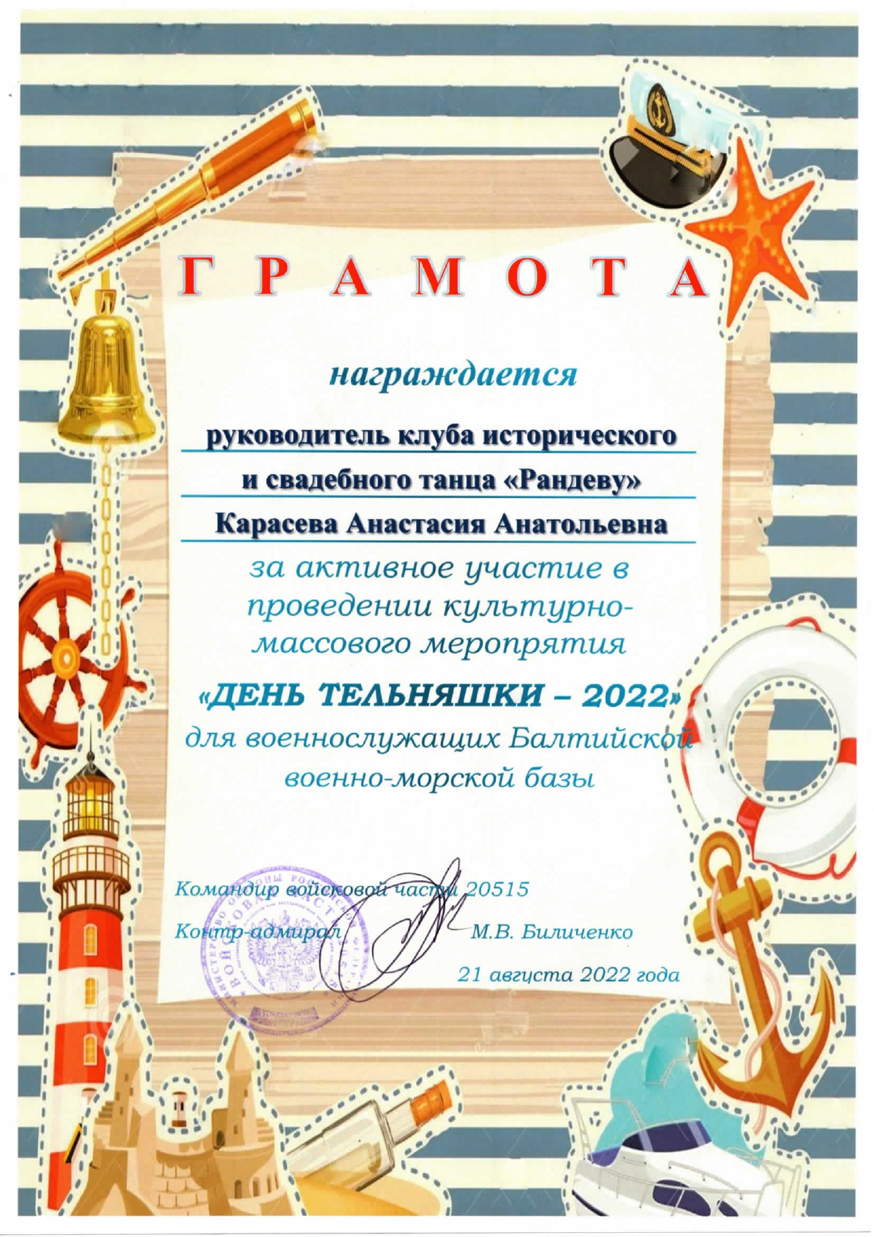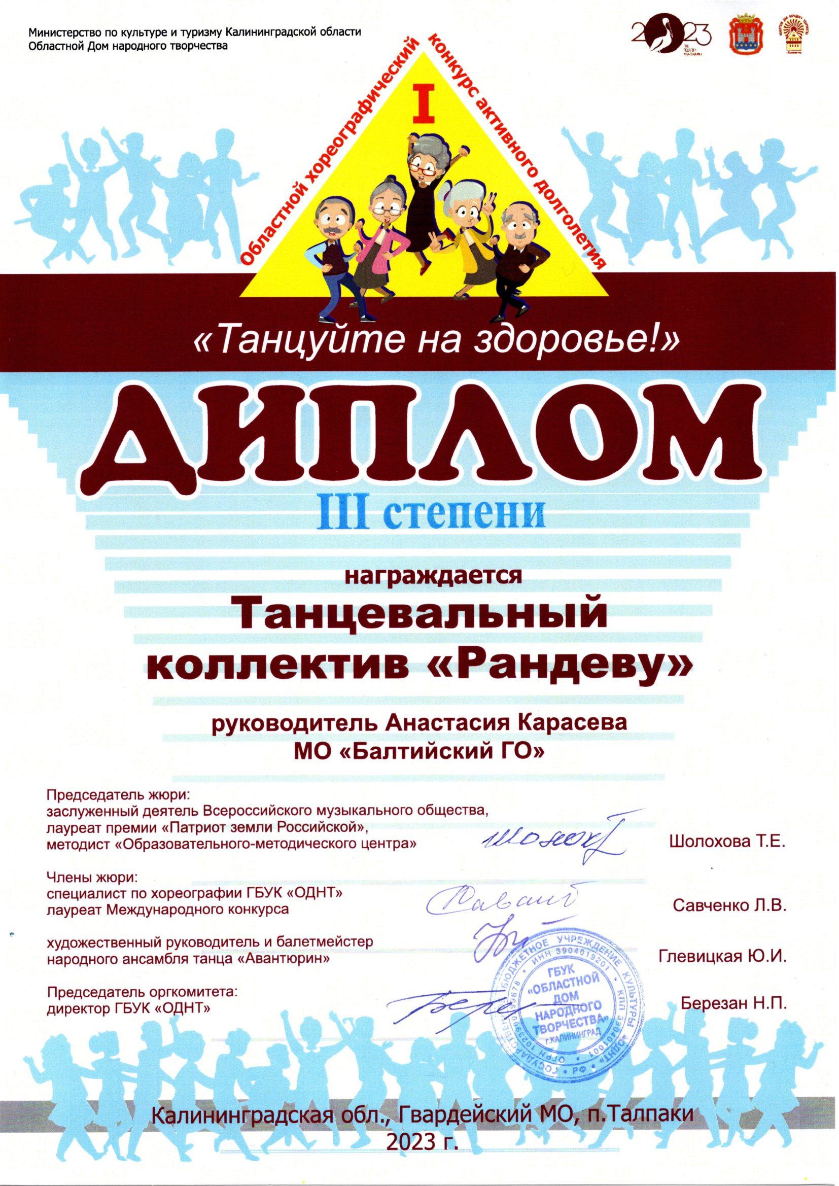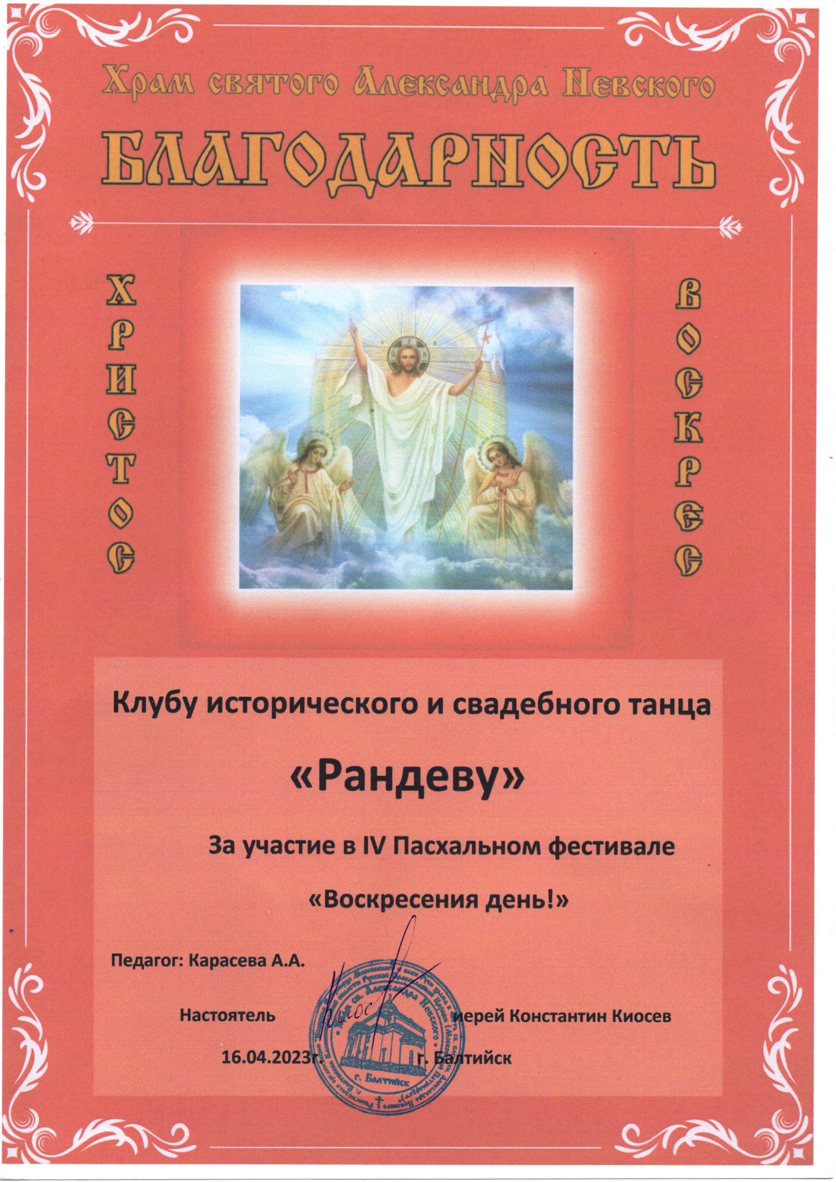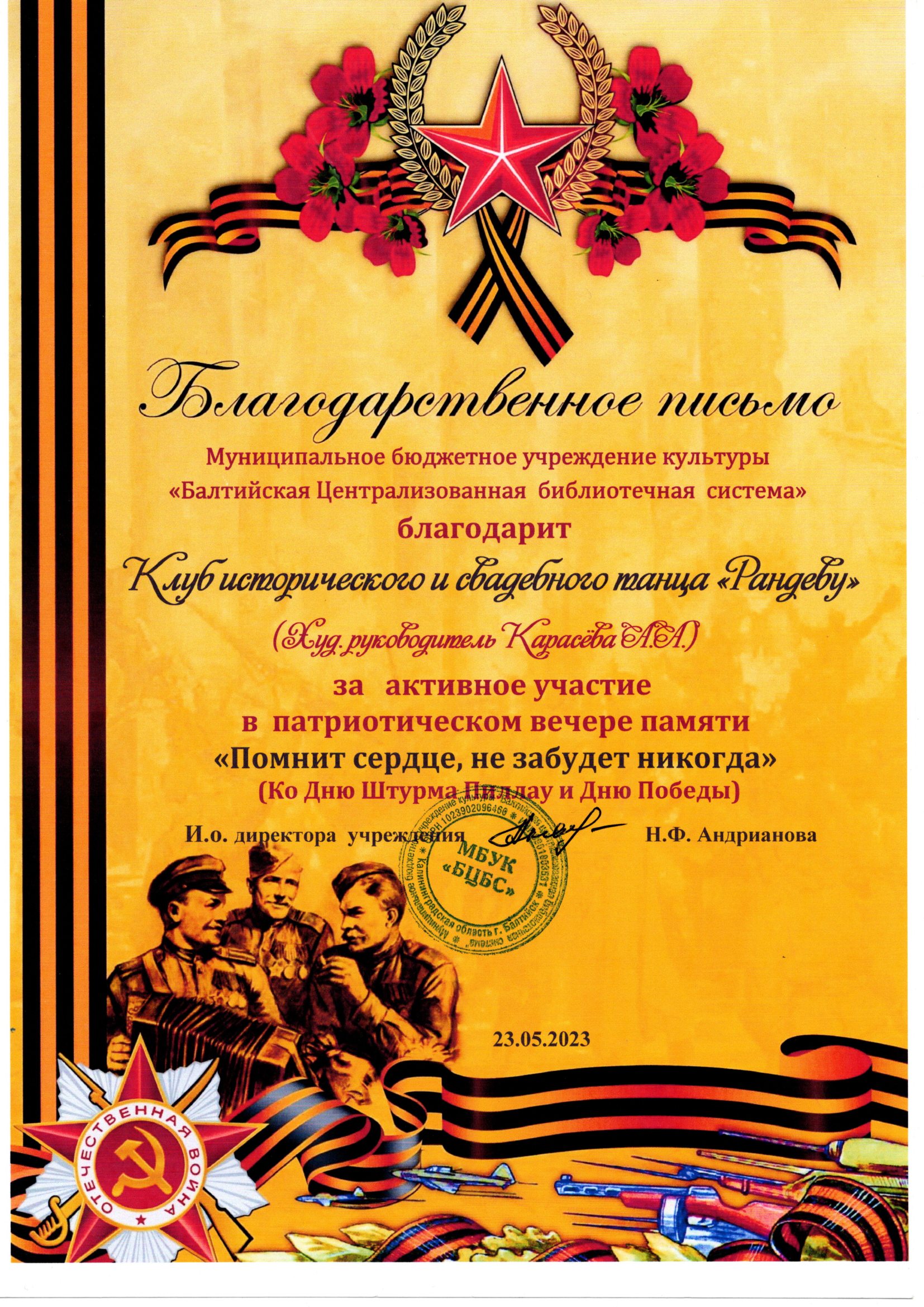 В 2022 году танцплощадка "Рандеву" в Балтийске проходила с мая по сентябрь на уличных площадках: перед Домом офицеров Балтийского гарнизона, перед памятником Петру Великому во Внутренней гавани, на площади Балтийской славы по воскресеньям. Вход свободный, танцы в программе: с 15 по 20 века. Осуществлялась поддержка со стороны Дома офицеров в части оборудования и ведущих. Перед проведением мероприятий проводились подготовительные занятия в рамках деятельности клуба исторического и свадебного танца "Рандеву". Количество участников около 92 (взрослые и дети), зрителей около 309. https://vk.com/rendevukgd_open. В 2023 году открытие танцплощадки прошло 9 мая на майских праздниках, посвящённых Великой Победе, в котором приняли участие, в общей сложности, порядка 25 человек (4 ребенка, 6 гостей, в т.ч. из Москвы, 19 взрослых). Также в рамках уличных мероприятий проводится Ежегодный Бал семьи, любви и верности (https://vk.com/event213735651), который помогает распространить русские праздники, укрепить семейные отношения, традиционные ценности.