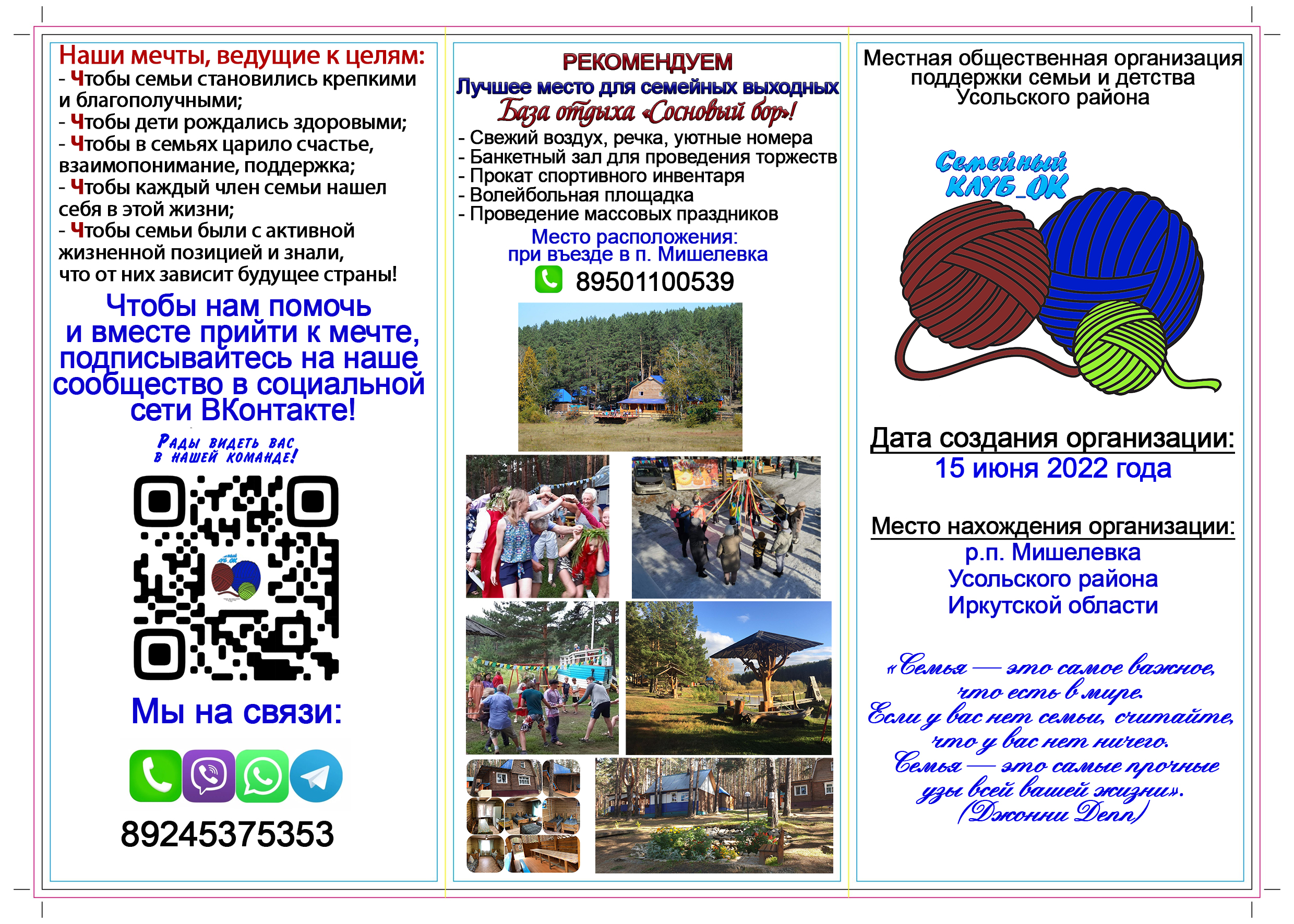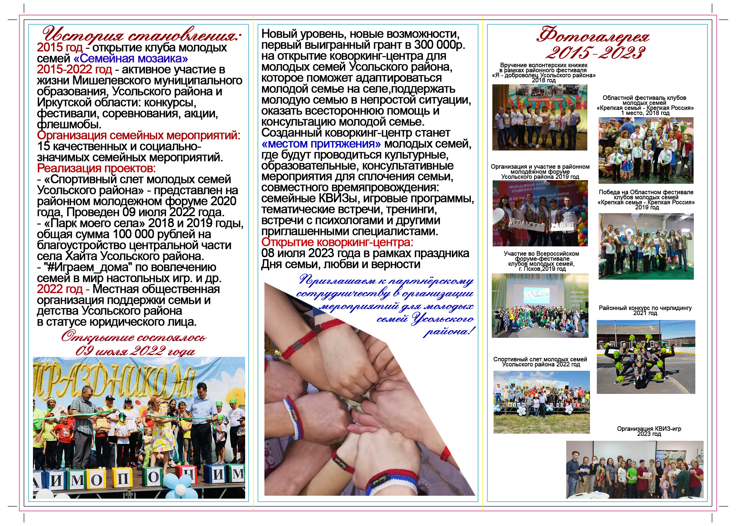 С 2015 года на территории Усольского района свою активную деятельность вел клуб молодых семей «Семейная мозаика». Реализовывая свои идеи, проекты, команда стала задумываться над официальным созданием семейной организации. Толчком стало участие семей на Всероссийском форуме молодых семей в 2019 году в Псковской области. Результат – Местная общественная организация поддержки семьи и детства Усольского района в статусе юридического лица. Новый уровень и новые возможности.