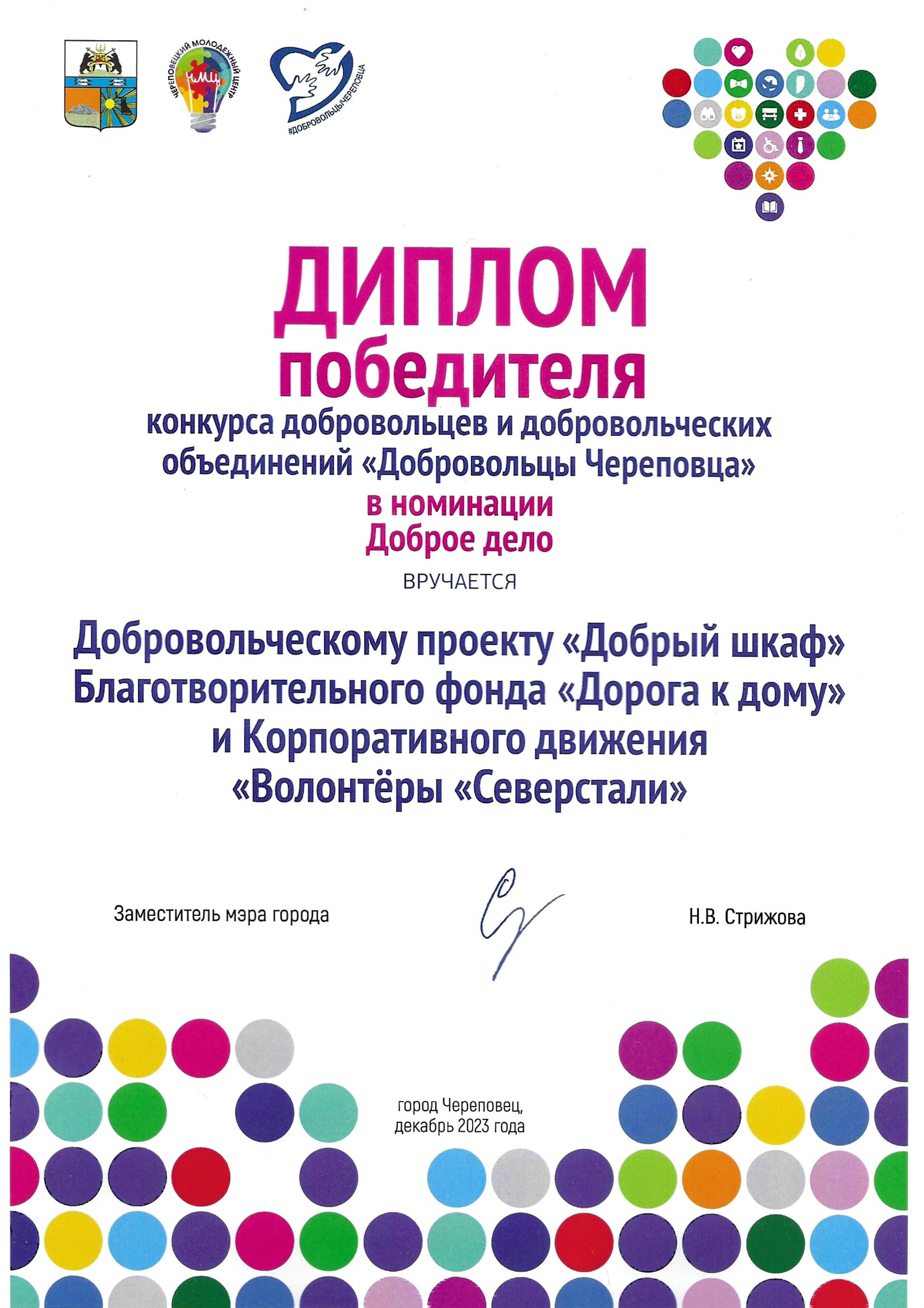 Проект "Добрый шкаф" реализуется добровольческим центром благотворительного фонда "Дорога к дому", волонтерами компании "Северсталь" и неравнодушными горожанами. Направлен на помощь семьям с детьми в трудной жизненной ситуации, нуждающихся в одежде. На базе фонда организовано специальное помещение, где подопечные могут выбрать в комфортных условиях себе необходимую одежду и обувь. Горожане приносят вещи в фонд и по мере поступления вещей волонтеры осуществляют выходы для их разбора. Добровольцы осматривают вещи на возможность дальнейшего использования (без пятен и дыр), сортируют, отпаривают и развешивают по категориям (мужское, женское, детское).
