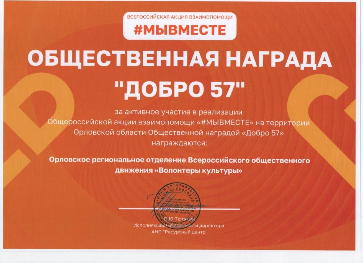 - 2356 добровольцев из Орловской области зарегистрировано на сайте “Добро.ру. Волонтеры культуры”, все добровольцы имеют электронные волонтерские книжки.
