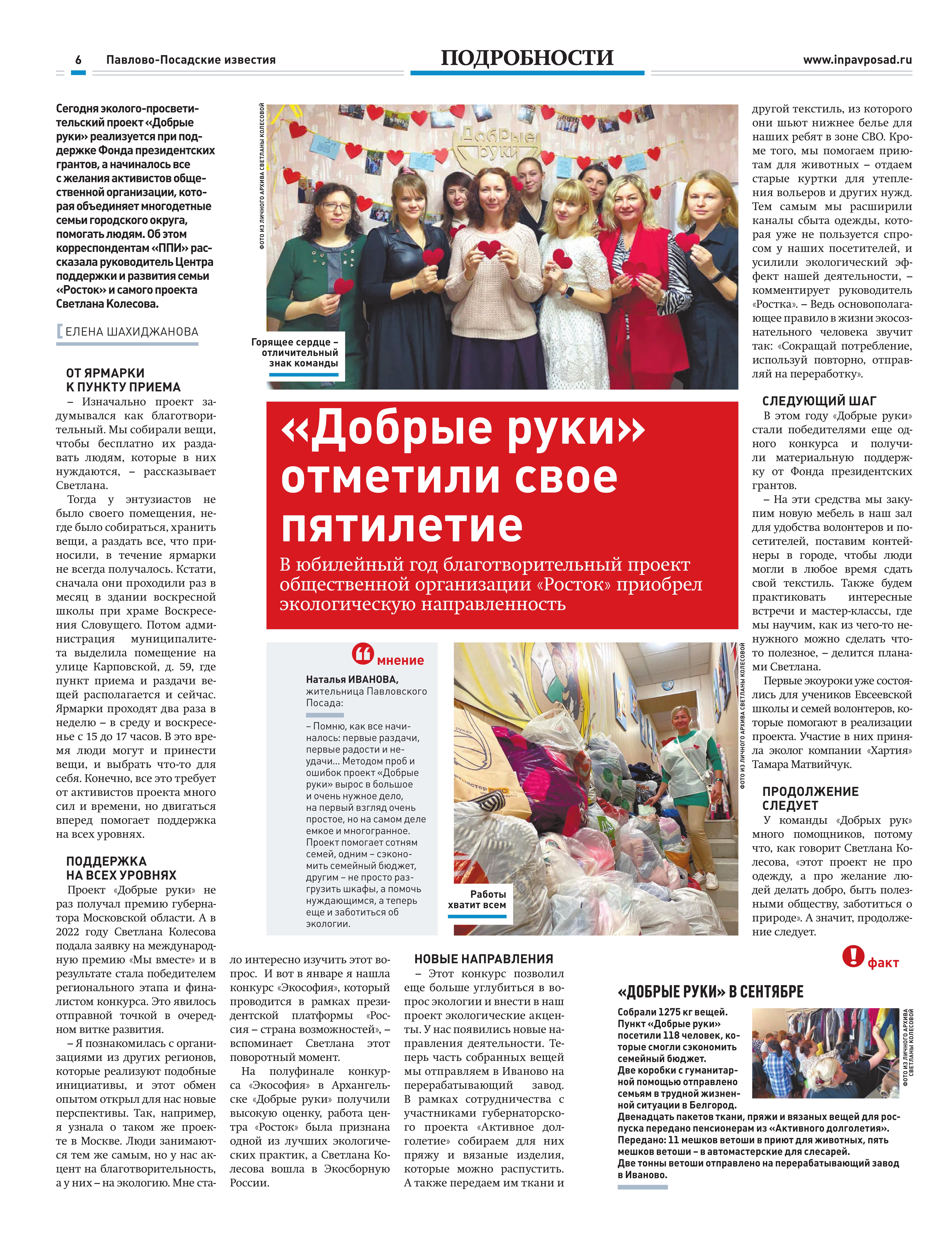 В 2021 году администрация г. Павловский Посад выделила помещение, где проект стал работать на регулярной основе, что существенно способствовало дальнейшему развитию проекта. Сейчас «Добрые руки» - это пункт сбора и перераспределения ненужного текстиля на повторное использование и переработку. В свои задачи мы добавили и экологическое просвещение жителей.