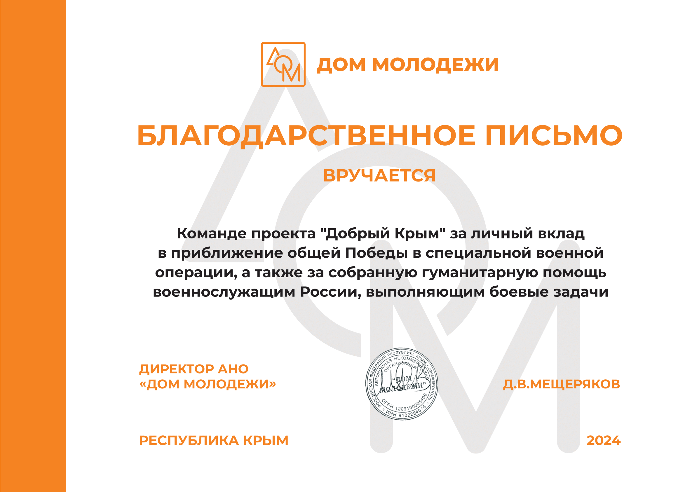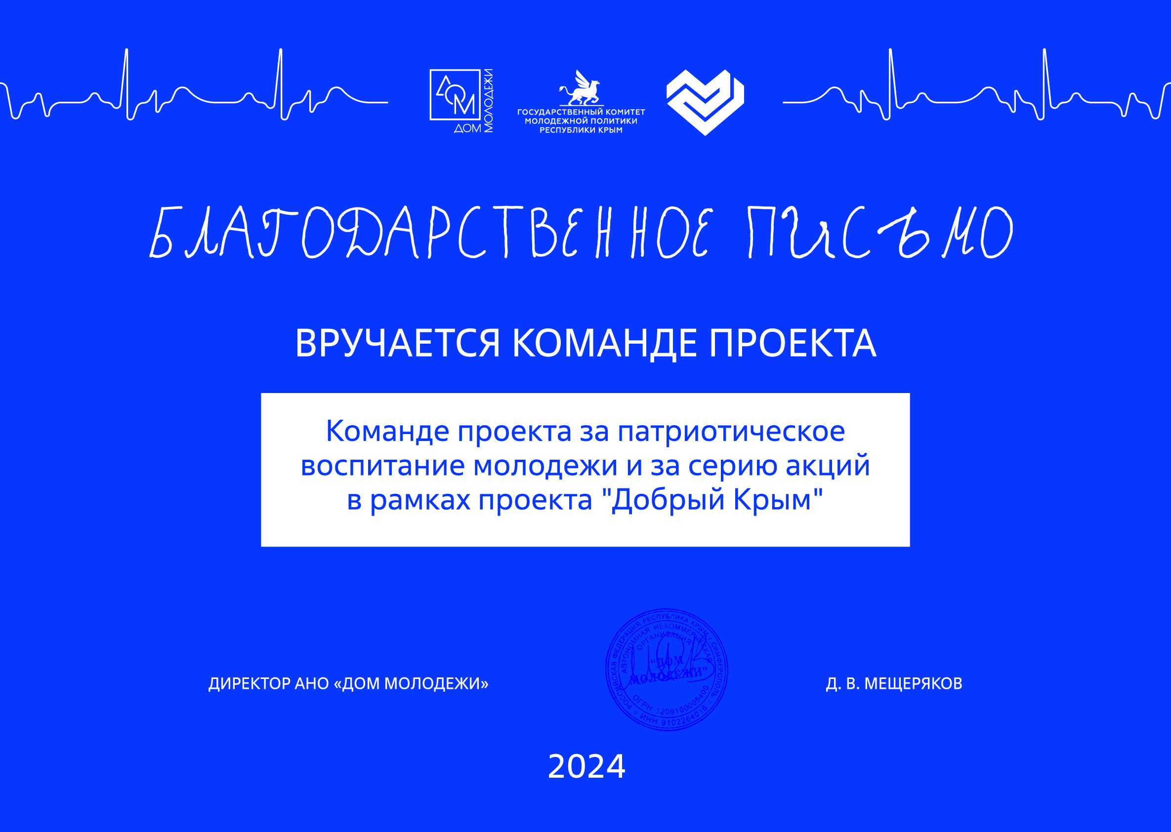 За два года существования проекта было охвачено 1300 участников проекта в возрасте от 12 до 55 лет. Было выполнено больше 500 добрых дел различной волонтерской направленности. Было направлено 25 кг одежды в социальные фонды Крыма для нуждающихся и в ПВР, где размещены, более 300 кг гуманитарной помощи было направлено в зону проведения СВО.