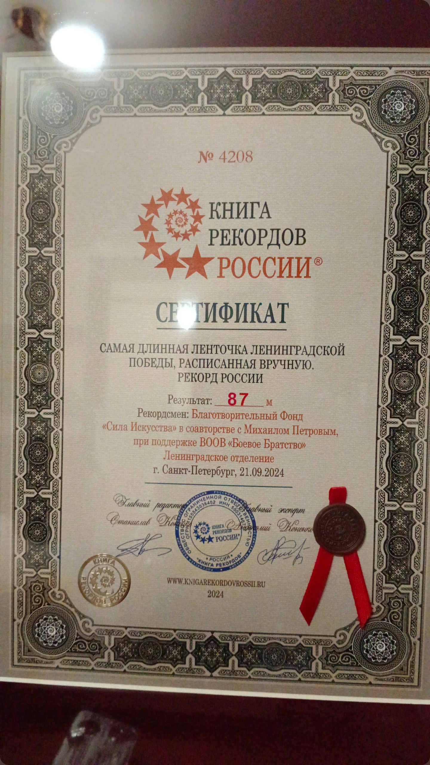 21 сентября 2024 года мы установили рекорд и длина ленты оказалась 87м 2 см. На мероприятии присутствовали 300 волонтеров, 10 представителей СМИ и герой России.